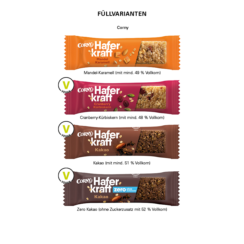 Corny Haferkraft Riegel im Werbeschuber aus weißem Karton, individuell bedruckt. Inhalt: 1 Corny Haferkraft Riegel mit mind. 49% Vollkorn, Sorte Mandel-Karamell, 35 g