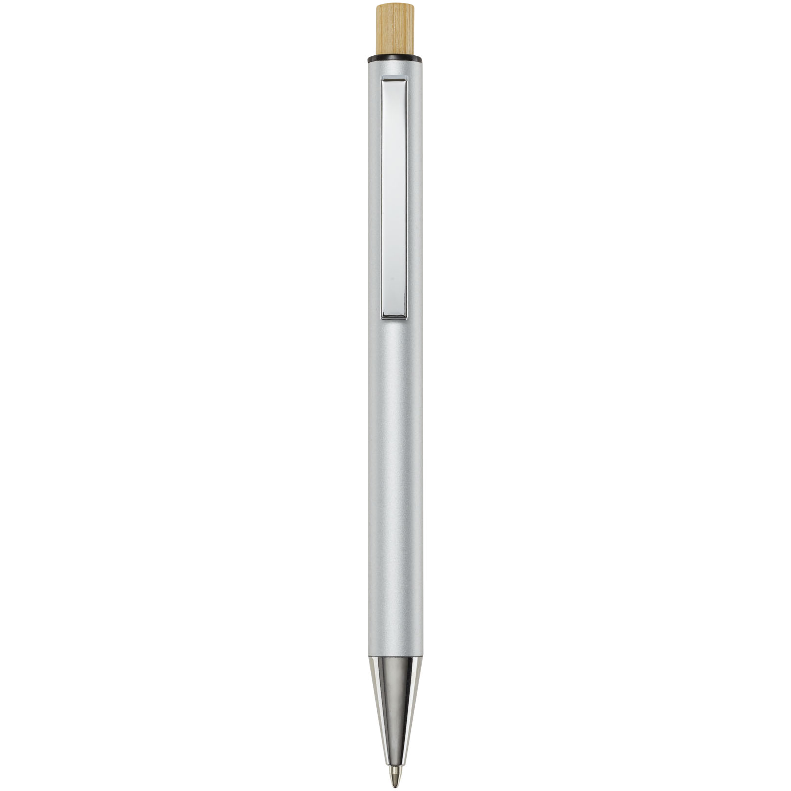 Der Cyrus Kugelschreiber ist aus recyceltem Aluminium hergestellt, was weniger Energie benötigt als die Herstellung von Aluminium aus Rohstoffen. Es reduziert außerdem die Abfallmenge auf Mülldeponien und trägt dazu bei, natürliche Ressourcen zu schonen und Treibhausgasemissionen zu reduzieren. Druckknopf ist aus Bambus gefertigt. Tintenfarbe: Blau. Schreiblänge: 800 Meter. Spitzengröße: 1,00 mm.