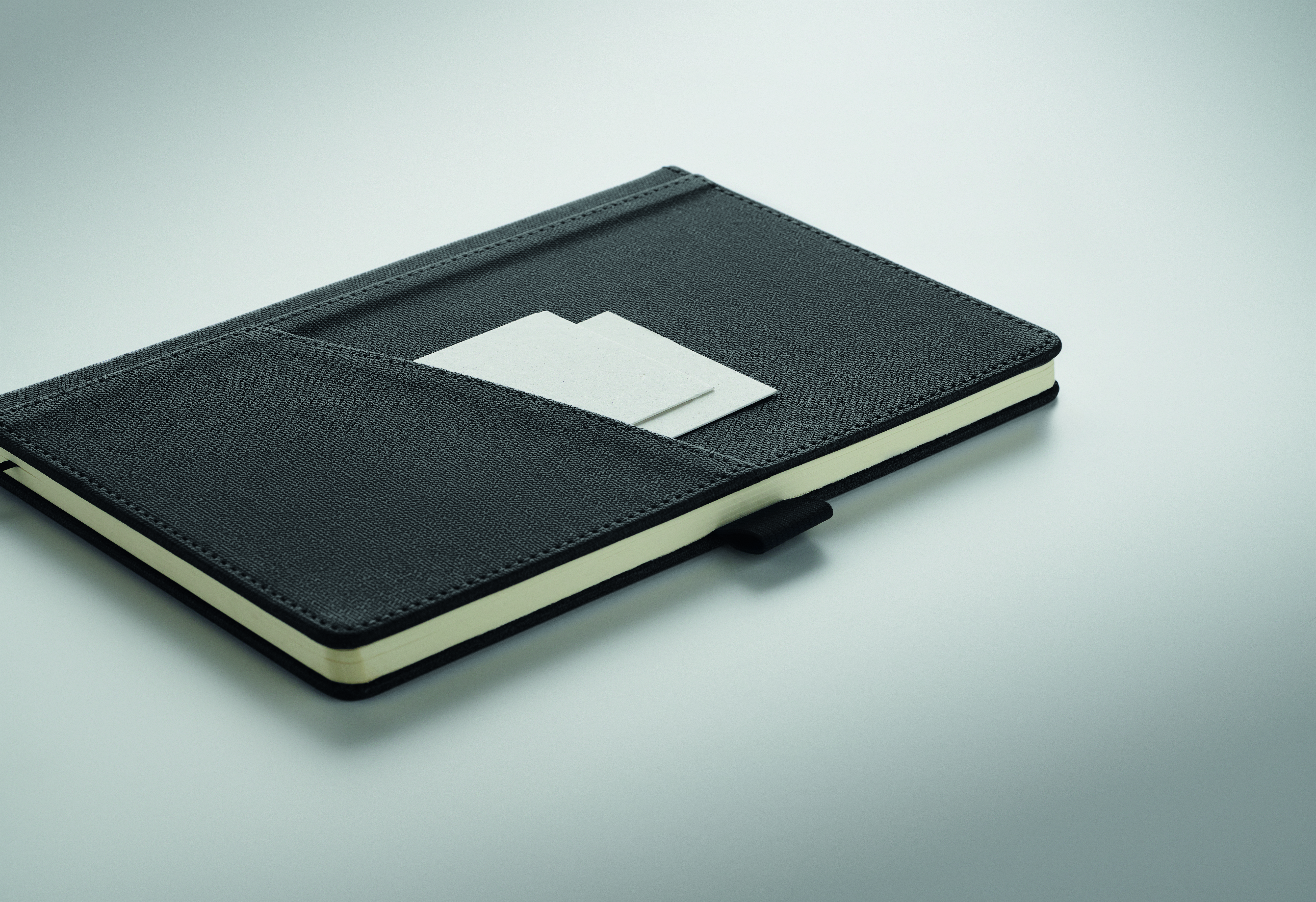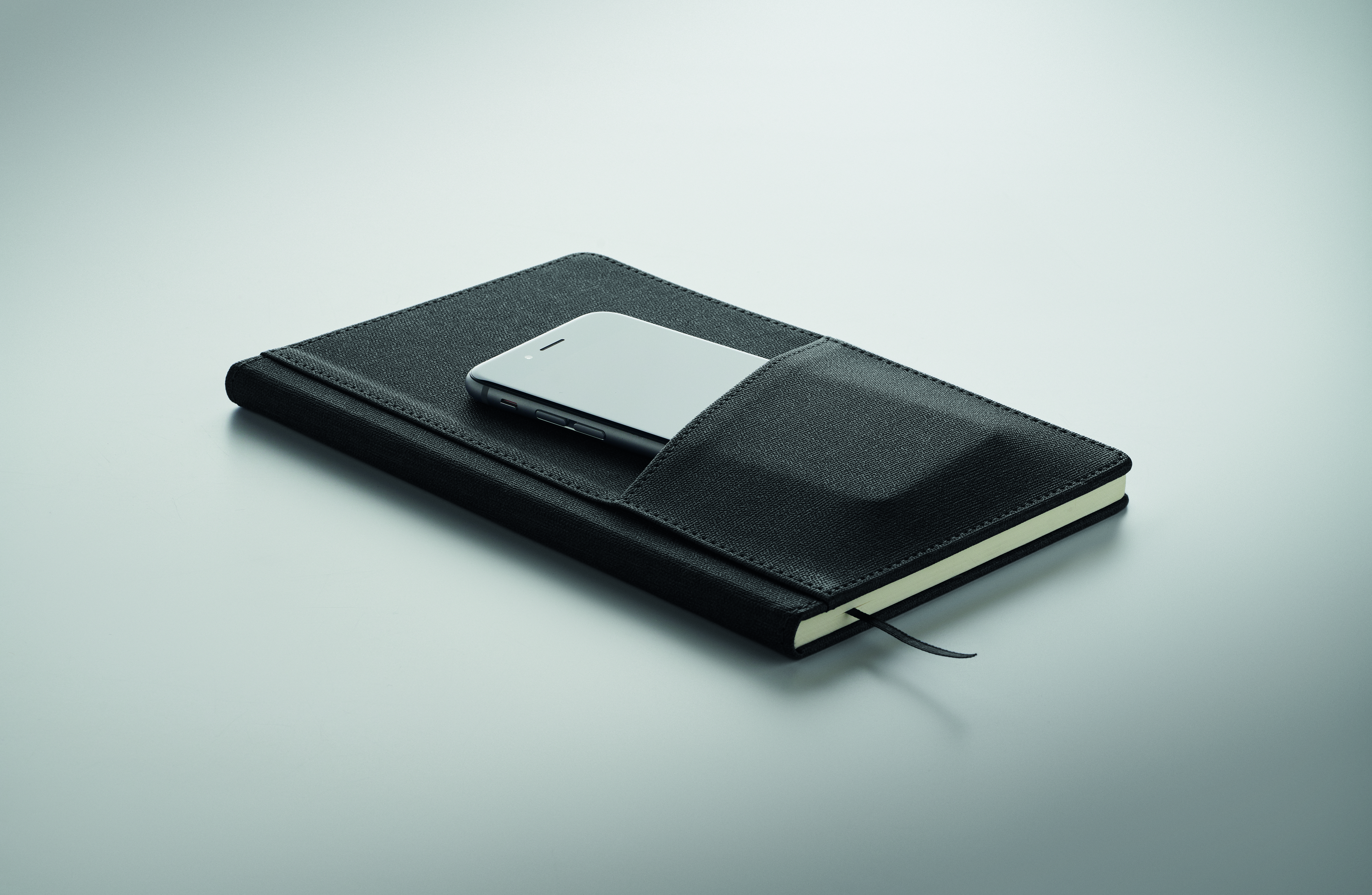 DIN A5 Notizbuch mit gebundenem Hard Cover aus PU. Handyfach auf der Front. 80 Blatt (160 Seiten) liniertes Recyclingpapier. Passendes Lesebändchen. FSC®-certified | FSC MIX CREDIT, P7.1, FSC-C213206