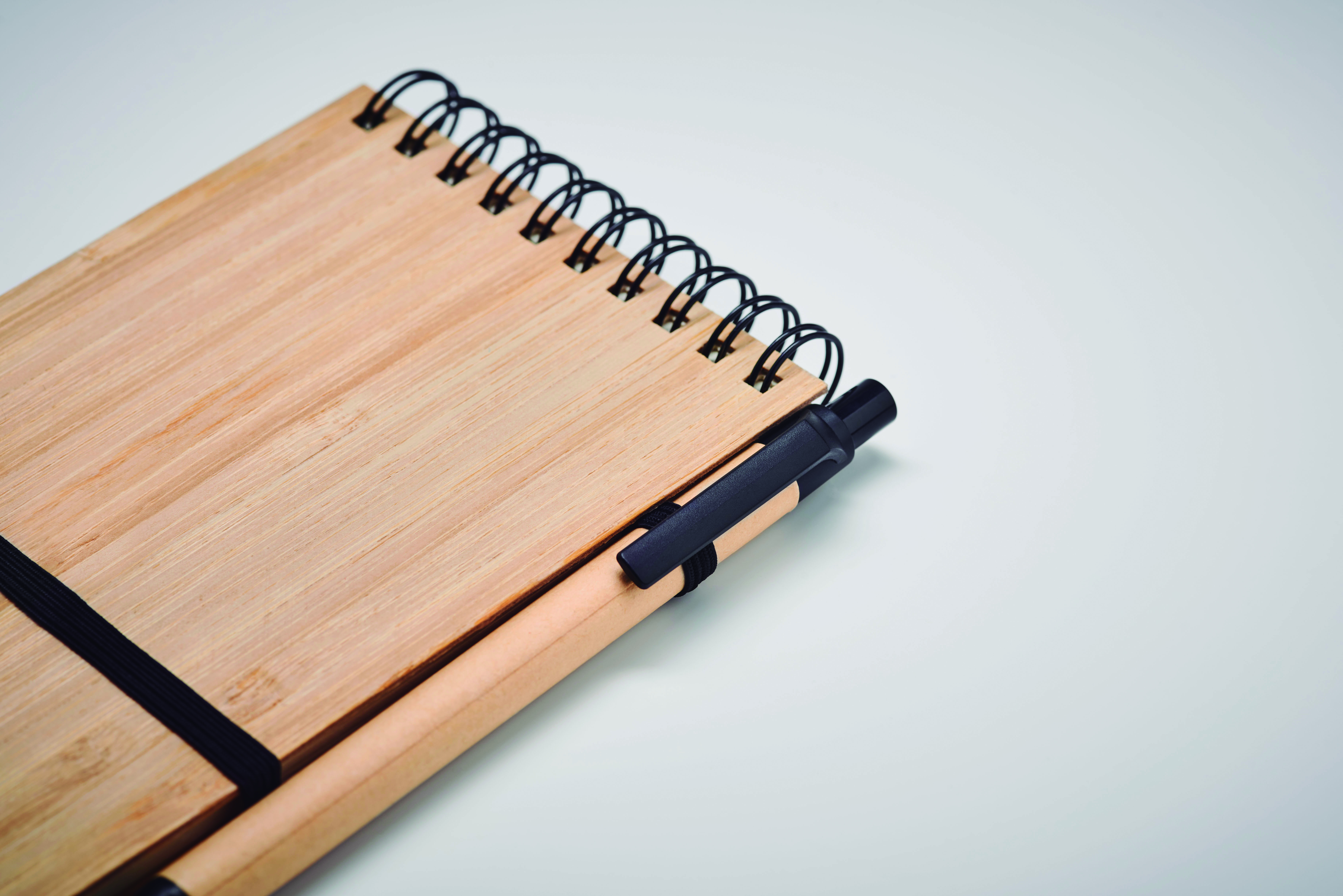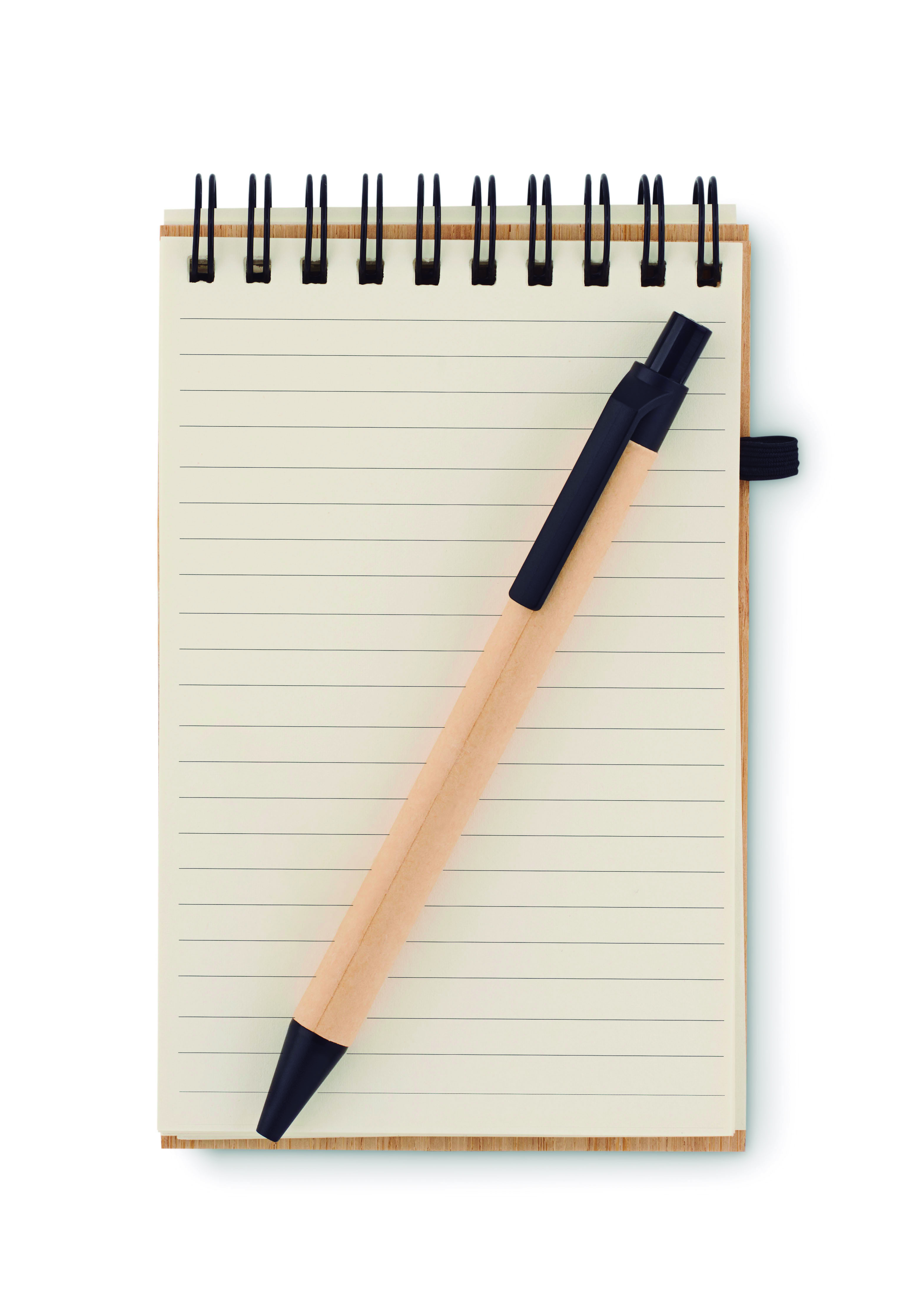 DIN A6 Notizblock mit einem Cover aus Bambus und 70 Blatt liniertem Recyclingpapier. Inklusive passendem Kugelschreiber aus recyceltem Papier mit PLA-Spitze und Clip. Mit diesem praktischen Büroartikel können Sie alles Wichtige während Ihrer Meetings notieren. Der Bambuseinband verleiht dem Block einen schönen natürlichen Touch. Sowohl der Kugelschreiber als auch das Papier sind aus Recycling-Papier hergestellt, was dieses Produkt zu einer nachhaltigen Wahl macht. Der Stift hat blaue Tinte. Da Bambus ein natürliches Material ist, können Farbton und Maße pro Artikel variieren. Dies kann zu Abweichungen im Ergebnis der Veredlung führen. FSC®-certified | FSC MIX, P7.7, FSC-C213206