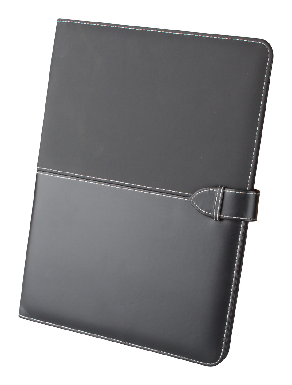 A4 Dokumentenmappe mit Notizblock (20 Seiten, liniert), Stiftschlaufe und Visitenkartenfach. Material: Kunstleder.