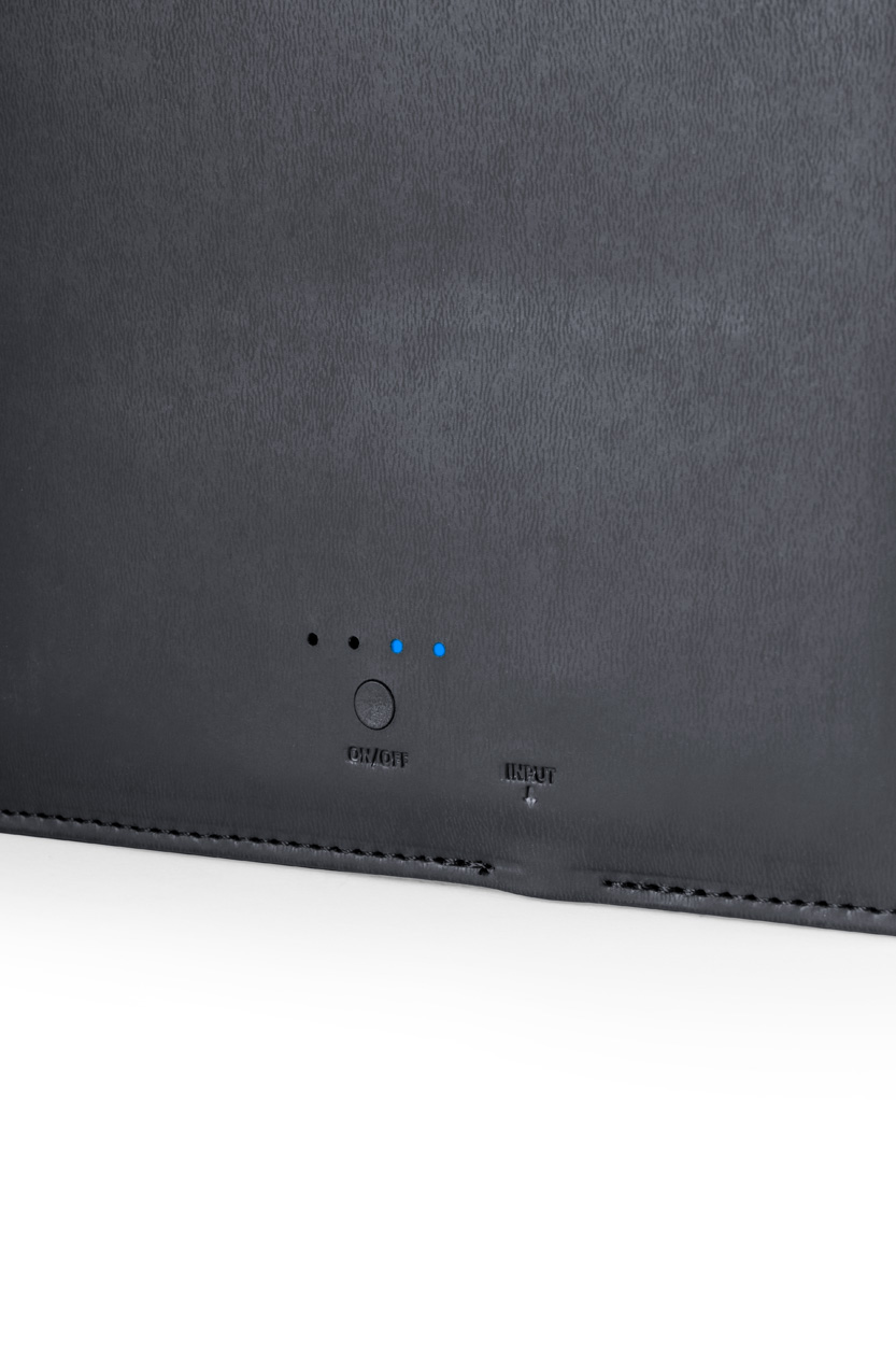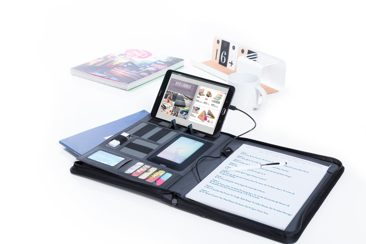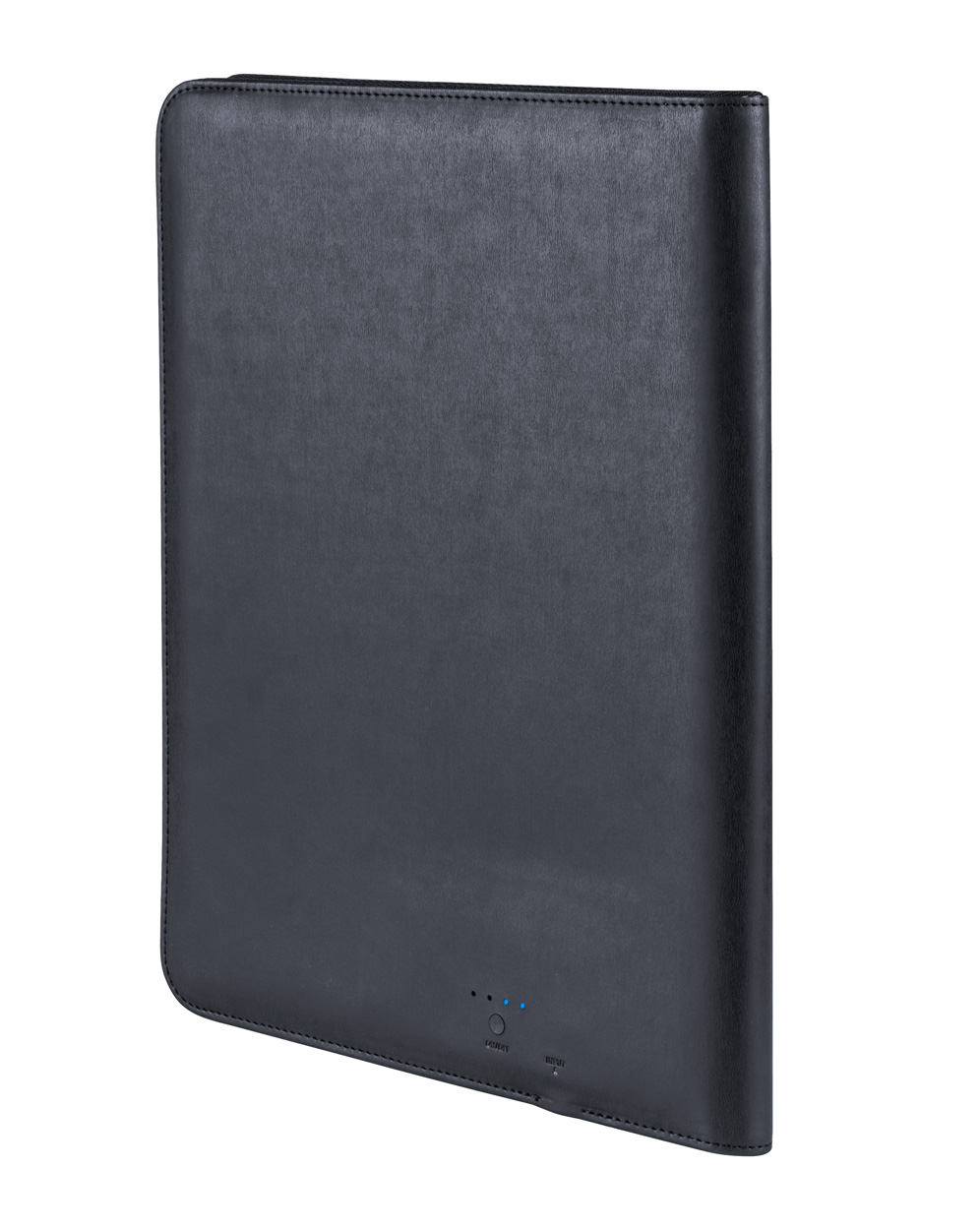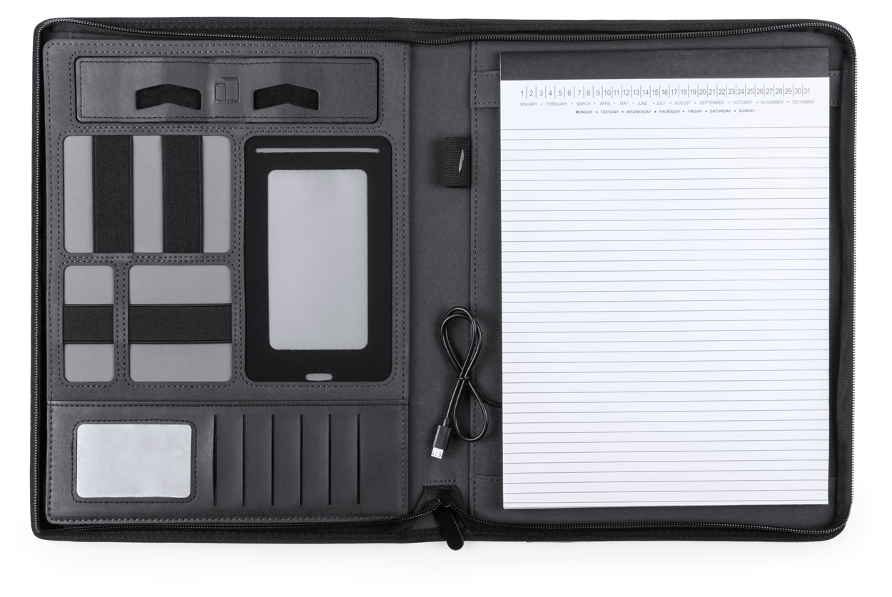Dokumentenmappe aus Kunstleder mit Powerbank (5000 mAh) Notizblock (20 Blatt), Handy- und Tablethalter. Inkl. USB-Ladekabel.