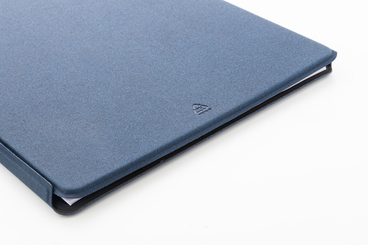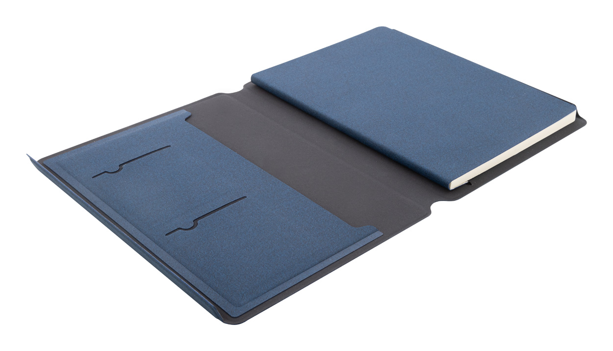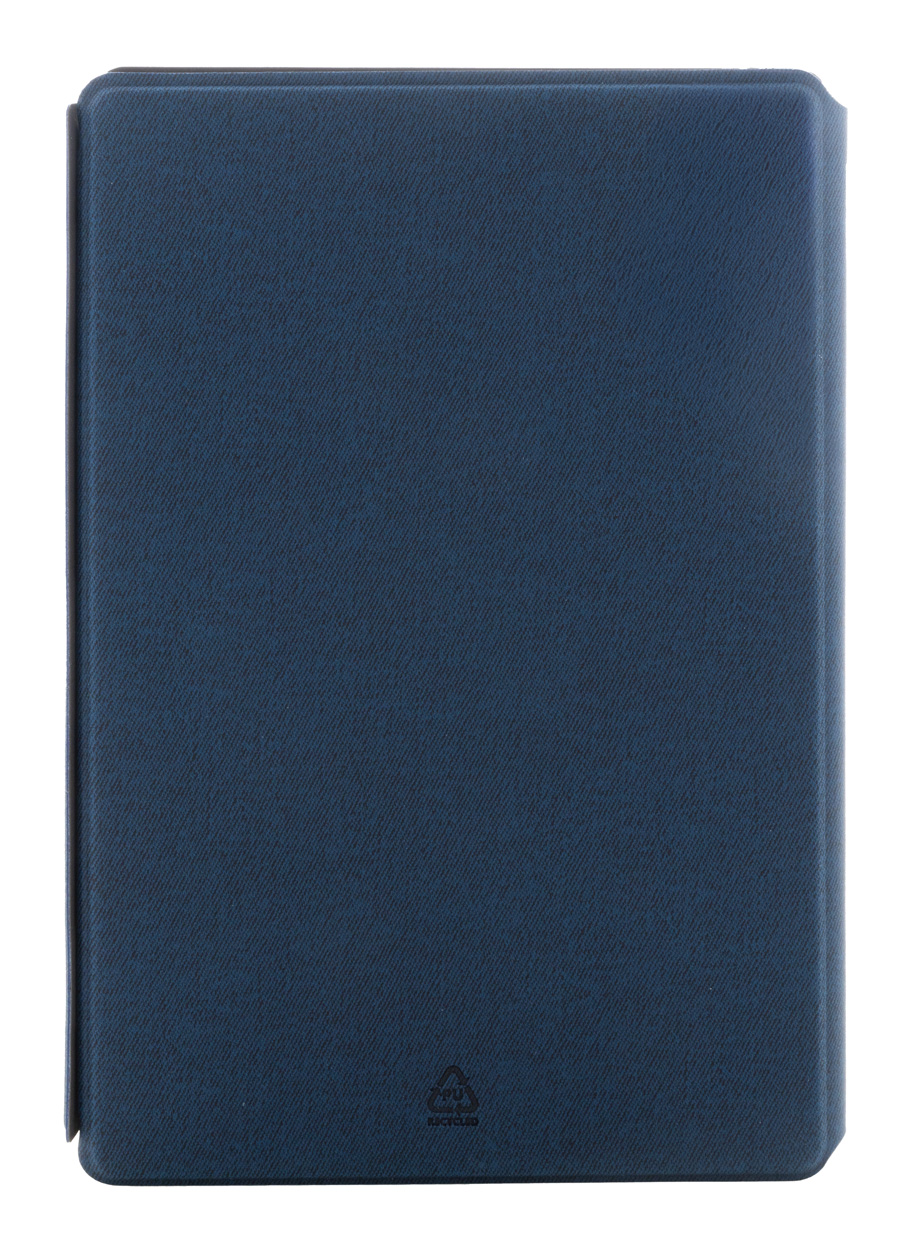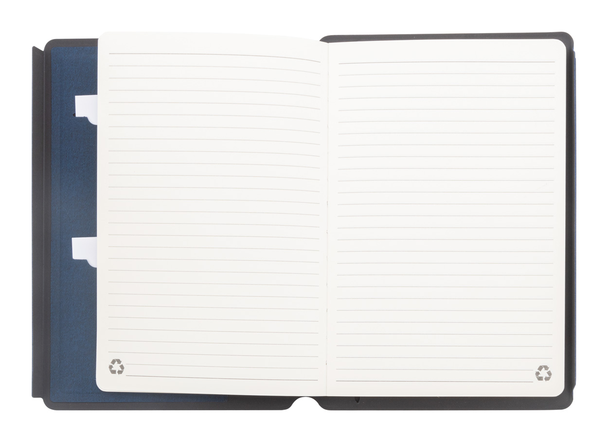 Dokumentenmappe im A5-Format aus recyceltem Kunstleder mit Organizerfächern innen und Magnetverschluss. Enthält einen Notizblock mit 64 linierten Seiten aus recyceltem Papier.