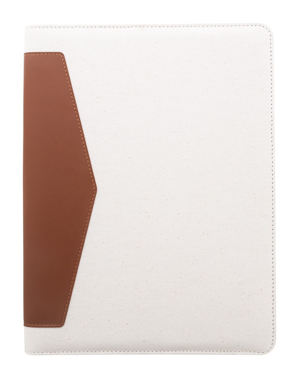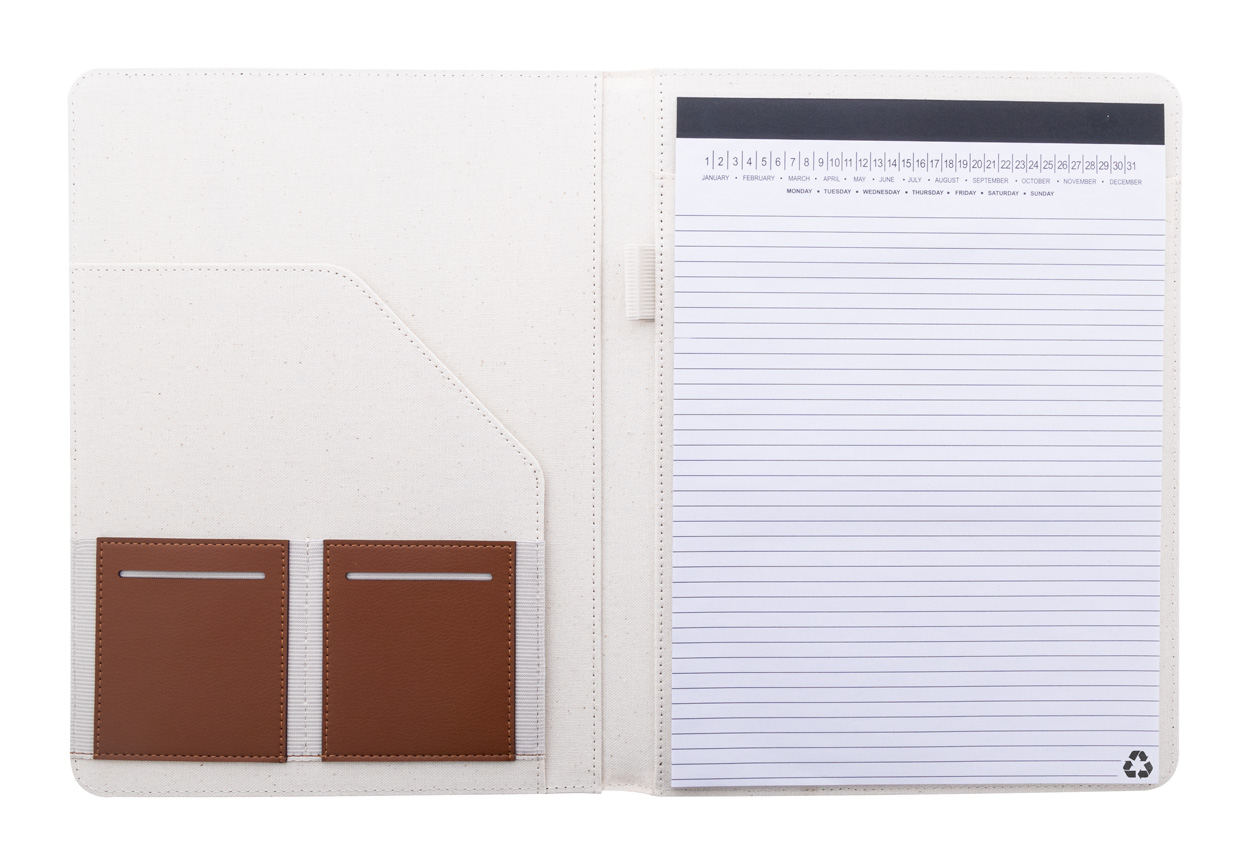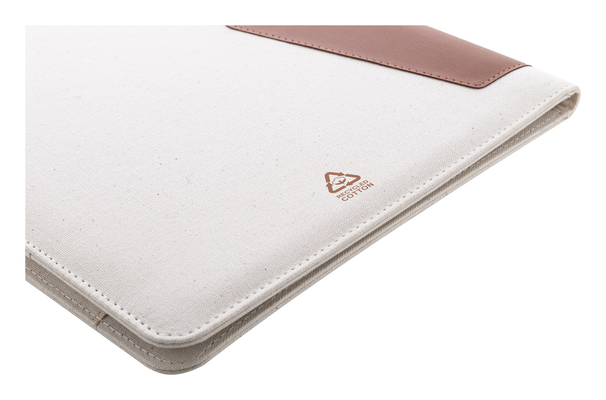 Dokumentenmappe im A4-Format aus recyceltem Canvas und recyceltem Kunstleder mit mehreren Organizerfächern innen. Enthält einen Notizblock mit 20 linierten Seiten aus recyceltem Papier. Material: 70 % recycelte Baumwolle und 30 % RPET-Polyester.