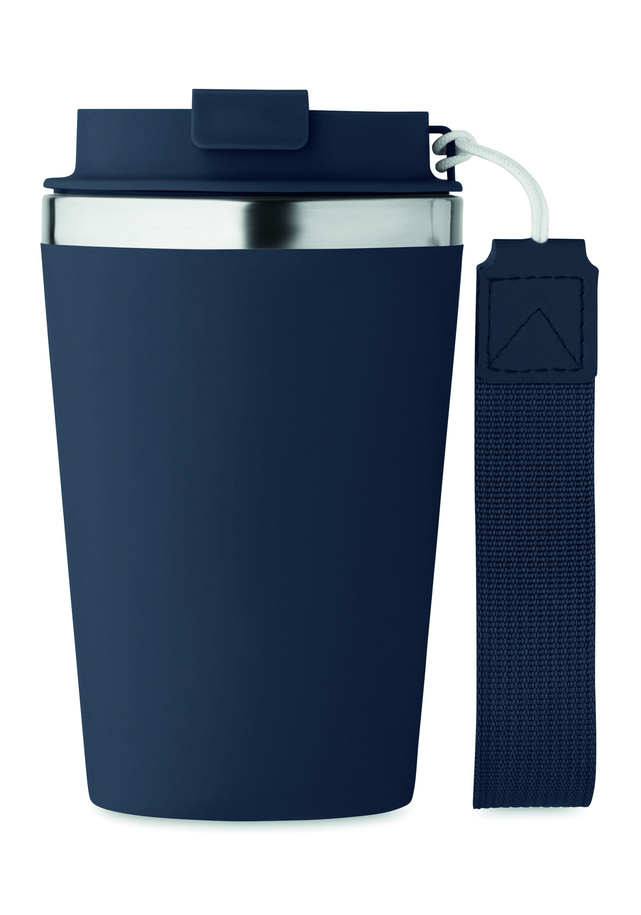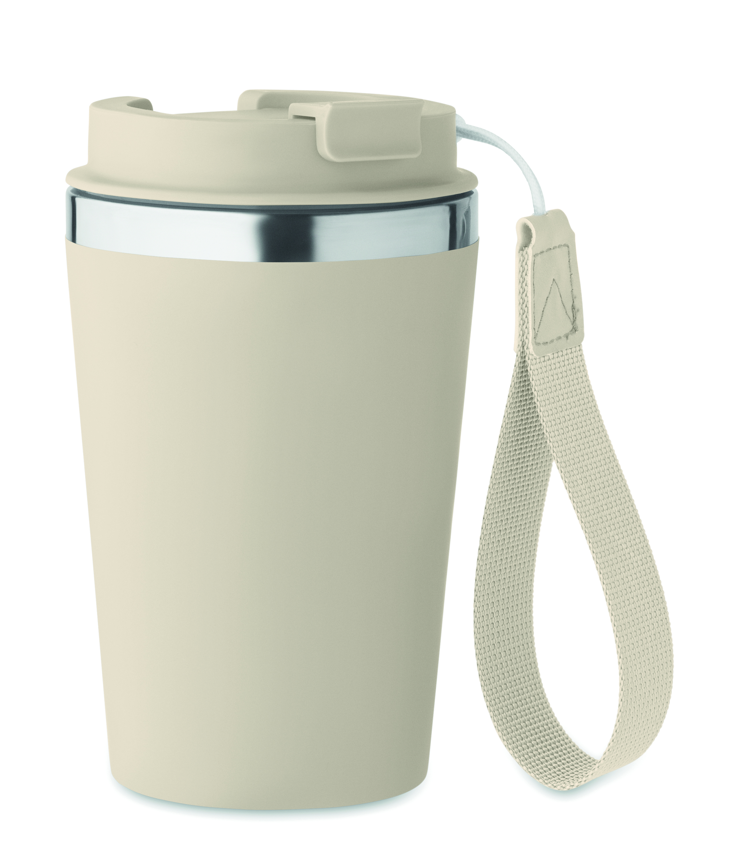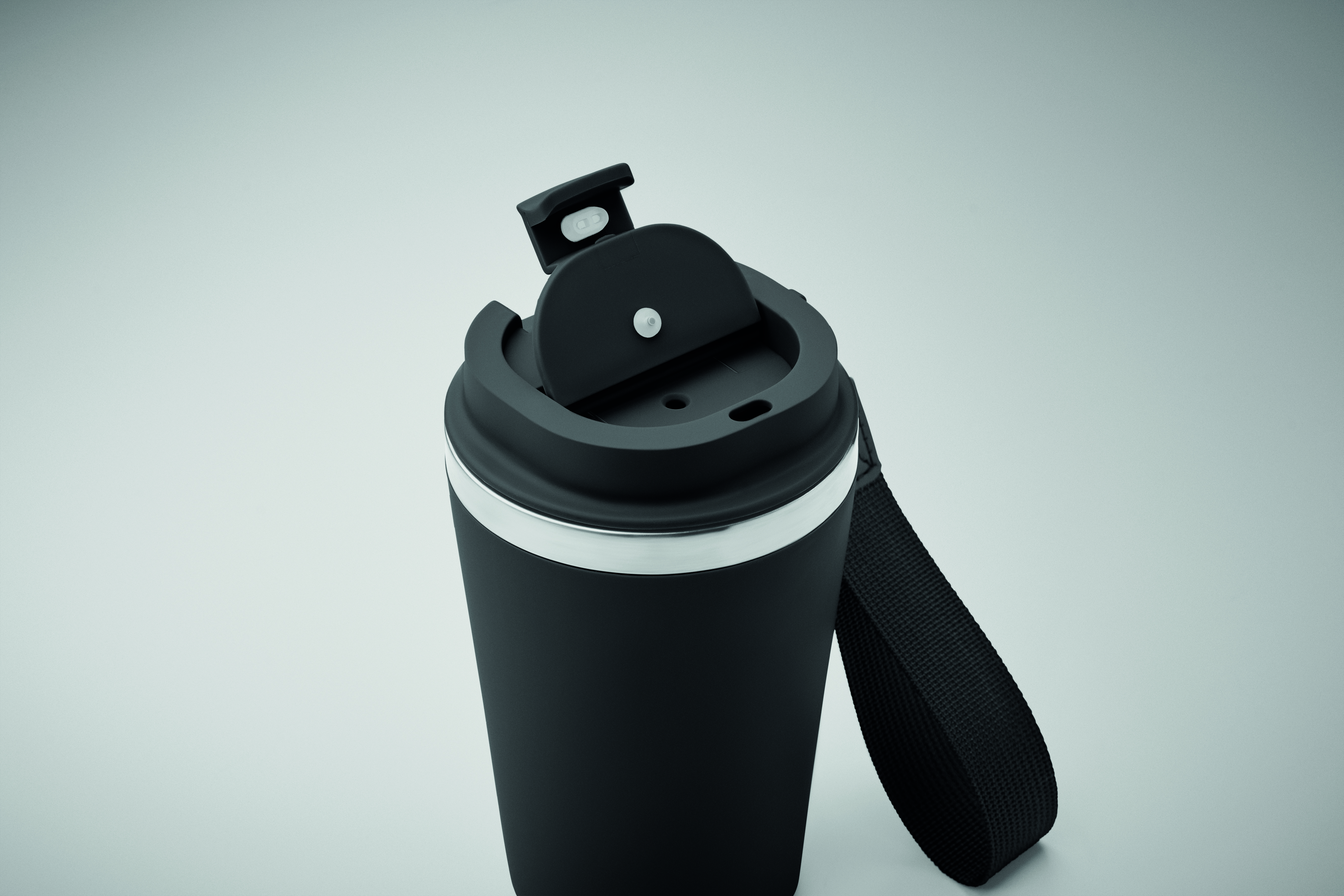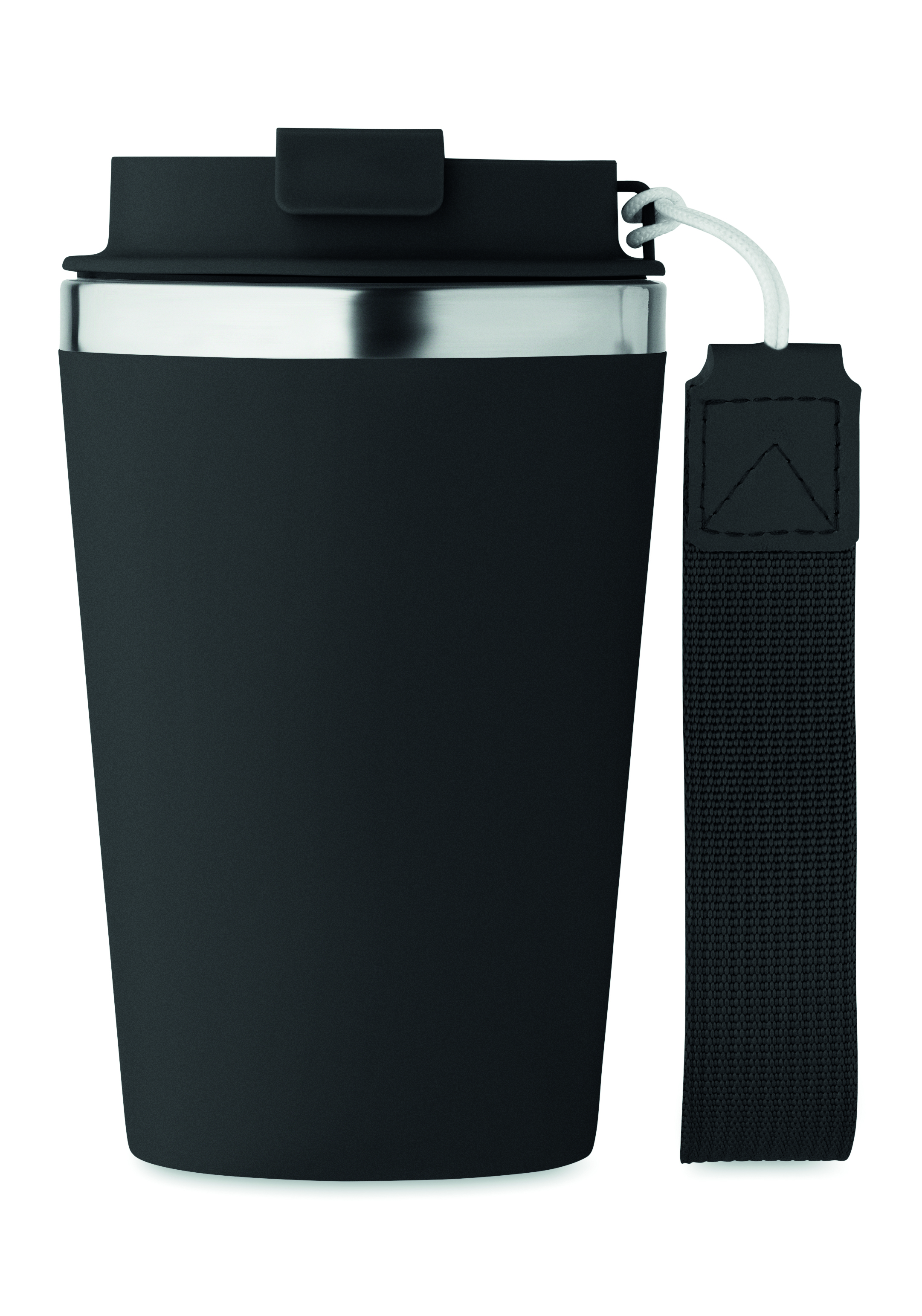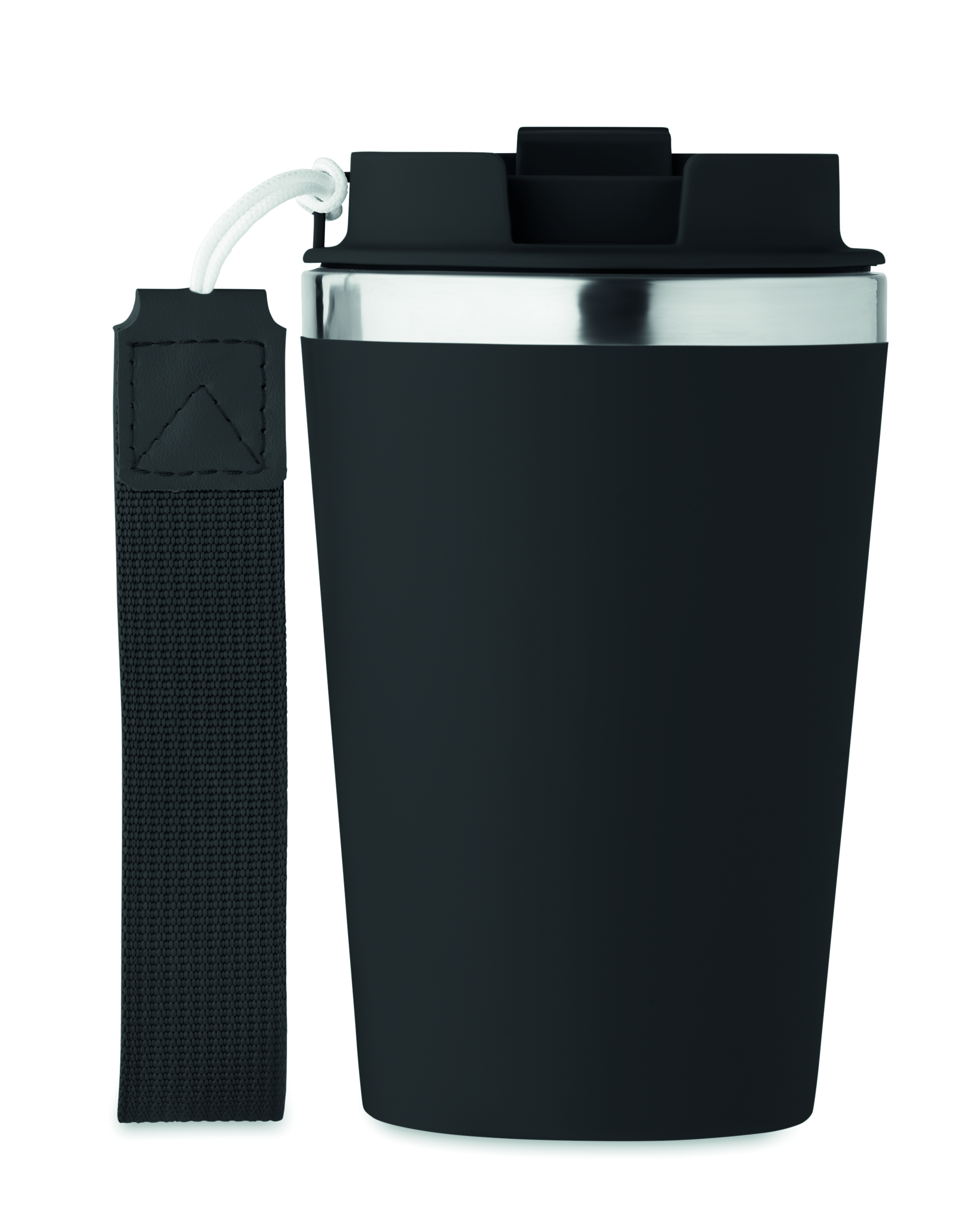 Doppelwandiger Becher aus recyceltem Edelstahl (90 % recycelter Edelstahl und 10 % Edelstahl). Oberfläche aus PP. RPET-Schlaufe für das Handgelenk. Füllmenge: 350 ml.