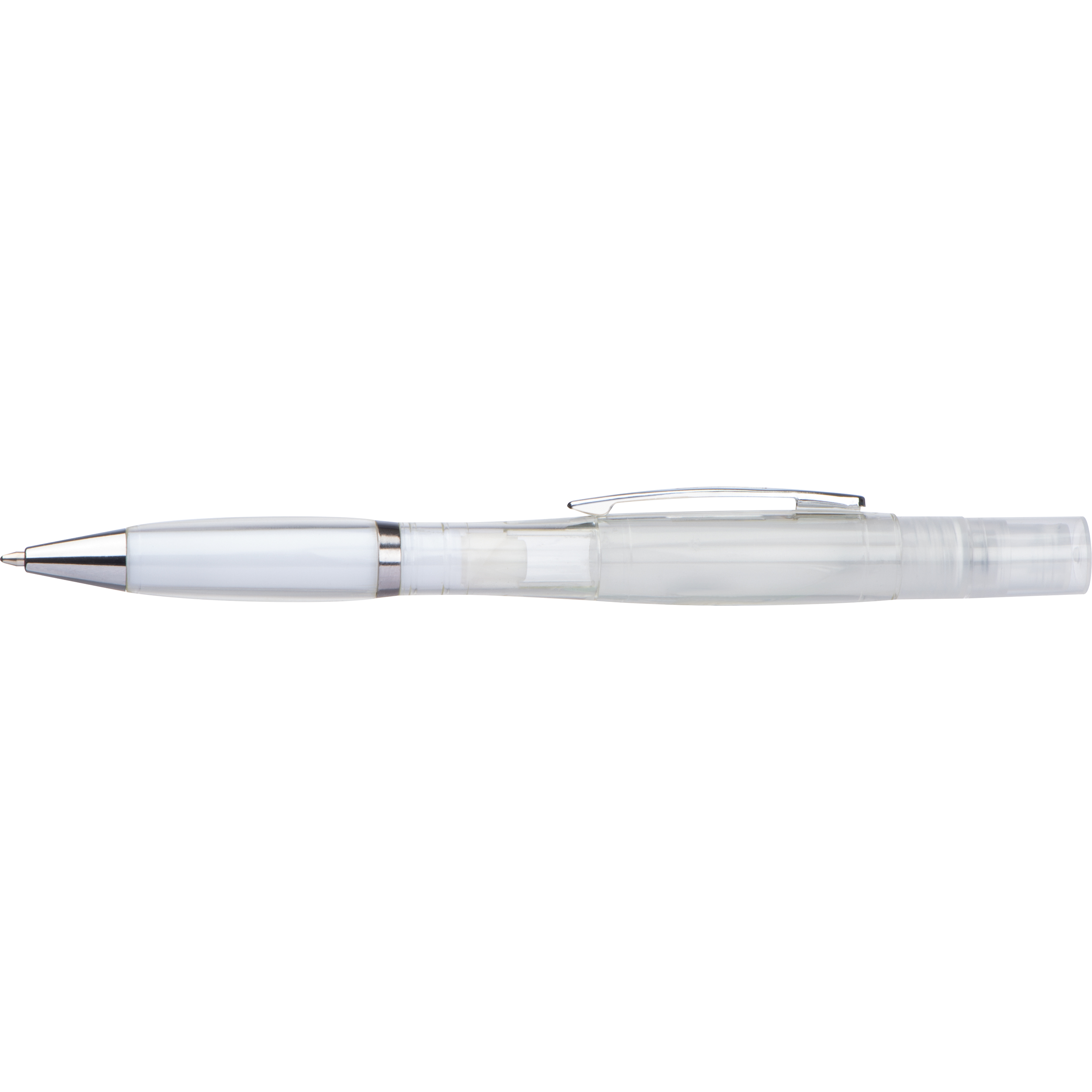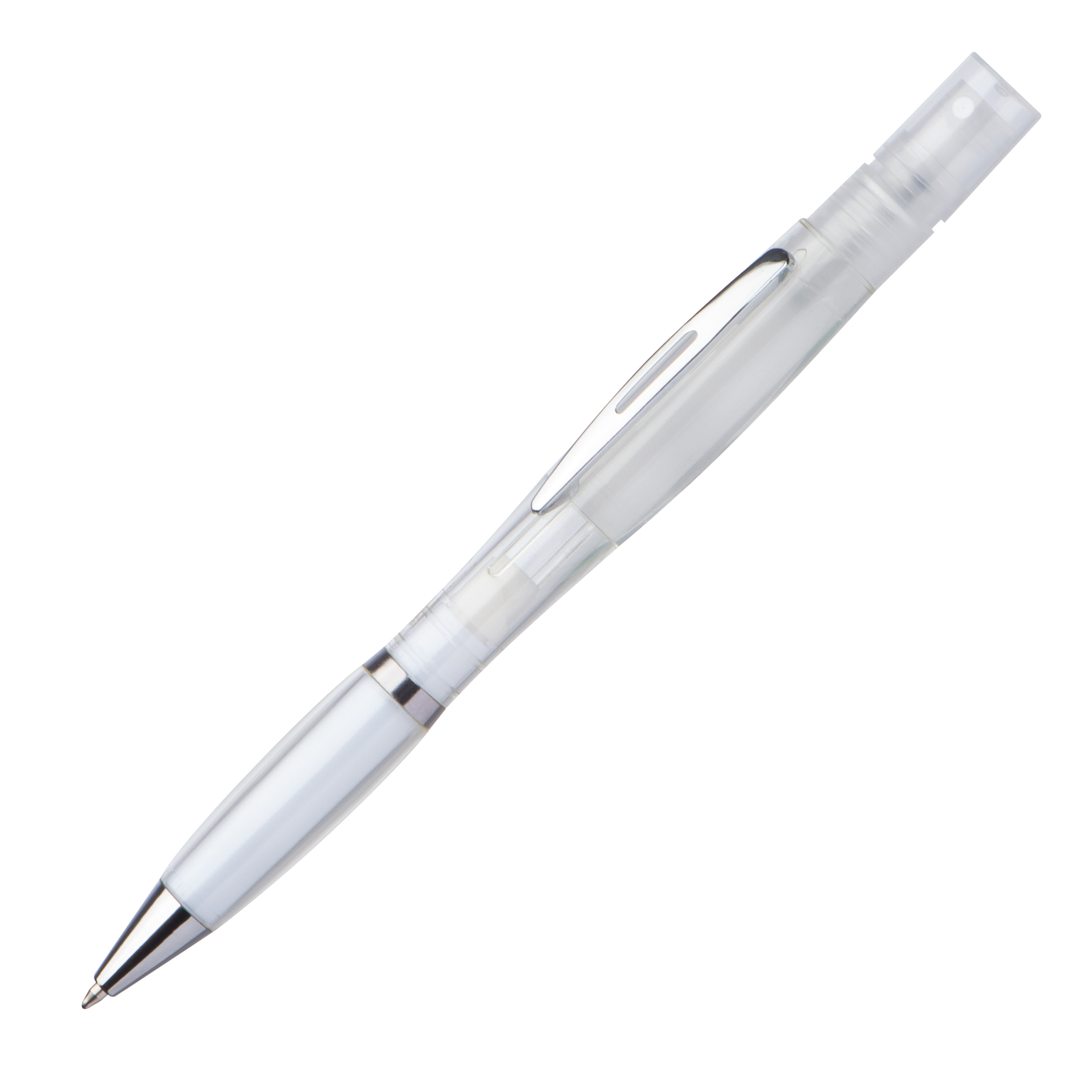 Transparenter Drehkugelschreiber mit silbernen Applikationen, blau schreibender Mine und einem integrierten Behälter für Desinfektionsmittel mit Zerstäuber. Nachfüllbar, der Kugelschreiber wird unbefüllt geliefert. Ihre Werbung wird rechts vom Clip gedruckt.