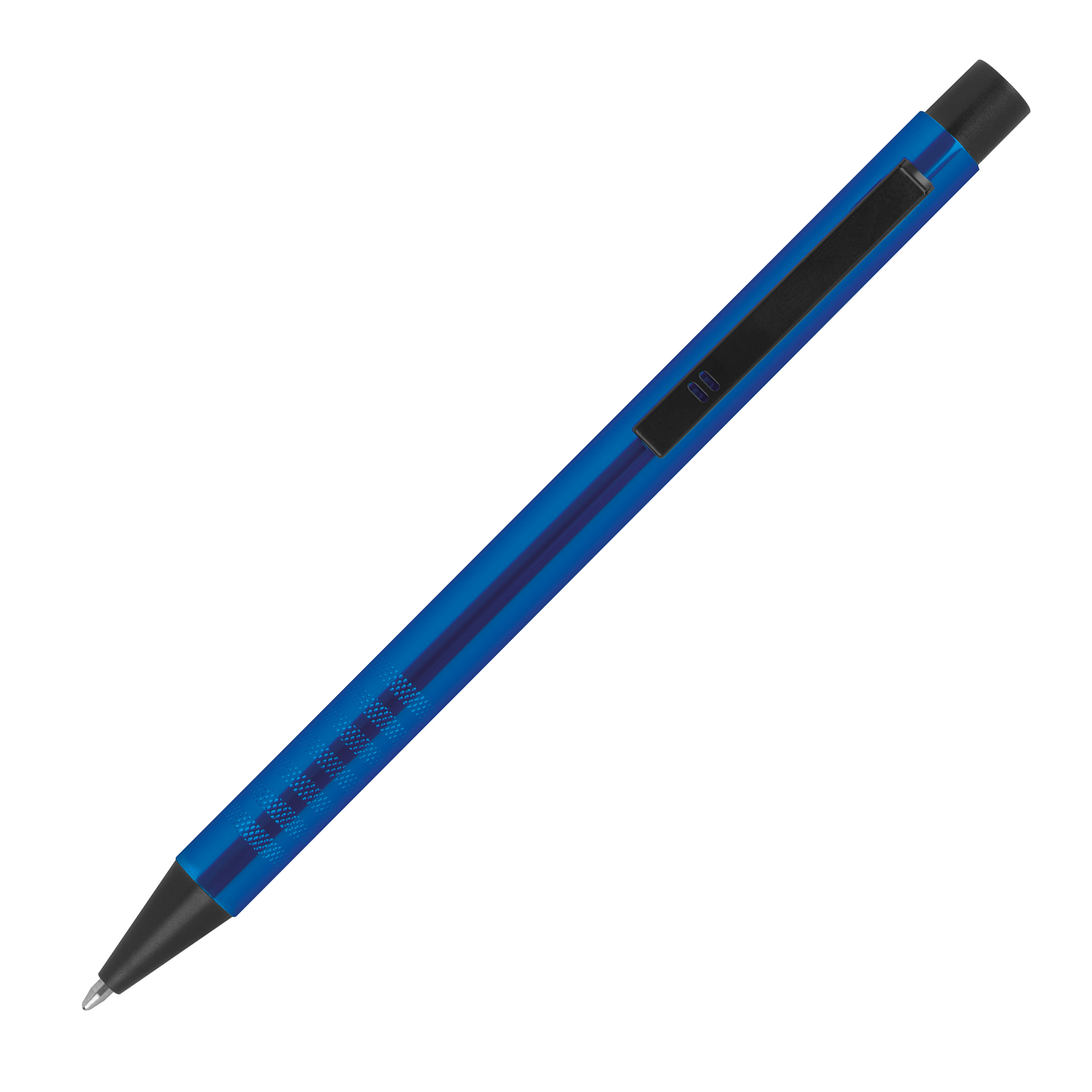 Druckkugelschreiber aus Metall mit blau schreibender Mine und extravaganter Griffzone. Ihre Werbung wird rechts vom Clip per Lasergravur angebracht.