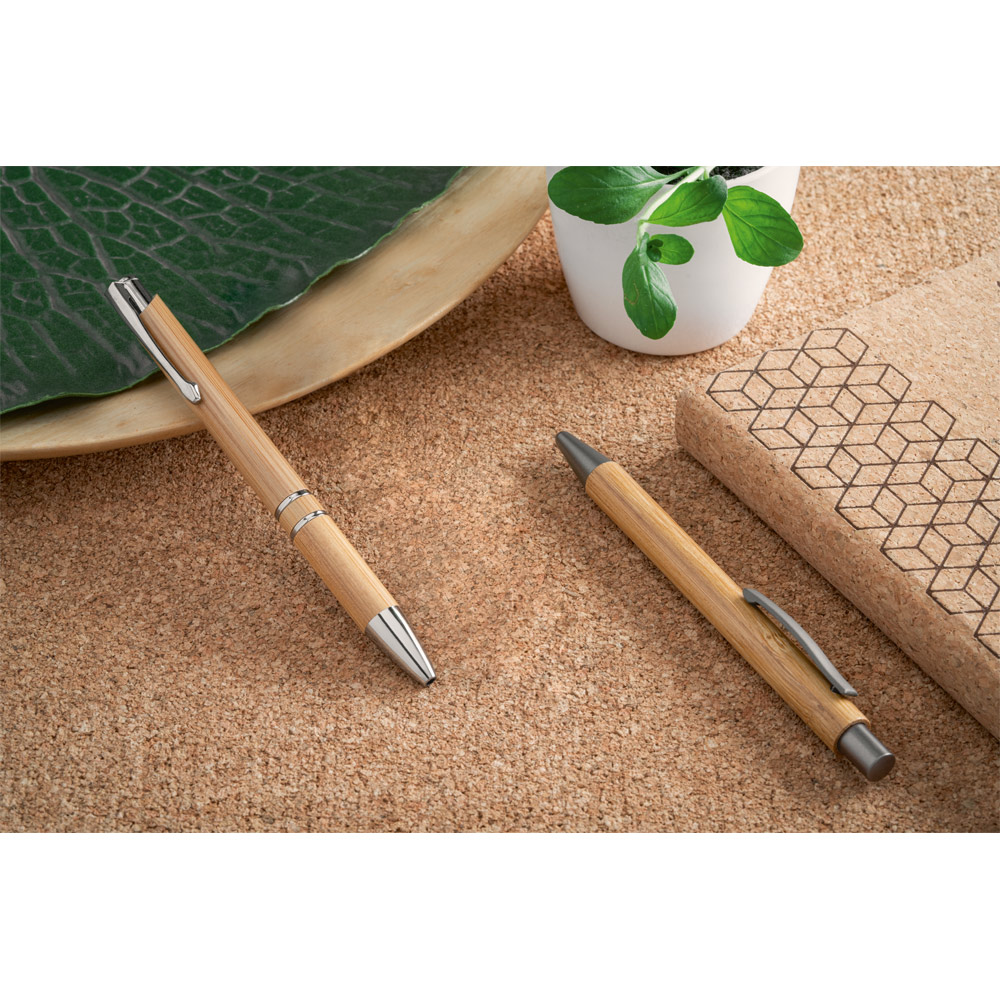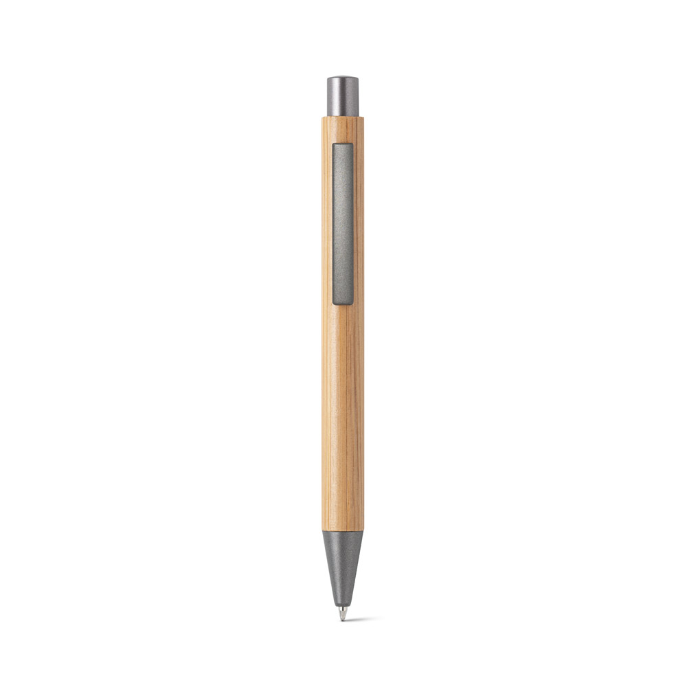 Kugelschreiber aus Bambus mit Clip aus Metall. Blauschreibende Mine. Da das Produkt aus natürlichen Materialien hergestellt wird, können Farbe des Produkts sowie das Druckergebnis von Produkt zu Produkt unterschiedlich sein. Ø11 x 137 mm