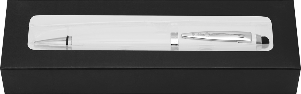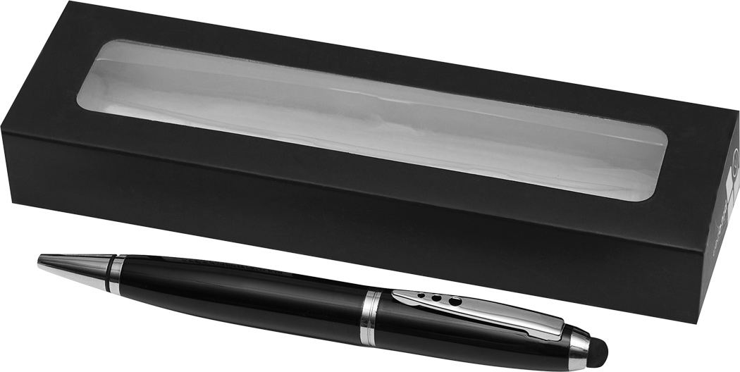 Edelstahl-Kugelschreiber TOUCH DOWN: mit Großraummine und Drehmechanismus, Touchscreen-Spitze am Schaftende, in Klavierlack-Optik und mit silbernen Dekorelementen, Clip im PiCOWORLD-Design, schwarzschreibend, Lieferung in Geschenkbox