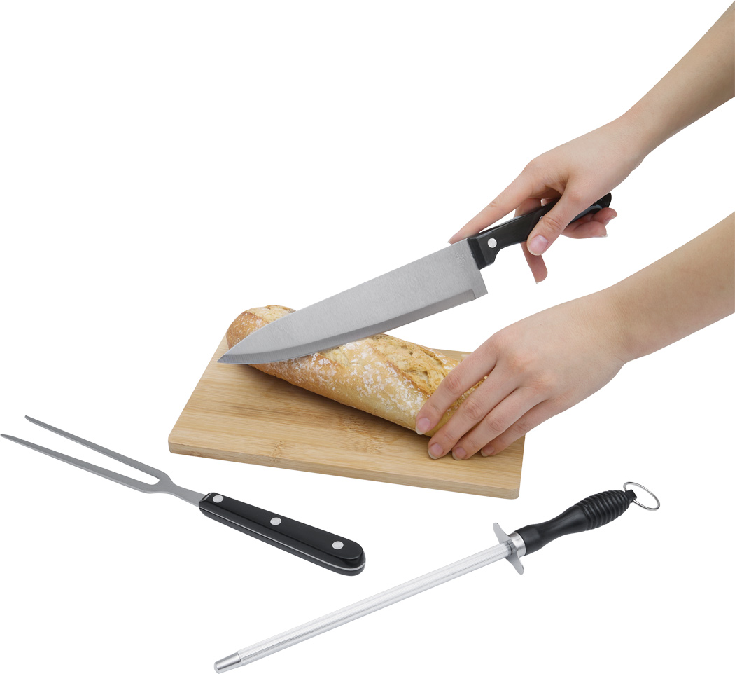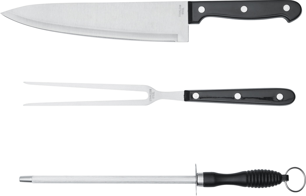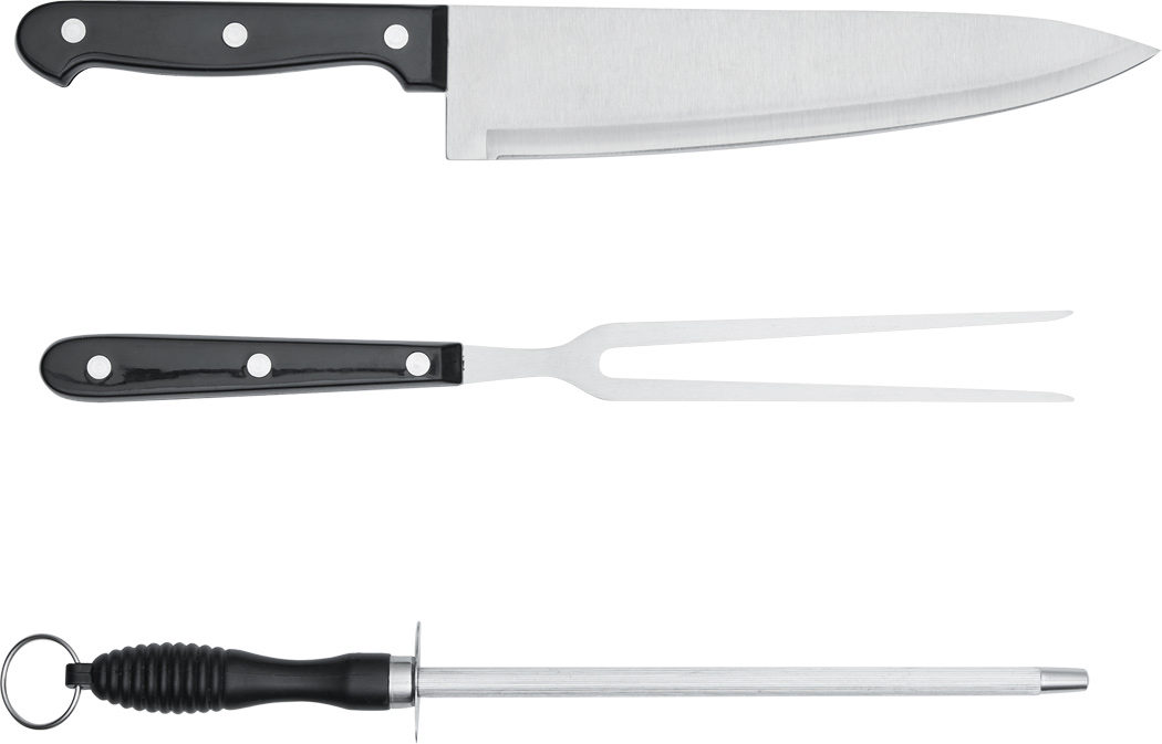 Edelstahl-Tranchierbesteck CARVE, 3-teilig: bestehend aus Wetzstab mit Aufhängeöse, Fleischmesser und Fleischgabel, in schlichter Box