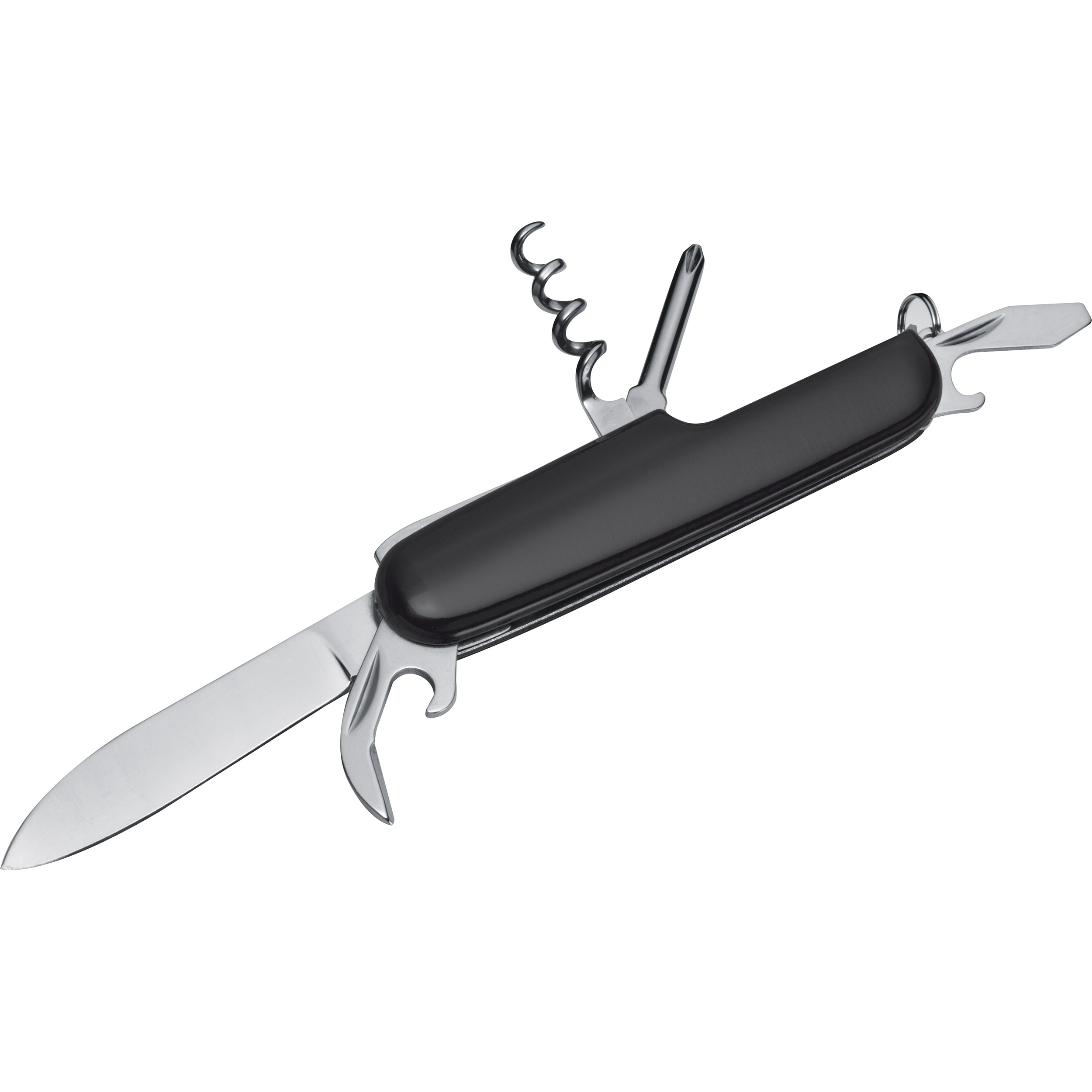 Edles 7 teiliges Aluminium-Taschenmesser mit großer Klinge, Dosen- und Flaschenöffner, Korkenzieher, Kreuz- und Schlitzschraubendreher und Schlüsselring. Ihre Werbung lasern wir mittig auf die Metallic-Lackierung.