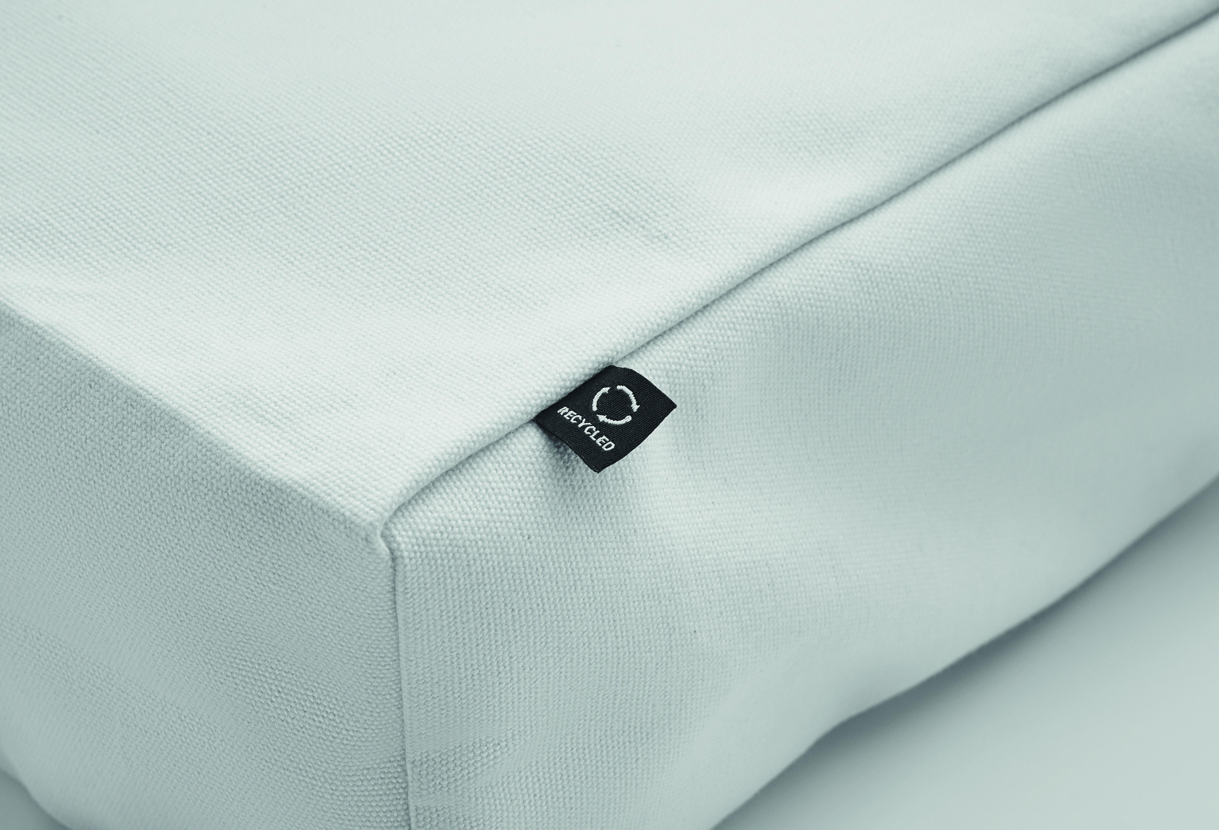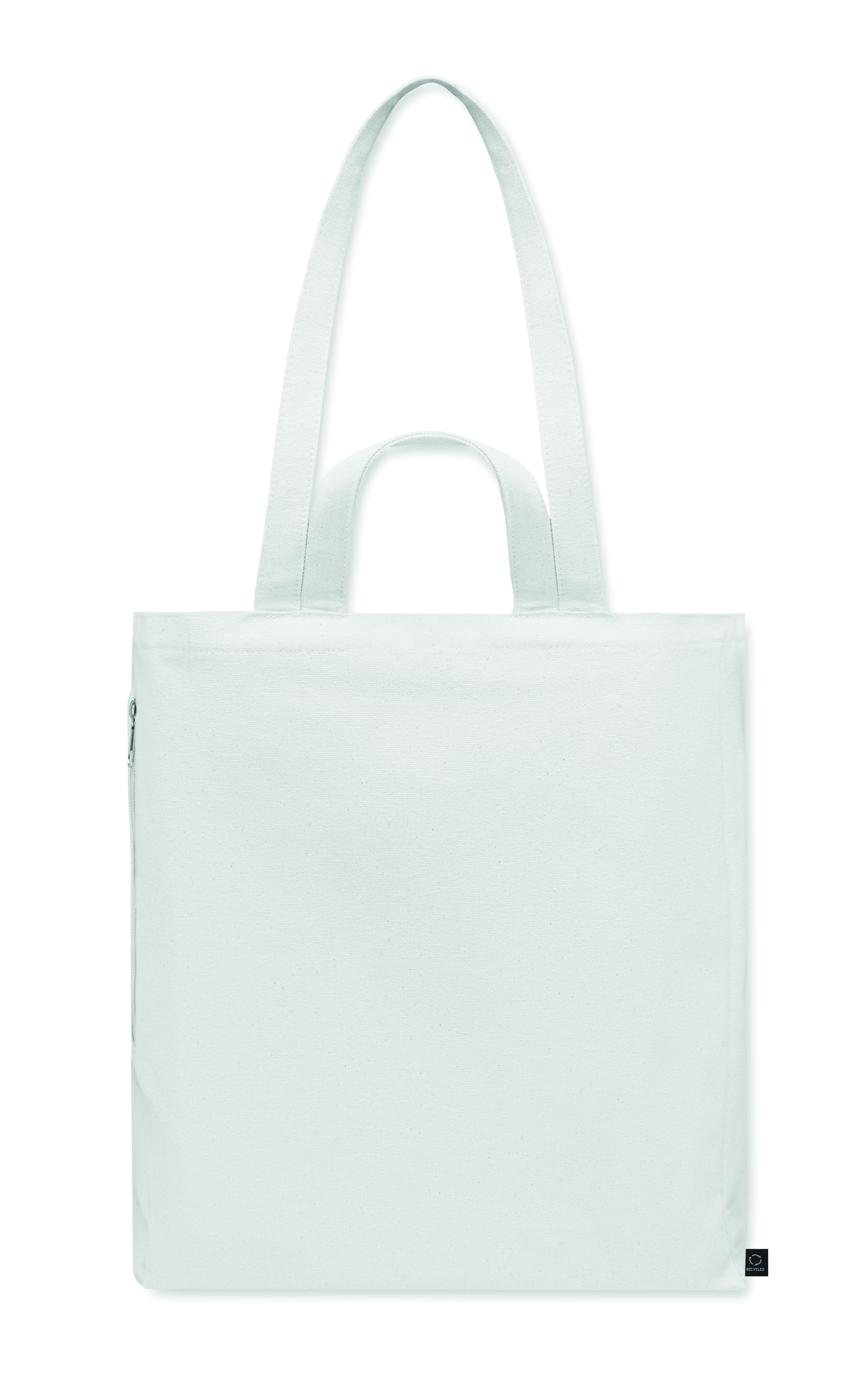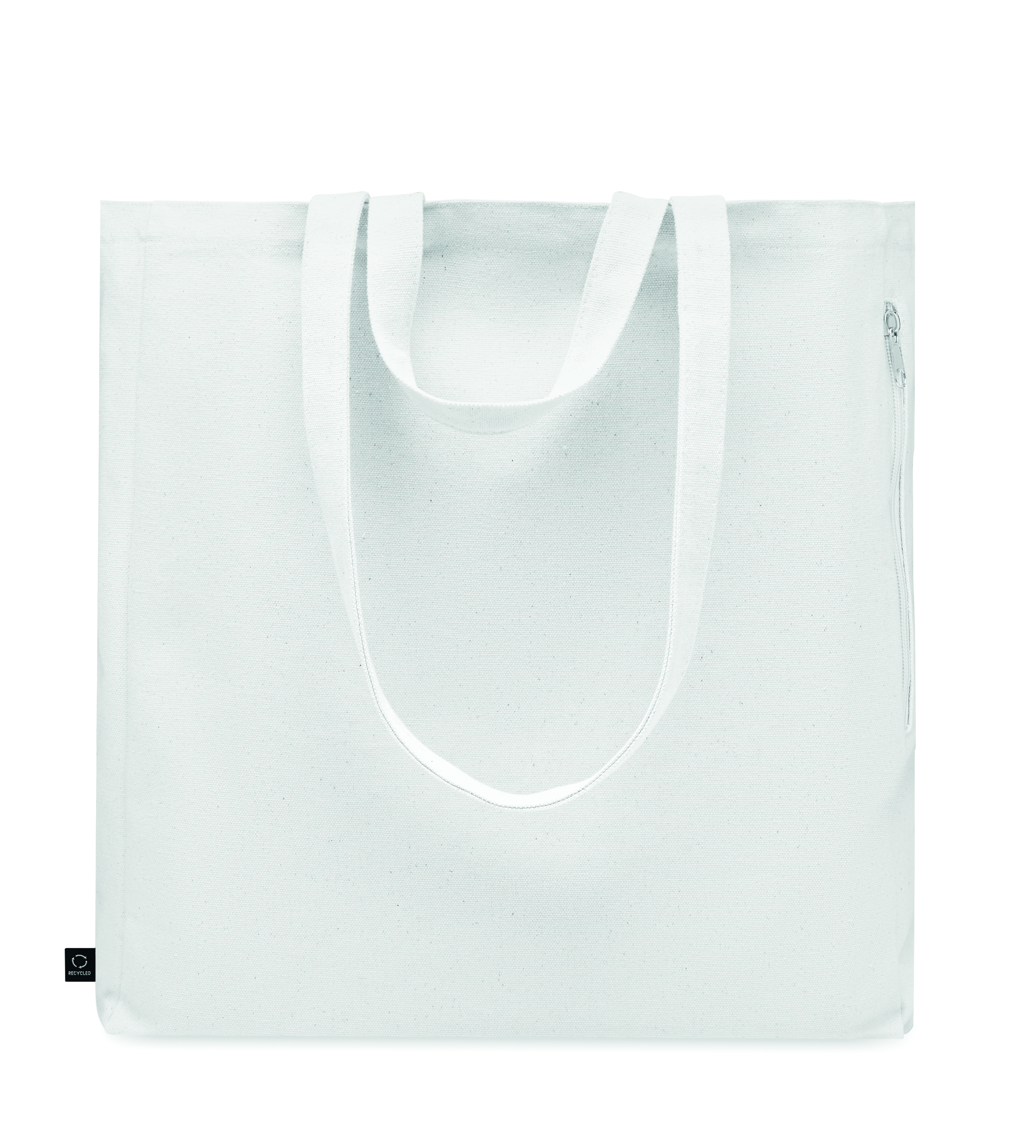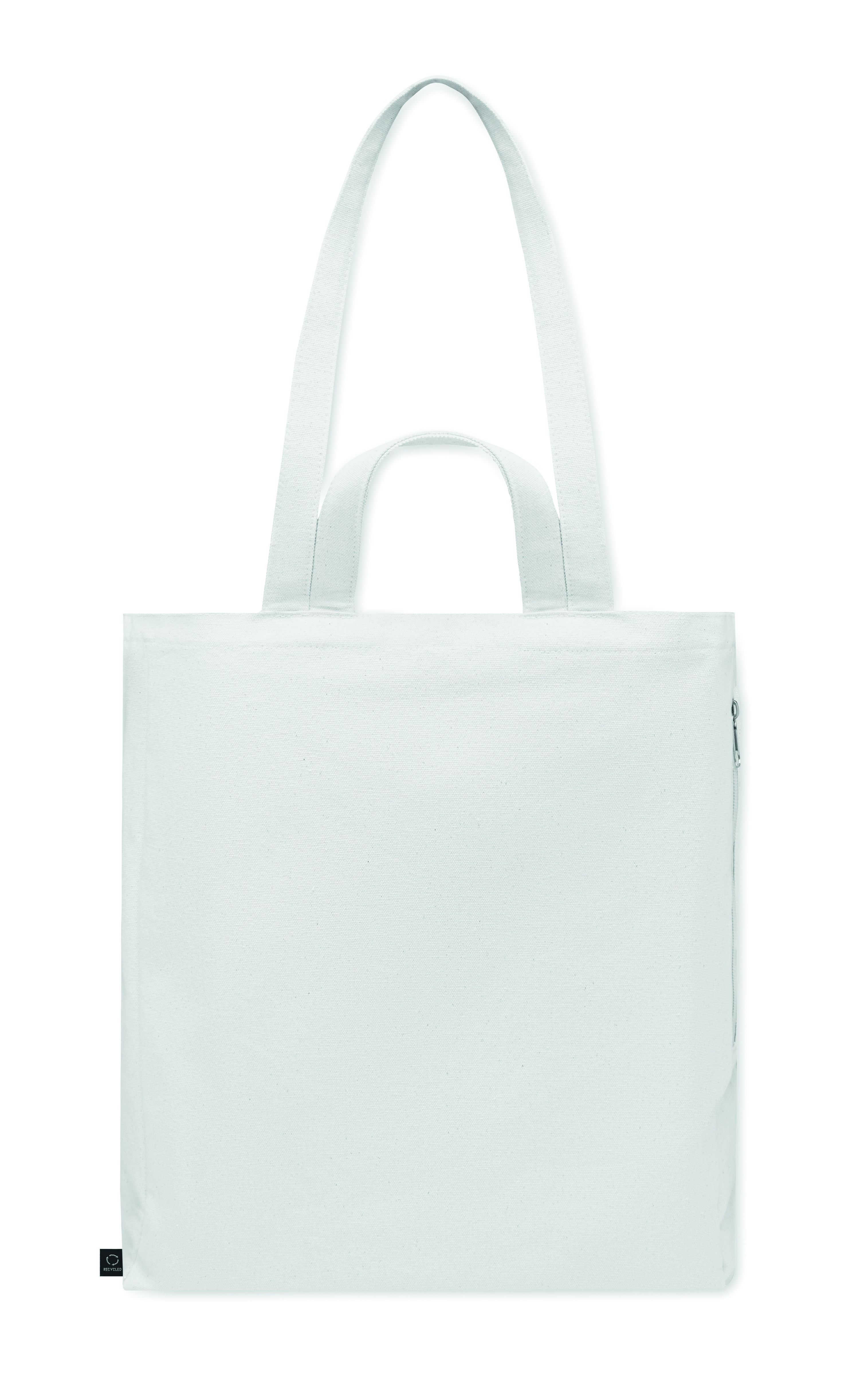 Einkaufs- oder Strandtasche aus recyceltem Polycotton (70 % recycelte Baumwolle, 30 % recycelter Polyester) mit kurzen Tragegriffen. Innentasche mit Reißverschluss. 380 g / m².