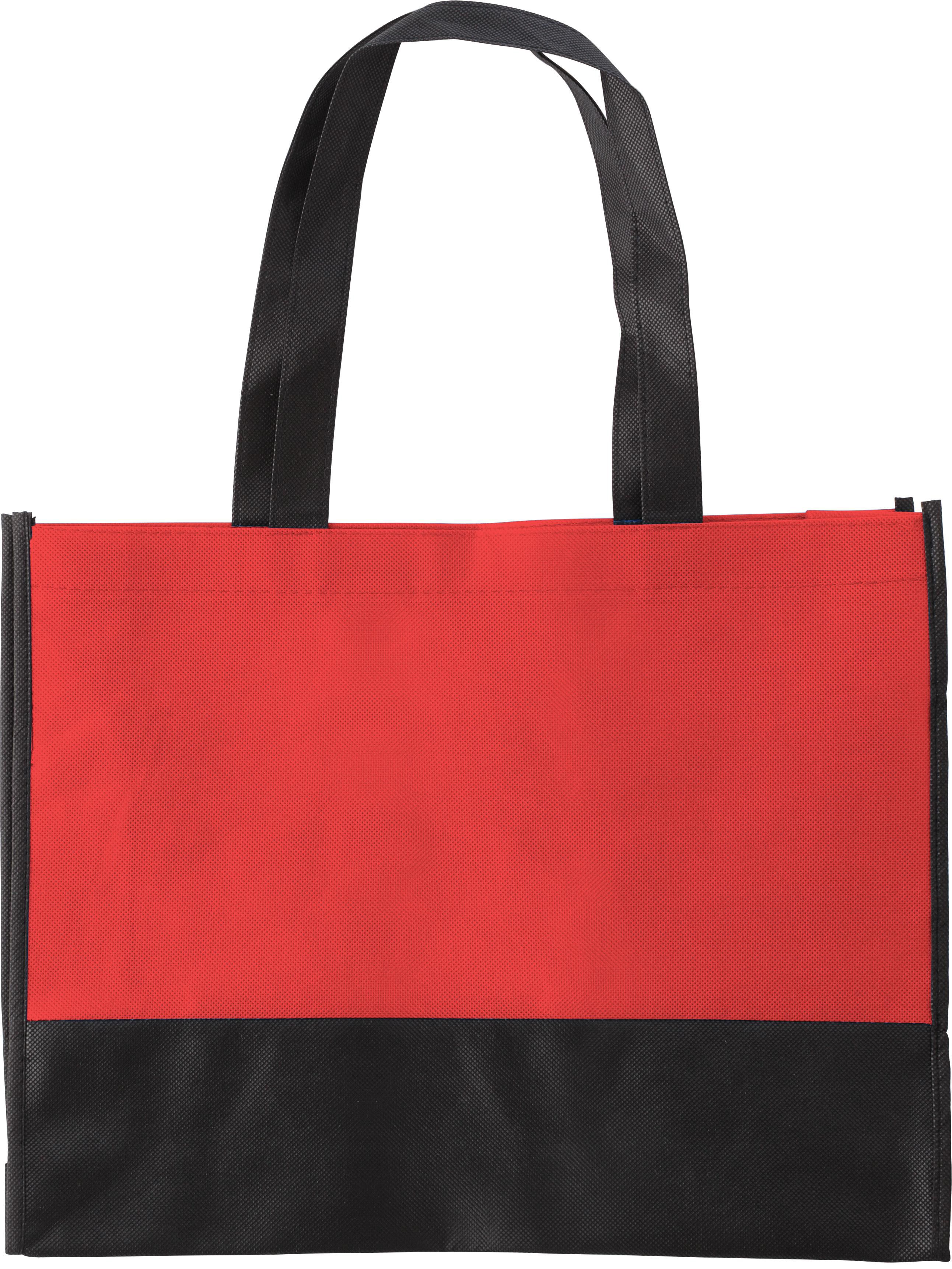 Einkaufstasche aus Non-Woven, zweifarbig, mit 9 cm Boden- und Seitenfalte mit kurzen Henkeln.