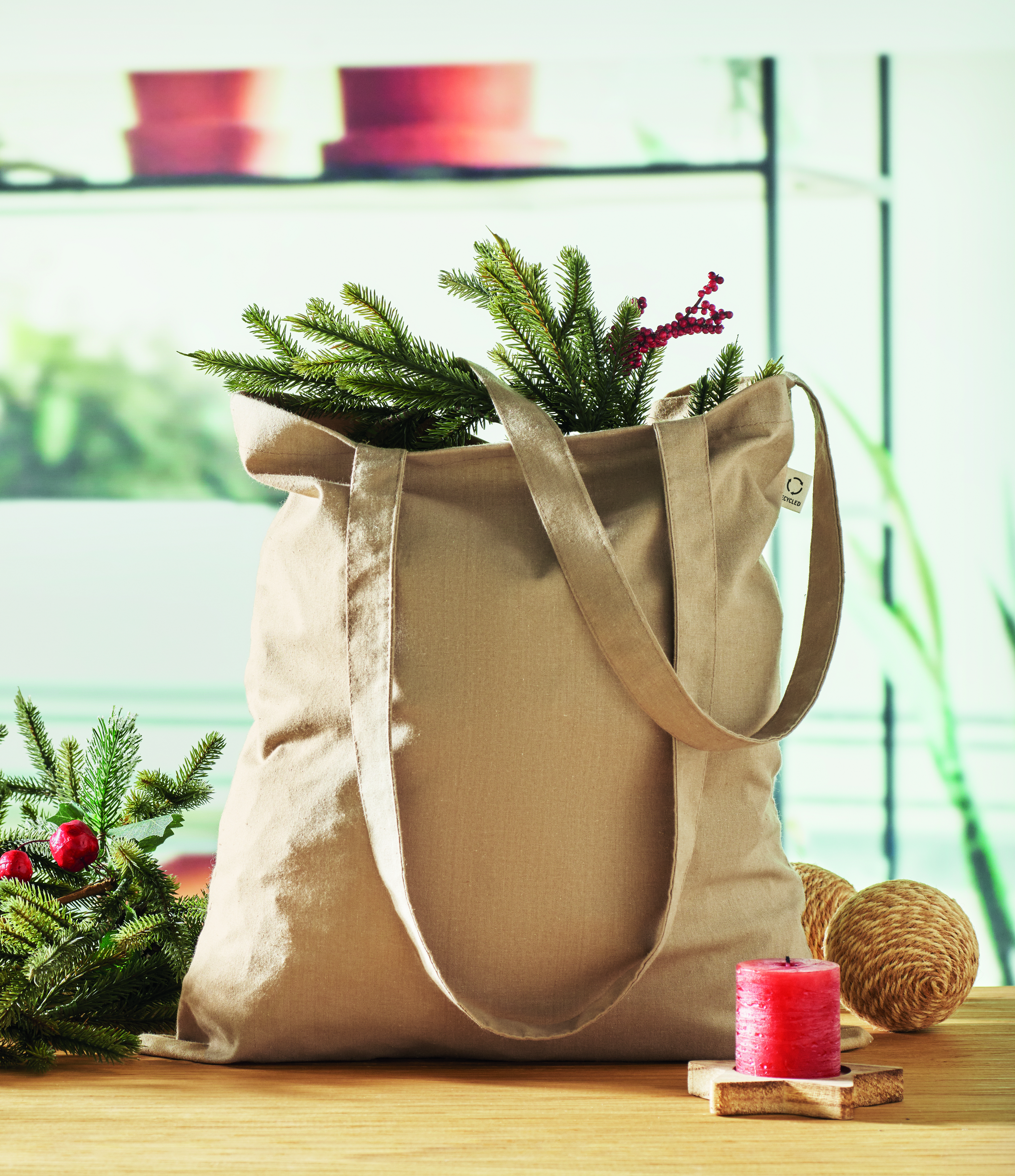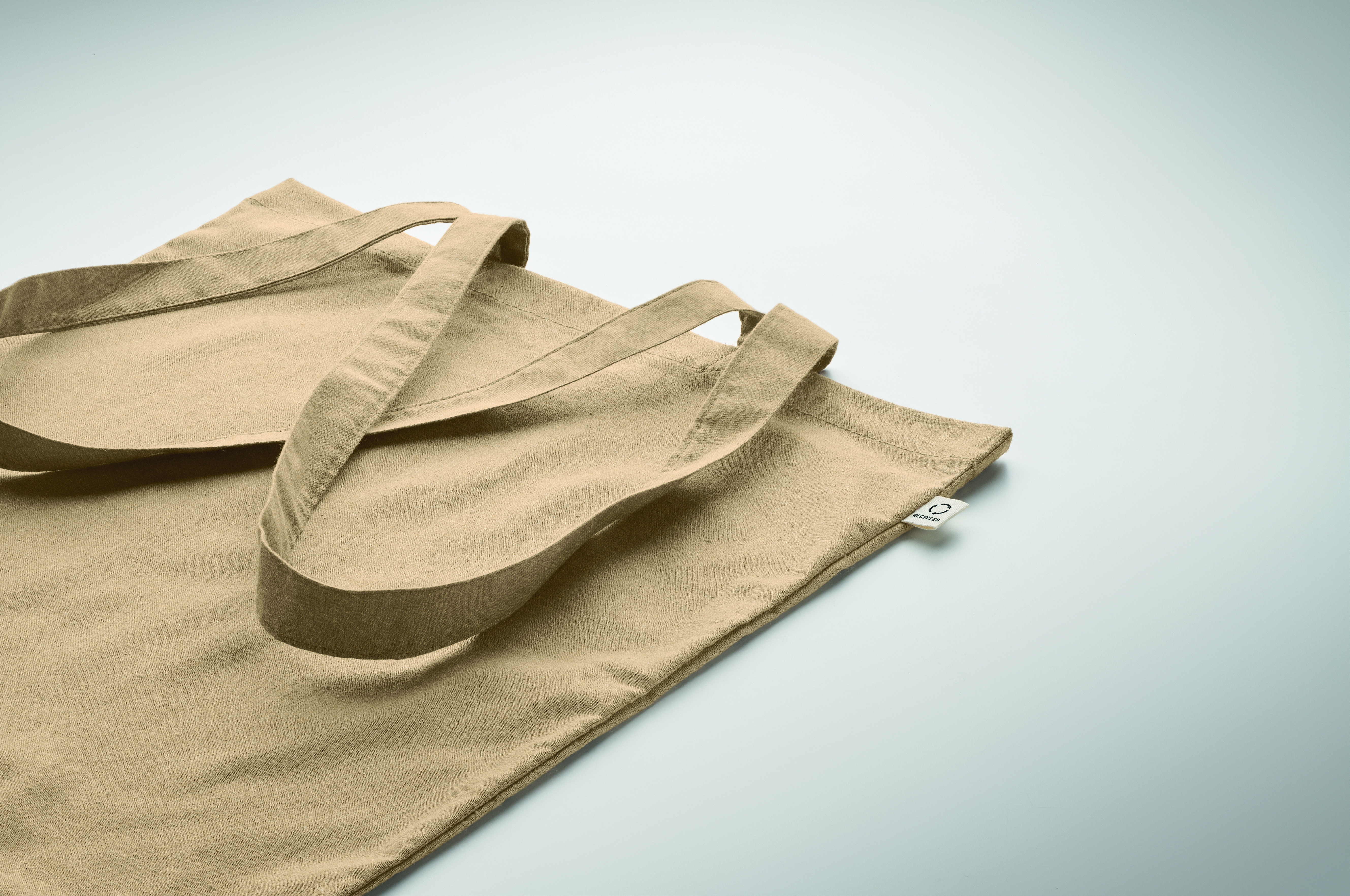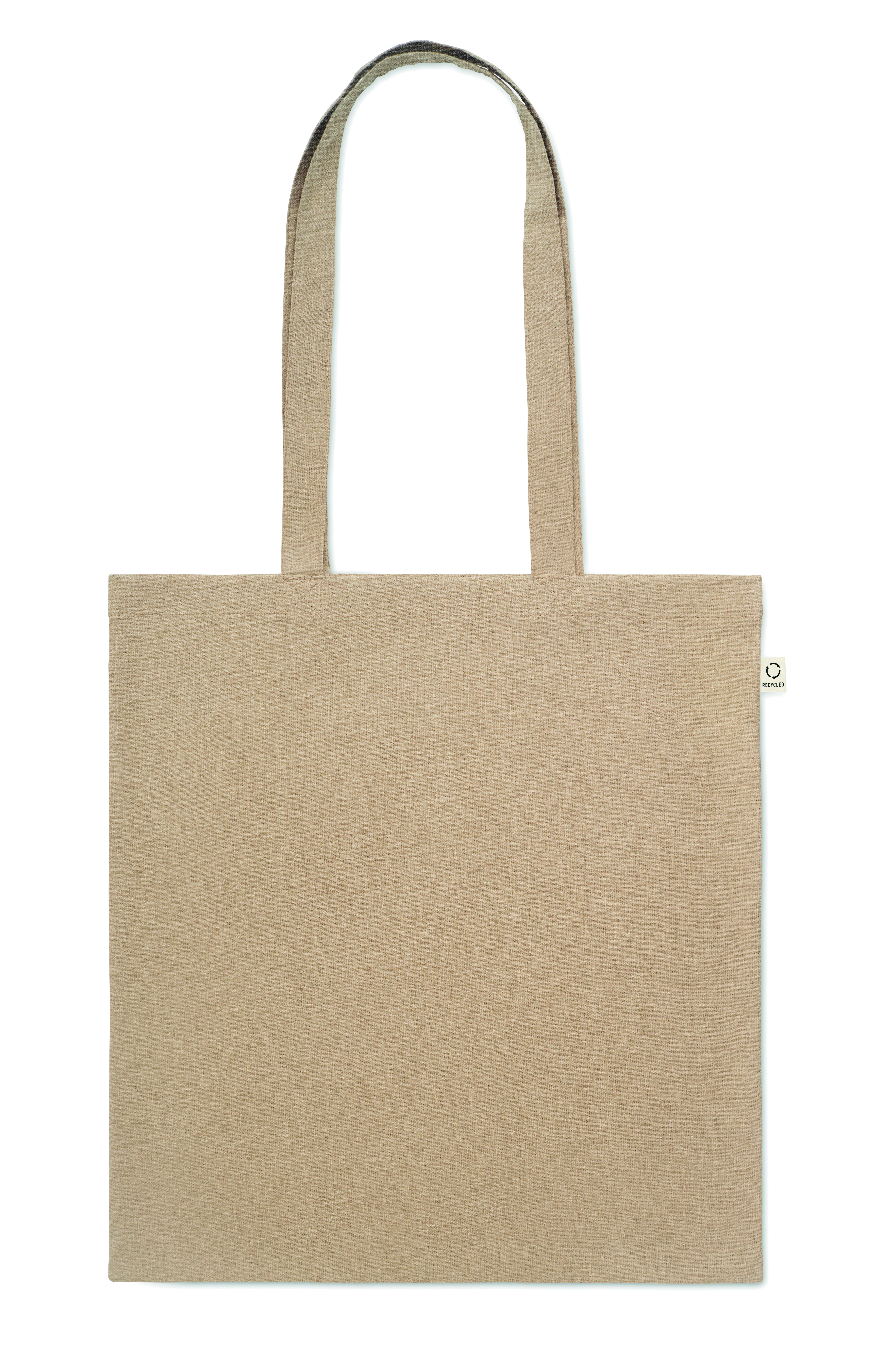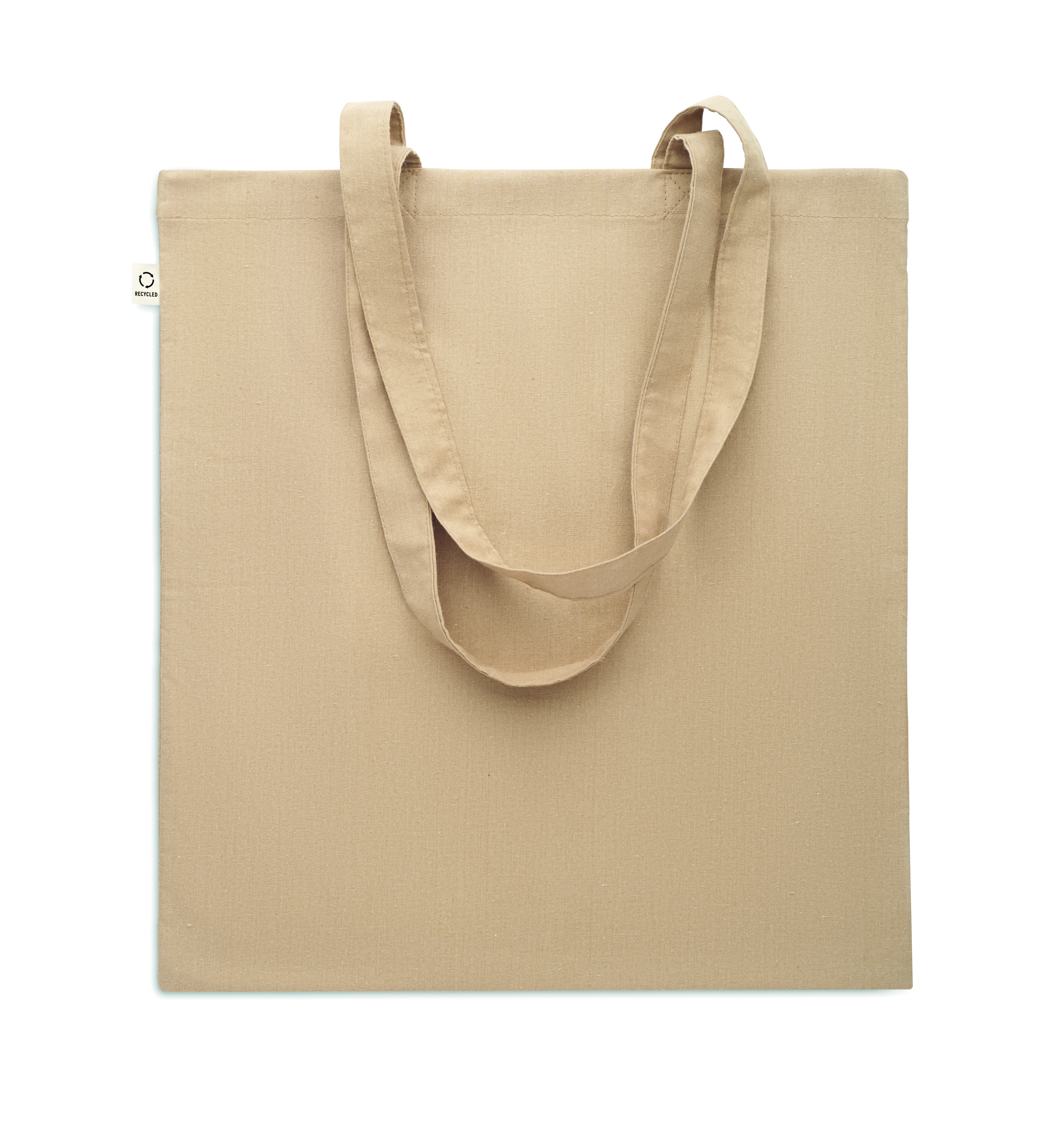 Einkaufstasche aus recycelter Post-Consumer-Baumwolle (70 % recycelte Baumwolle und 30 % RPET) mit langen Tragegriffen. 140 g / m². Artikel kann nach dem Bedrucken schrumpfen.