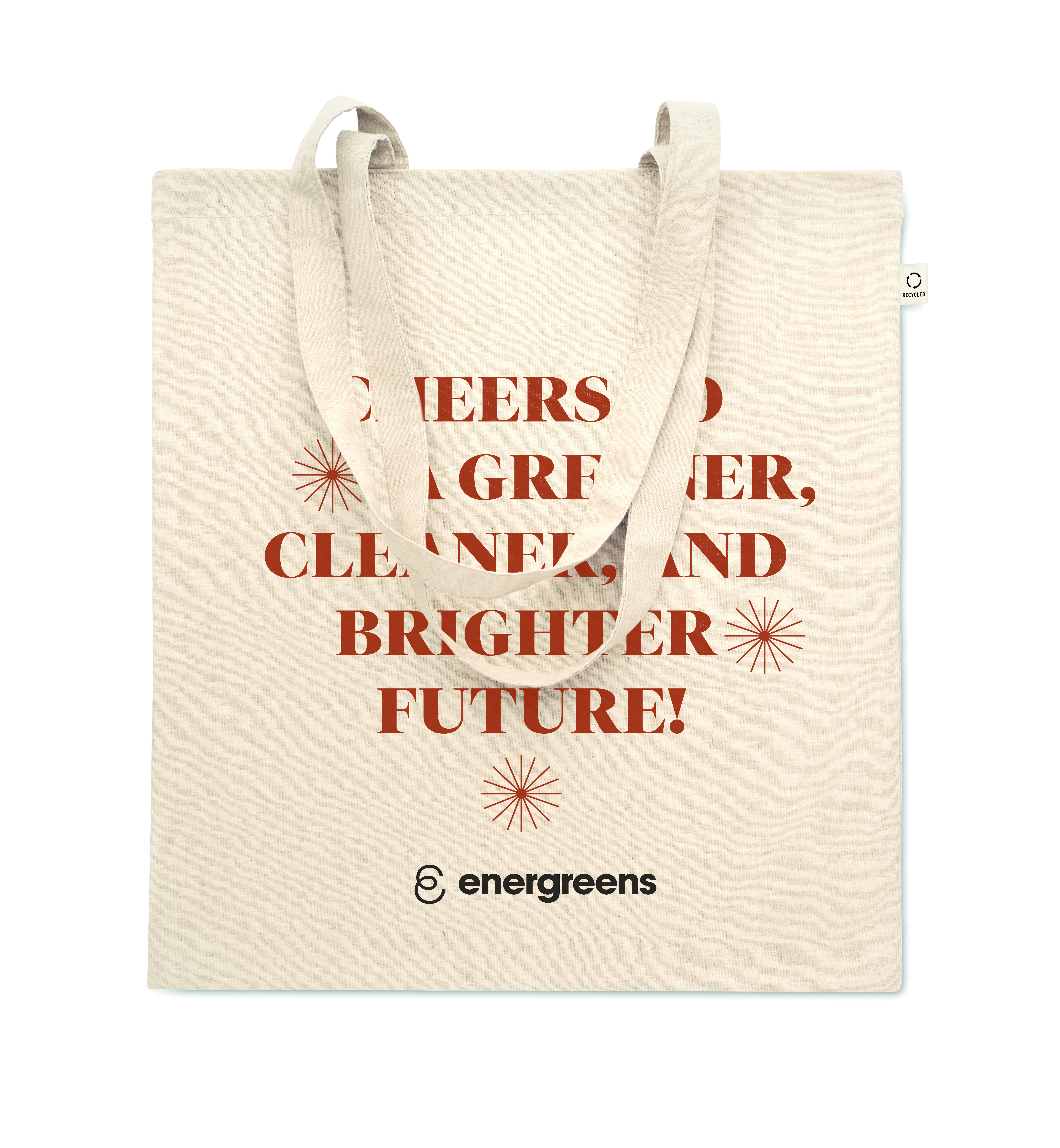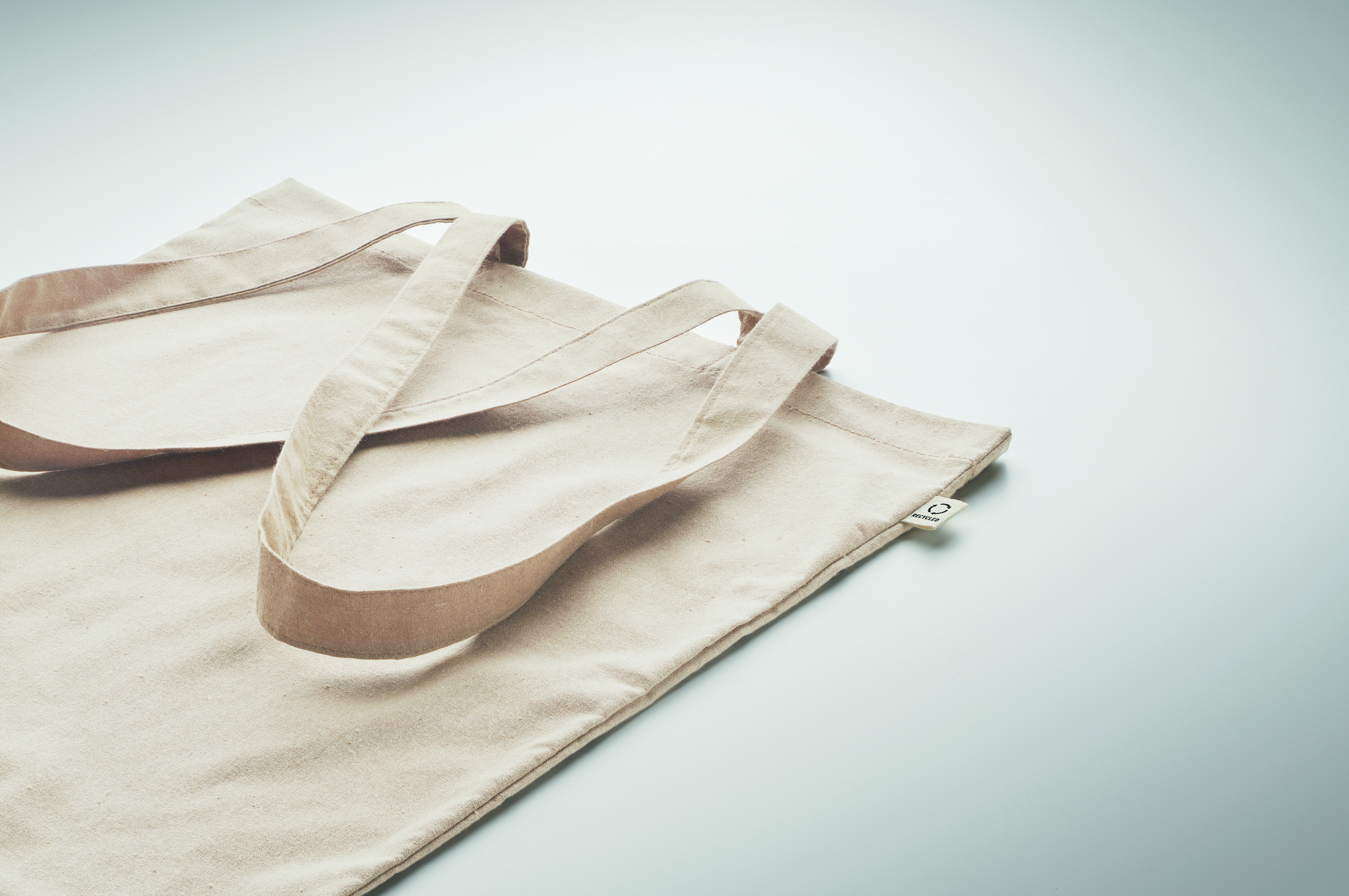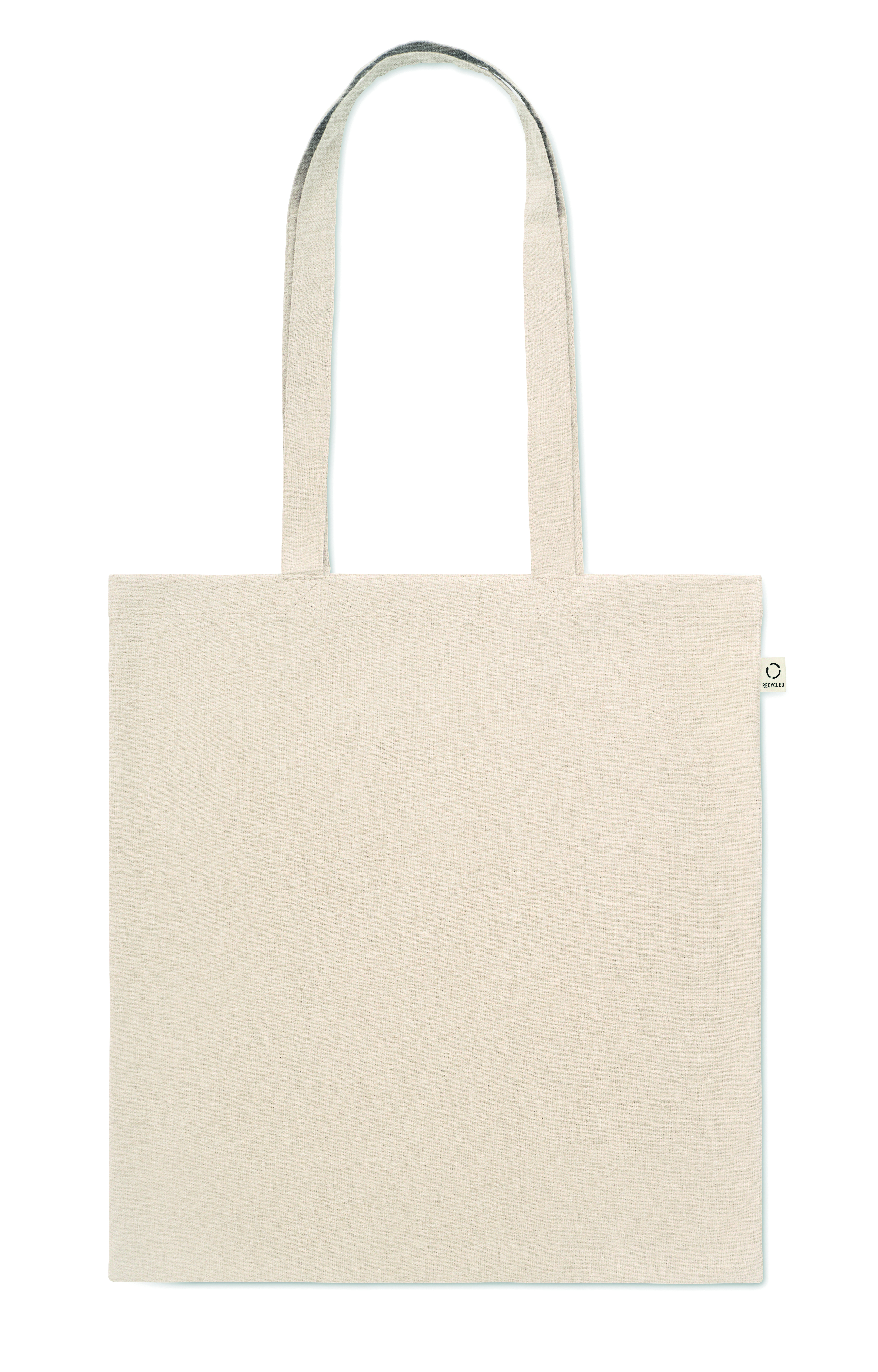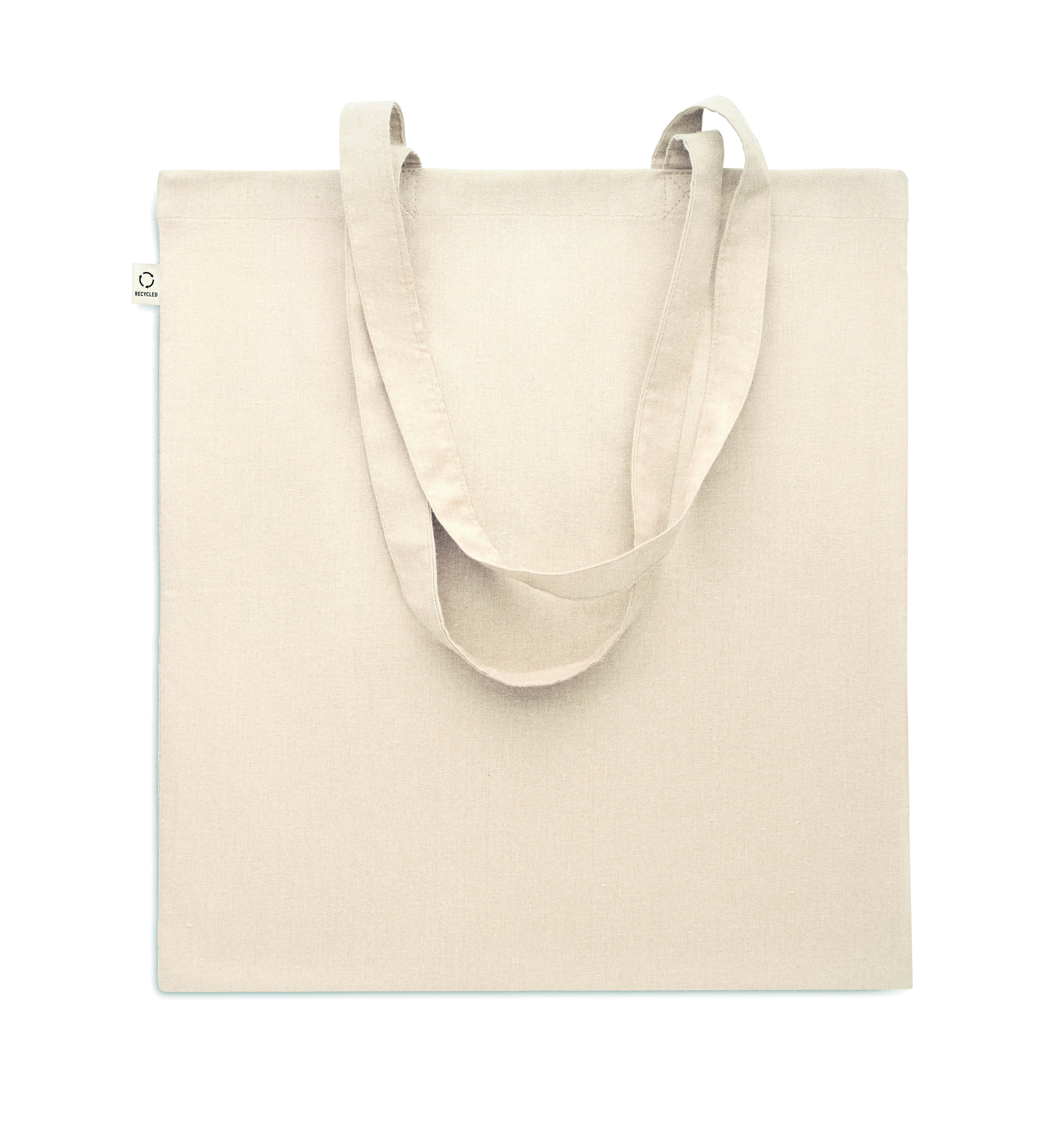 Einkaufstasche aus recycelter Post-Consumer-Baumwolle (70 % recycelte Baumwolle und 30 % RPET) mit langen Tragegriffen. 140 g / m². Artikel kann nach dem Bedrucken schrumpfen.