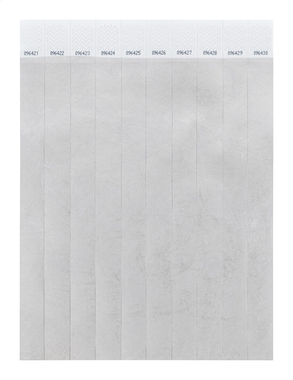 Ein Bogen mit 10 Tyvek-Armbändern, 19 mm breit, mit selbstklebendem Sicherheitsverschluss und fortlaufender Nummerierung.