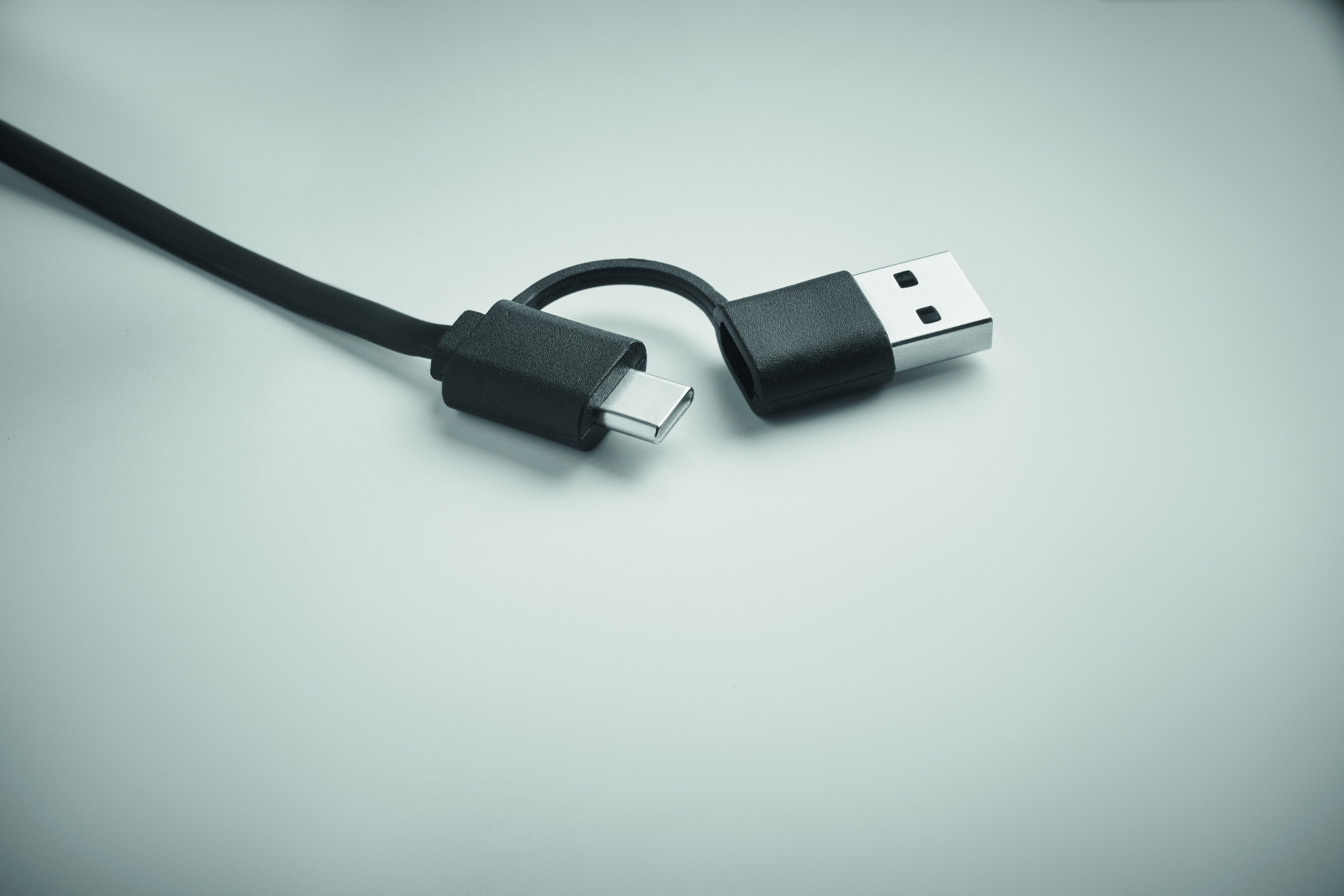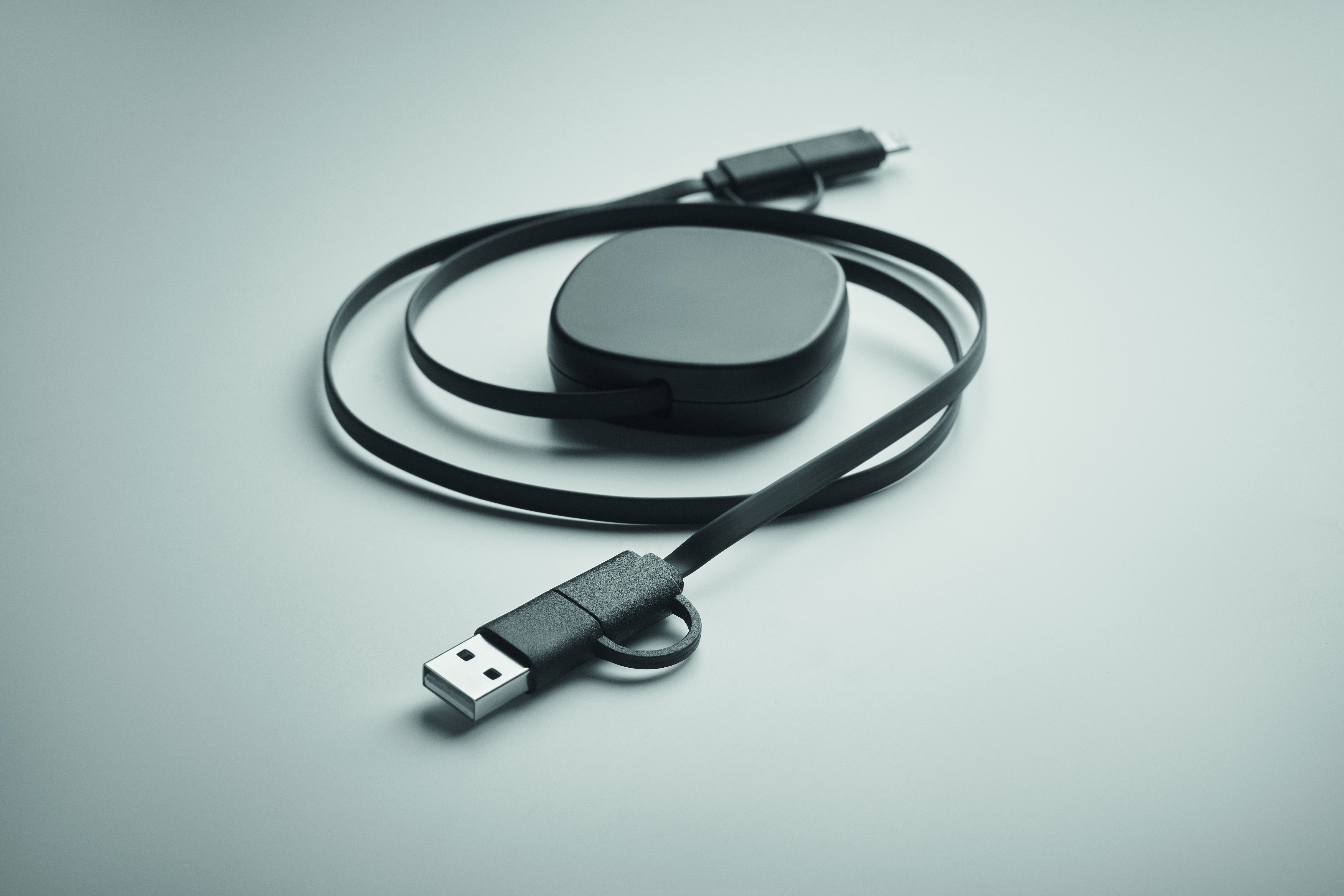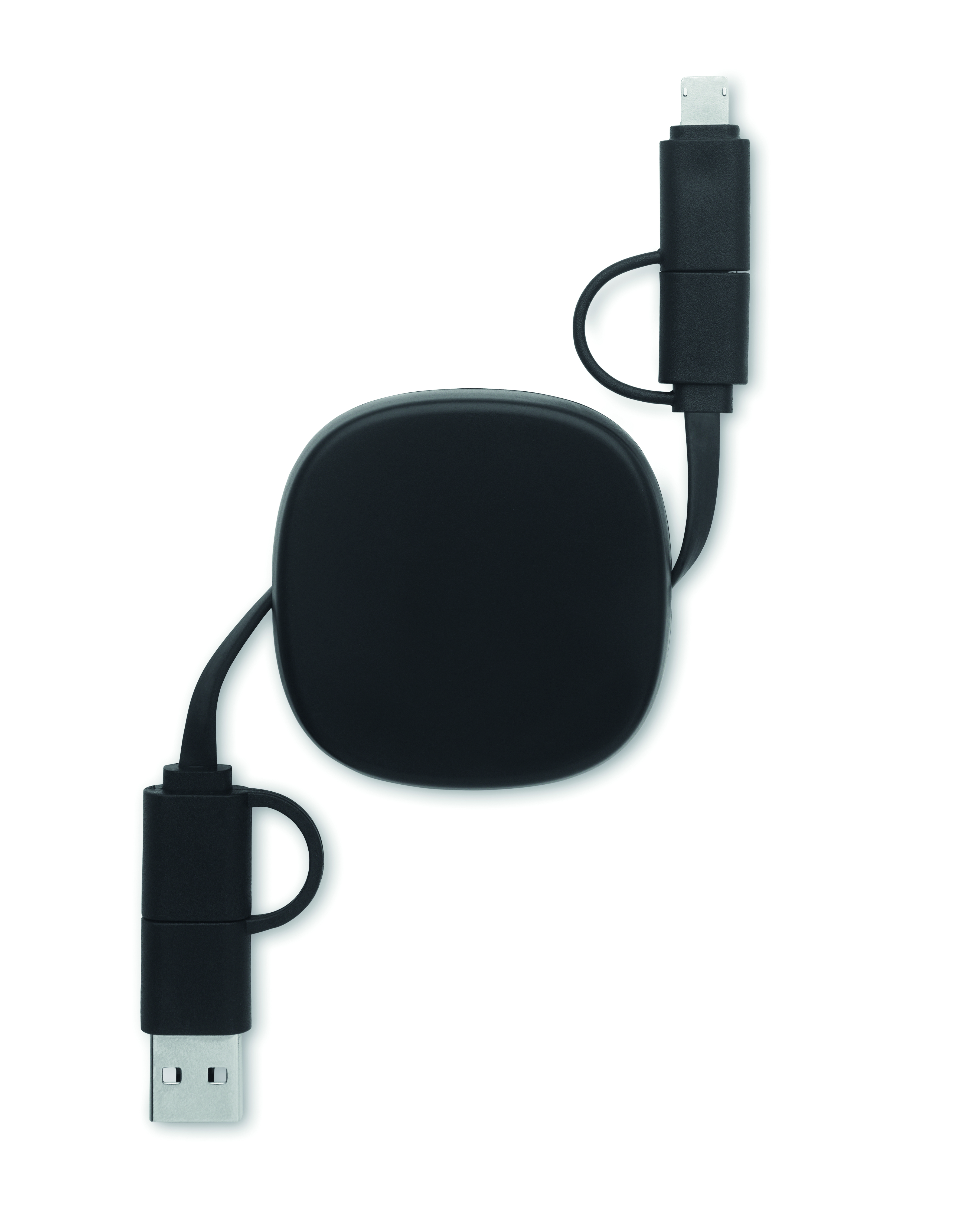 Einziehbares Ladekabel 60W. Gehäuse aus recyceltem ABS. Eingang: 2in1 Typ-C und Typ-A. Ausgang: Typ-C und Mikro-B (2 in 1 Pin). Kabellänge: 80 cm.