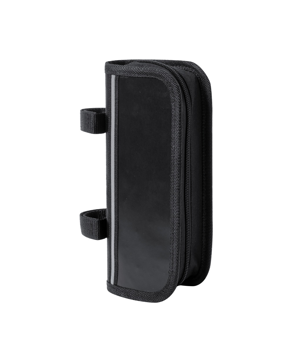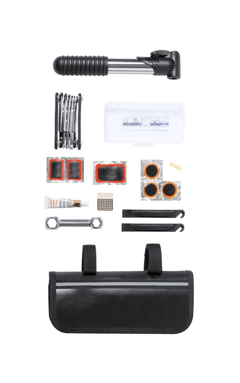 Fahrrad-Reparaturset im praktischem Fahrradrahmenetui (600D Polyester). Beinhaltet: Multitool mit 15 Funktionen, Sechskantschlüssel, Mini-Pumpe und Reifenpannen-Reparaturkit (2 Reifenheber, Schleifpapier und 6 Reifenflicken).