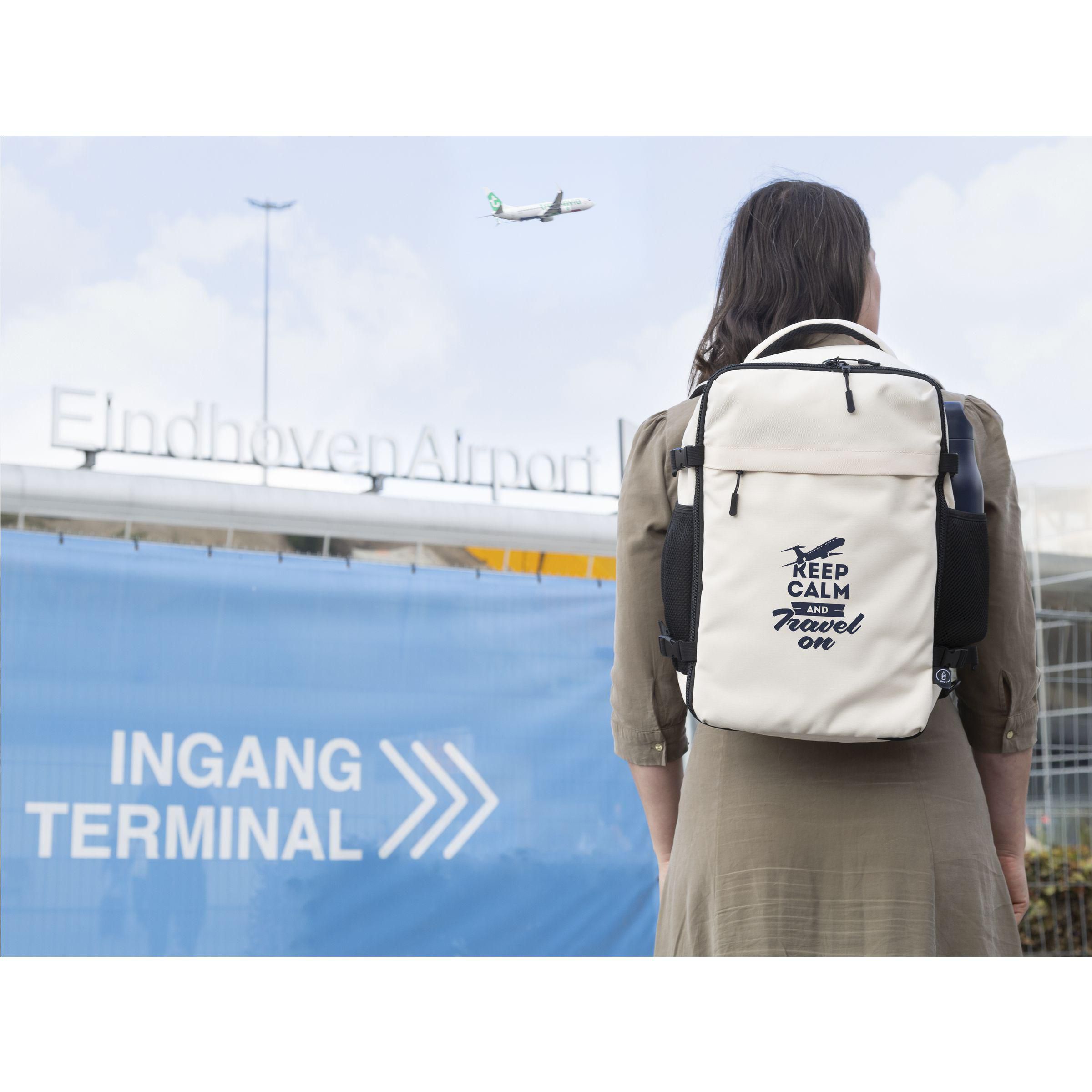 Dieser kompakte und vielseitige Cabin Flight Rucksack wurde als Handgepäck für alle Fluggesellschaften entwickelt. Er passt problemlos unter jeden Flugzeugsitz. Mit einem Fassungsvermögen von ca. 20 Litern bietet der Rucksack überraschend viel Stauraum, während sein geringes Gewicht für hohen Tragekomfort sorgt. Die Außenseite besteht aus robustem recyceltem RPET 900D-Polyester. Komplett gefüttert mit recyceltem RPET 210D-Polyester.Das geräumige Hauptfach mit Reißverschluss und doppelten Schiebern ist ideal für Kleidung und verfügt über einen praktischen Organizer für Telefon, persönliche Dokumente und andere wichtige Dinge. Ein zusätzliches gepolstertes Laptopfach bietet sicheren Schutz für Laptops bis zu 15,6 Zoll. Die Tasche hat auf beiden Seiten elastische Netztaschen, ideal für eine Wasserflasche oder kleine Accessoires. Auf der Rückseite befindet sich ein zusätzliches Reißverschlussfach. Die Schultergurte sind oben in diesem Reißverschlussfach befestigt und unten mit einem Karabinerhaken verschlossen. Durch Lösen der Haken können die Gurte vollständig im Reißverschlussfach verstaut werden, wodurch die Tasche noch kompakter wird.Die verstellbaren, gepolsterten Schultergurte, das gepolsterte Rückenteil und der stabile Griff mit Mesh-Futter sorgen für optimalen Tragekomfort, auch auf längeren Reisen. Inklusive abnehmbarem Schultergurt. Ein integrierter Trolley-Gurt erleichtert das Befestigen des Rucksacks an einem Koffer. Dieser Rucksack ist der perfekte Begleiter für jede Flugreise. GRS-zertifiziert. Gesamtes recyceltes Material: 50%.