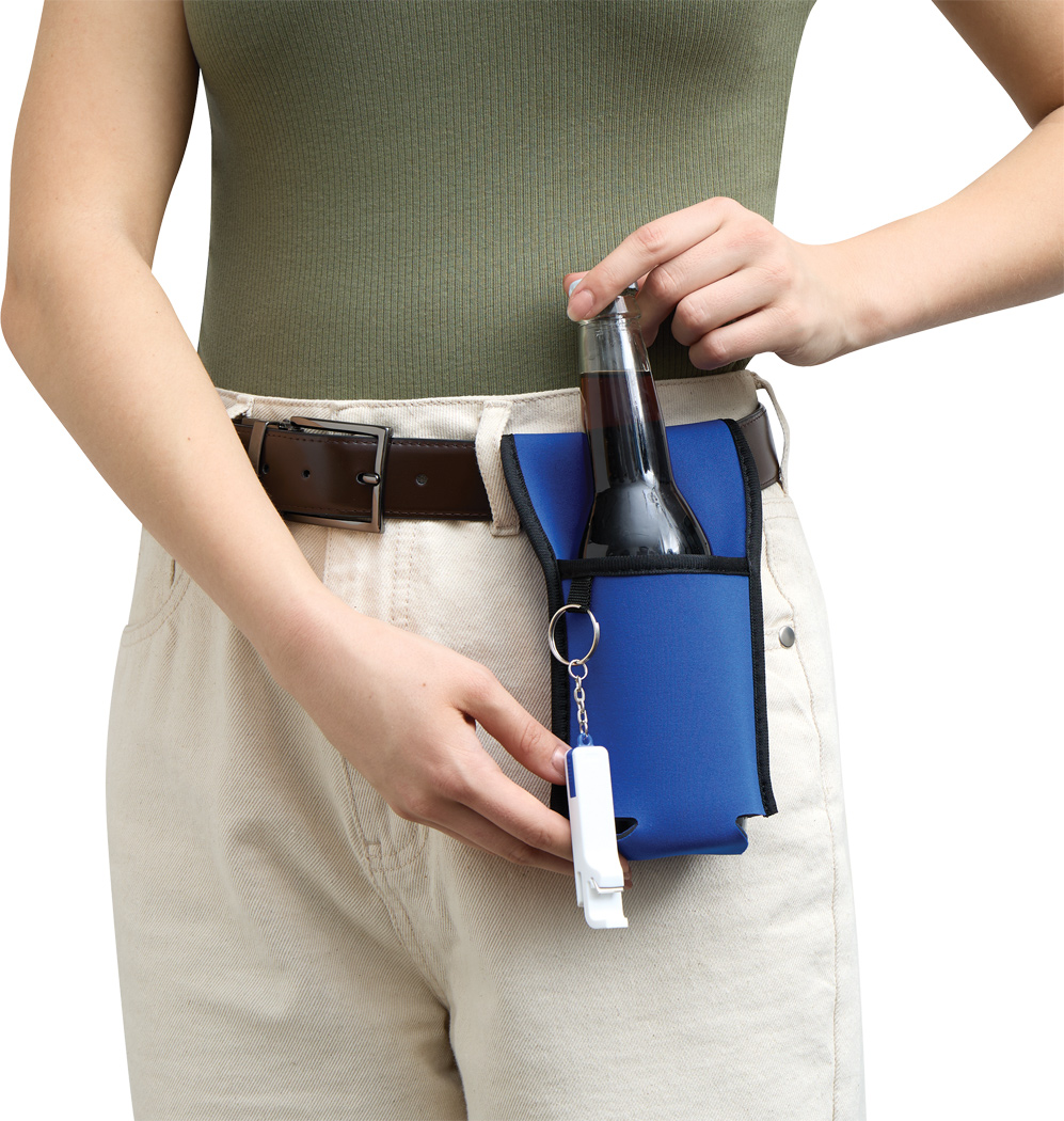 Flaschenhalter COOL HIKING in Neopren-Optik: geeignet für Flaschen und Dosen mit einem Durchmesser von ca. 7 cm – mit Klettverschluss zum Befestigen an Gürtel, Fahrradlenker und Kinderwagen, extra Schlaufe für einen Flaschenöffner (exklusive) oder Schlüssel, Manschette mit exponierter Werbefläche
