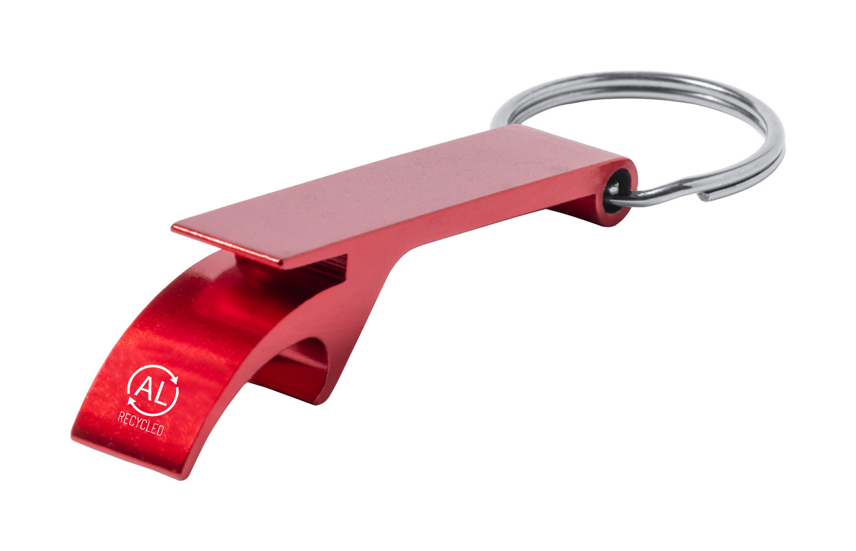 Flaschen- und Dosenöffner aus recyceltem Aluminium mit Schlüsselring aus Metall.