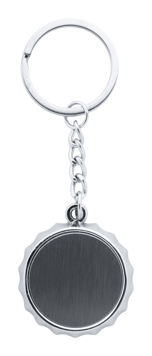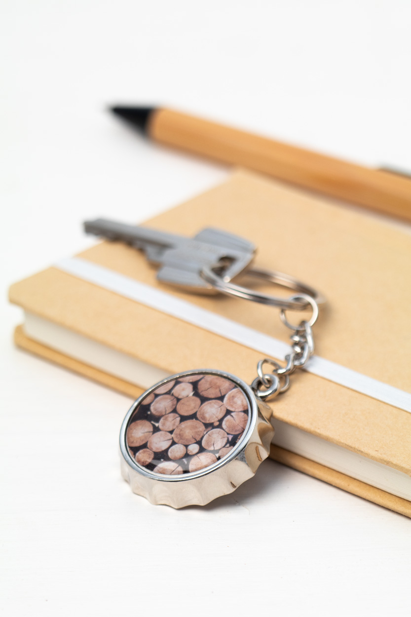 Schlüsselanhänger in Kronkorkenform mit Flaschenöffner. Ideal für Doming-Druck. Einzeln in schwarzer Geschenkbox.