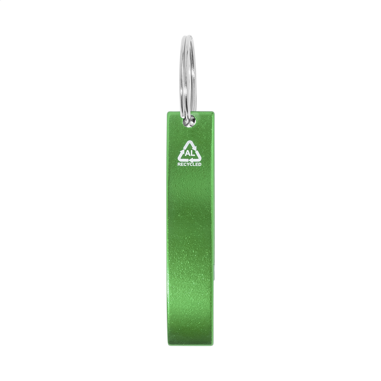 Flaschenöffner aus recyceltem Aluminium mit Schlüsselring aus Metall.