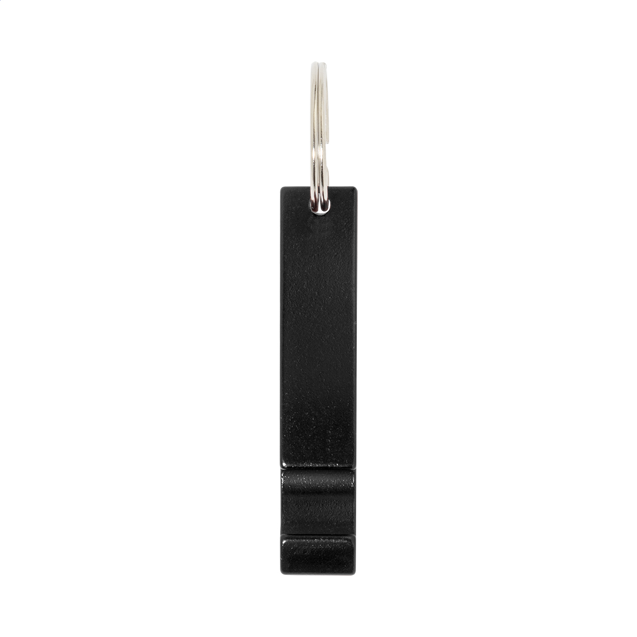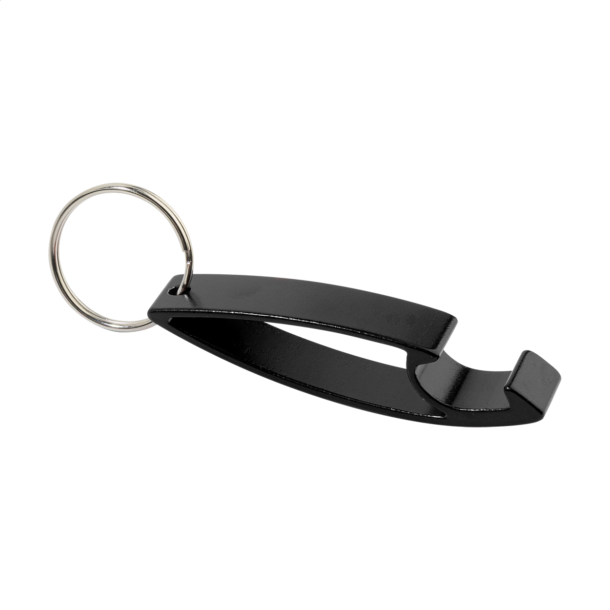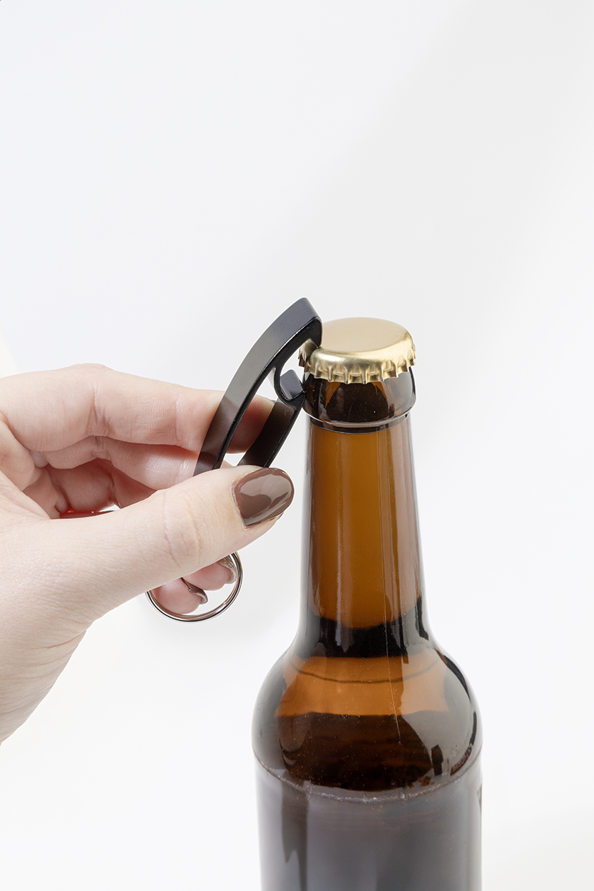 Flaschenöffner aus recyceltem Aluminium mit Schlüsselring aus Metall.