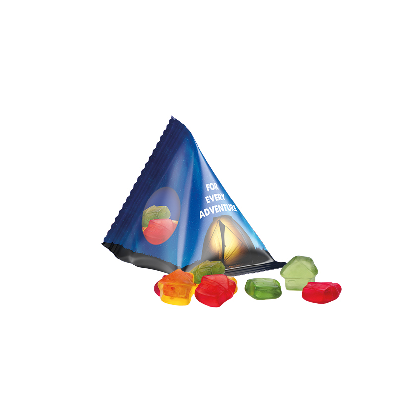 Fruchtgummi Tetraeder, Folie transparent, Trolli Fruchtgummi Haus als Werbegeschenk für Firmenkunden.