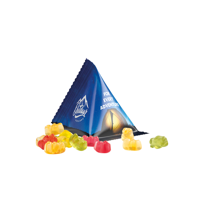 Trolli Fruchtgummi im Tetraeder aus weißer Folie, individuell bedruckt. Inhalt: Trolli Fruchtgummi Bärchen in Premium Qualität mit 10 % Fruchtsaftanteil, bunt gemischt, 15 g