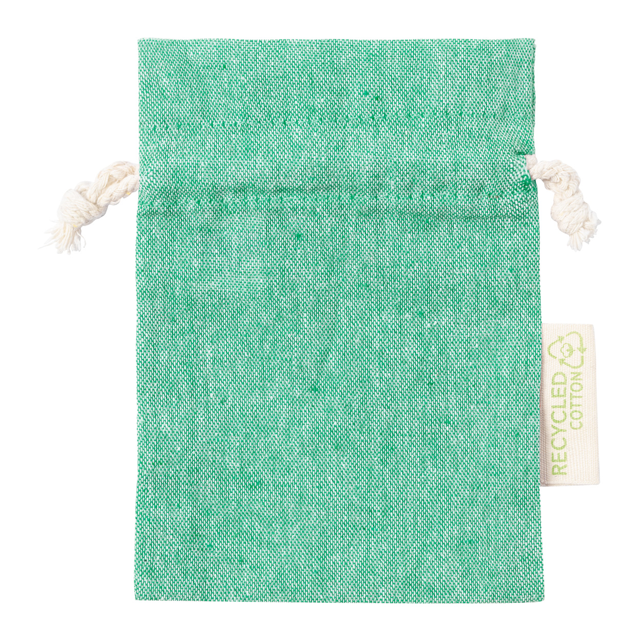 Geschenkbeutel aus recycelter Baumwolle mit Kordelzugverschluss. Mit Lable recycelte Baumwolle. Material: 100 % recycelte Baumwolle, 120 g/m².