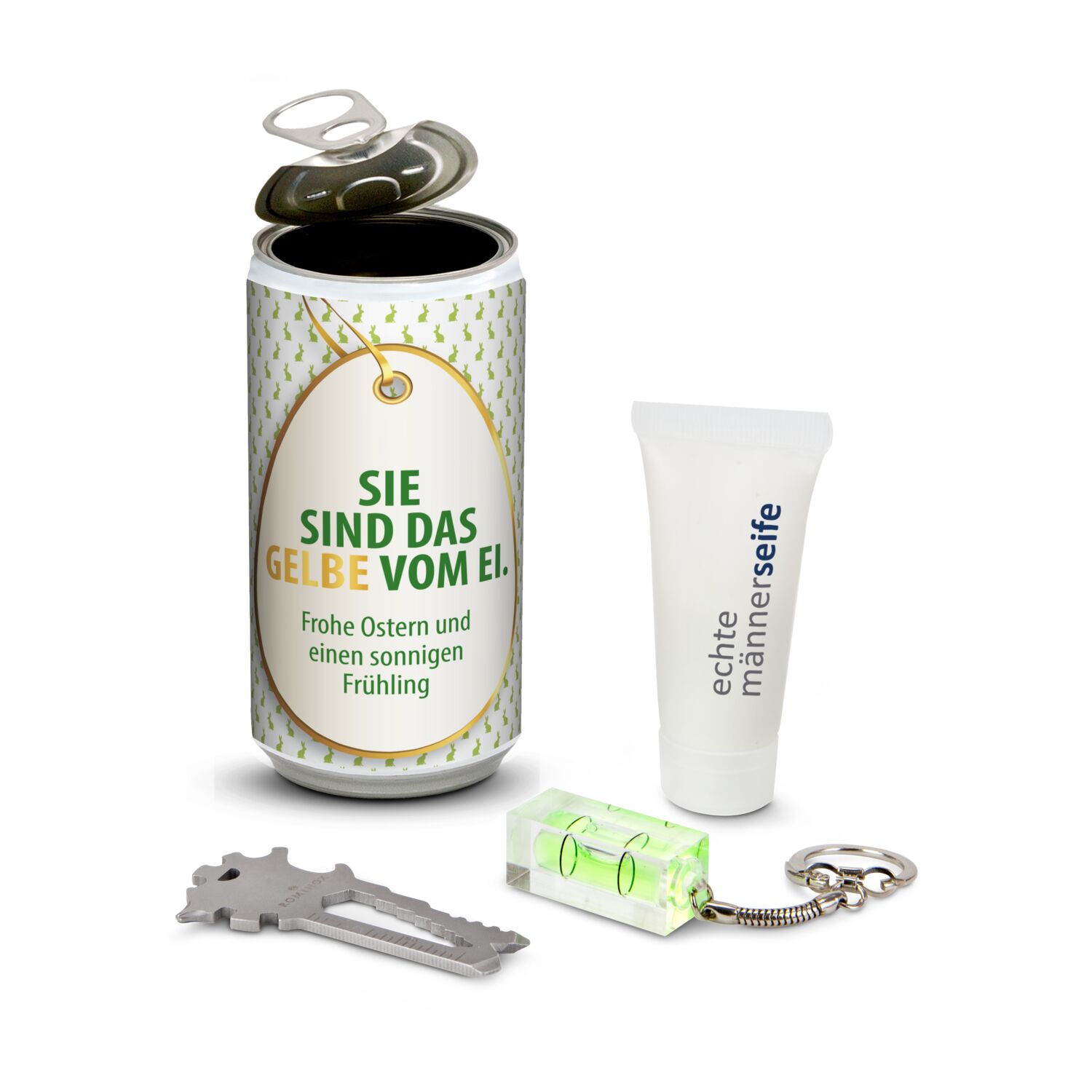 Produktinformationen "Geschenkset / Präsenteset: Männer-Geheimnis Ostern, das Nest in der Dose - Etikett Sie sind das Gelbe vom Ei"