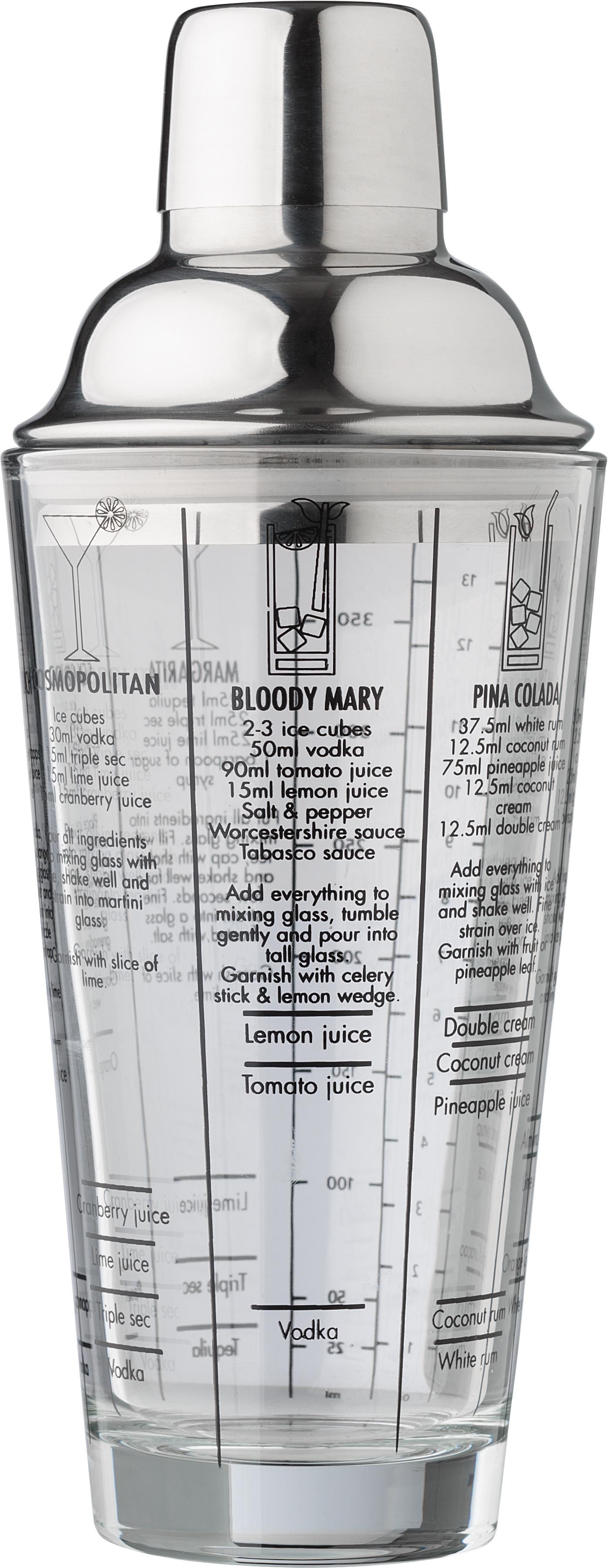 Cocktailshaker aus Glas (400 ml) mit Deckel aus Edelstahl (s / s304). Cocktailrezepte auf der Seite aufgedruckt. Einzeln verpackt in einer braunen Kartonbox.