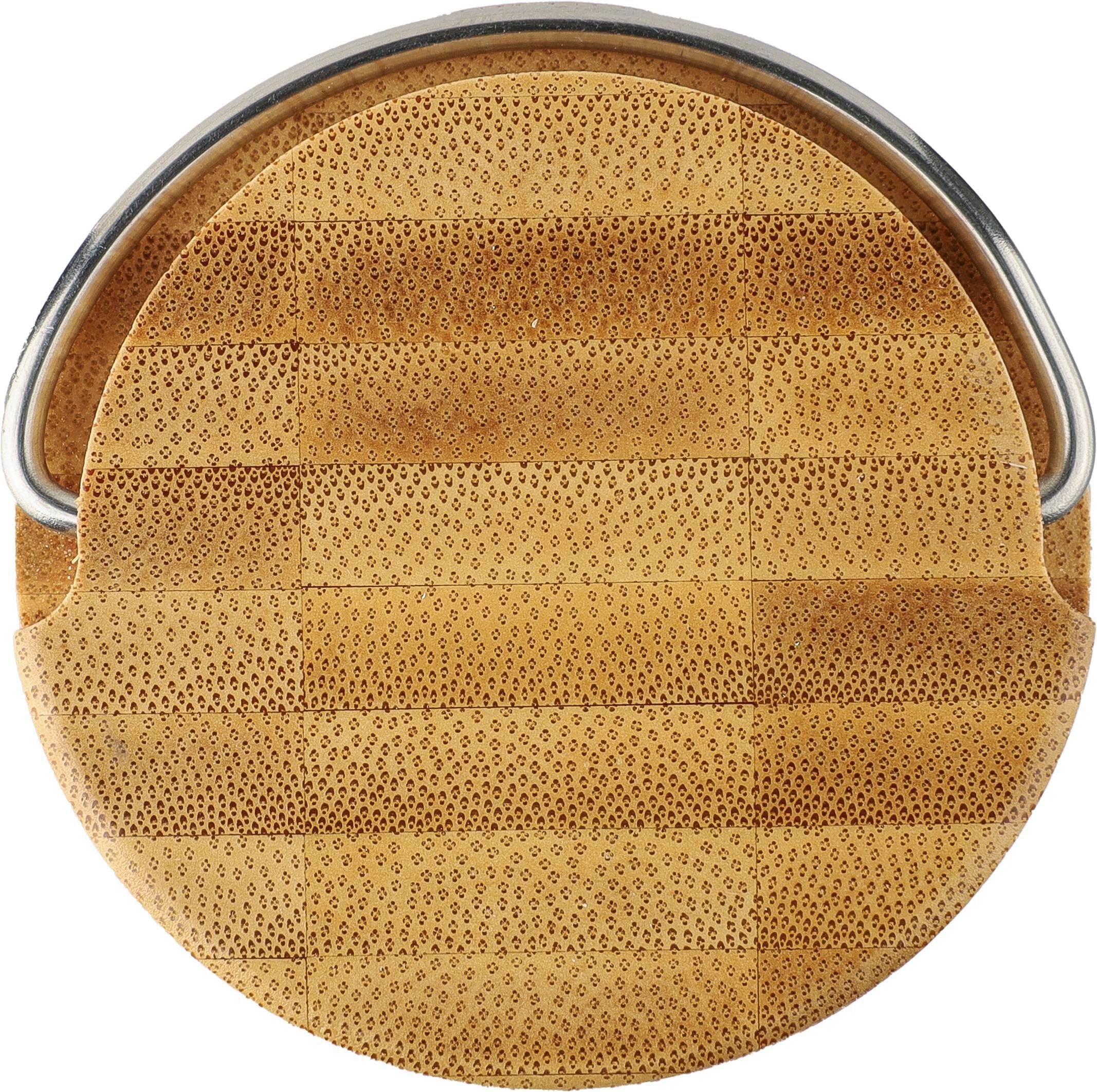 Trinkflasche aus Glas (500 ml) mit Bambusdeckel und Tragegriff aus Metall. Einzeln verpackt in einer braunen Pappschachtel.