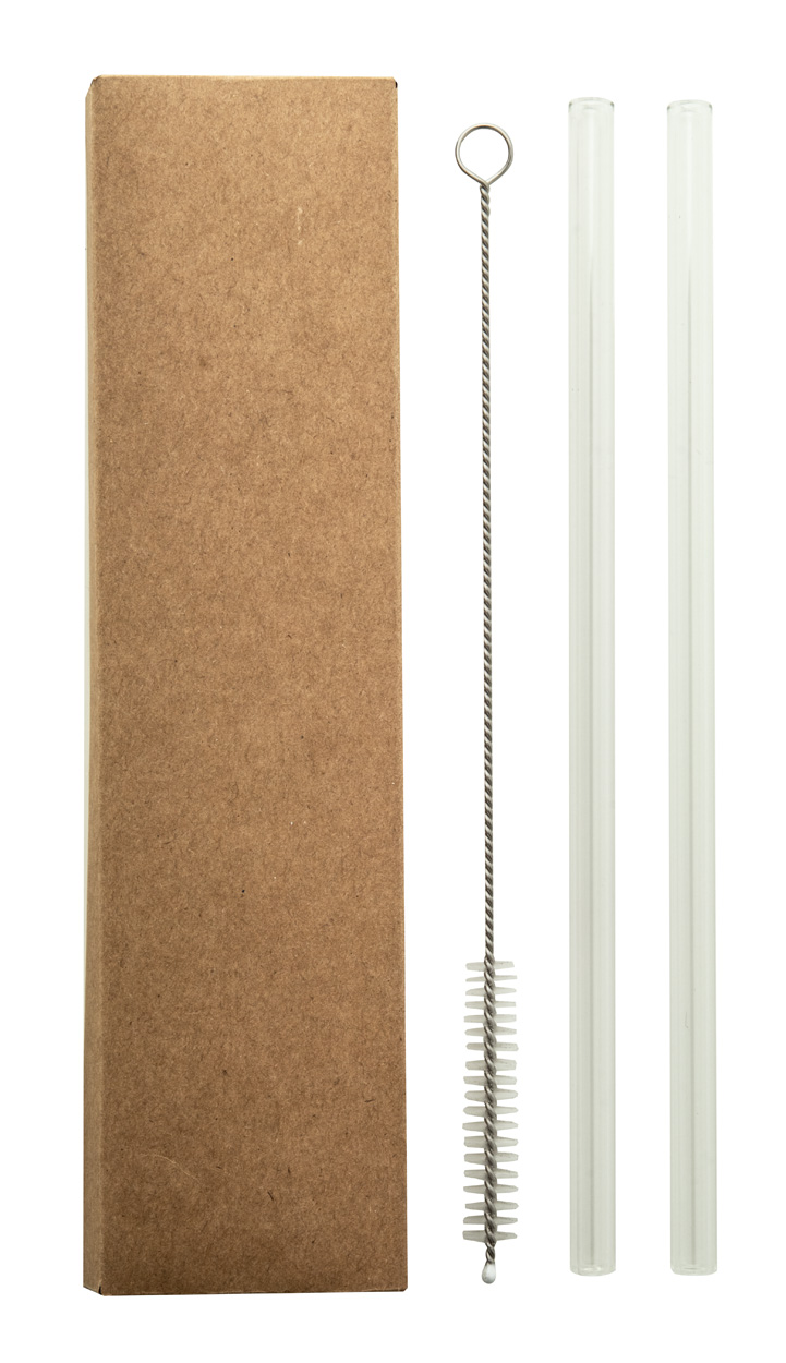 Set mit 2 wiederverwendbaren Borosilikatglastrinkhalmen und Reinigungsbürste. Verpackt in Pappschachtel.
