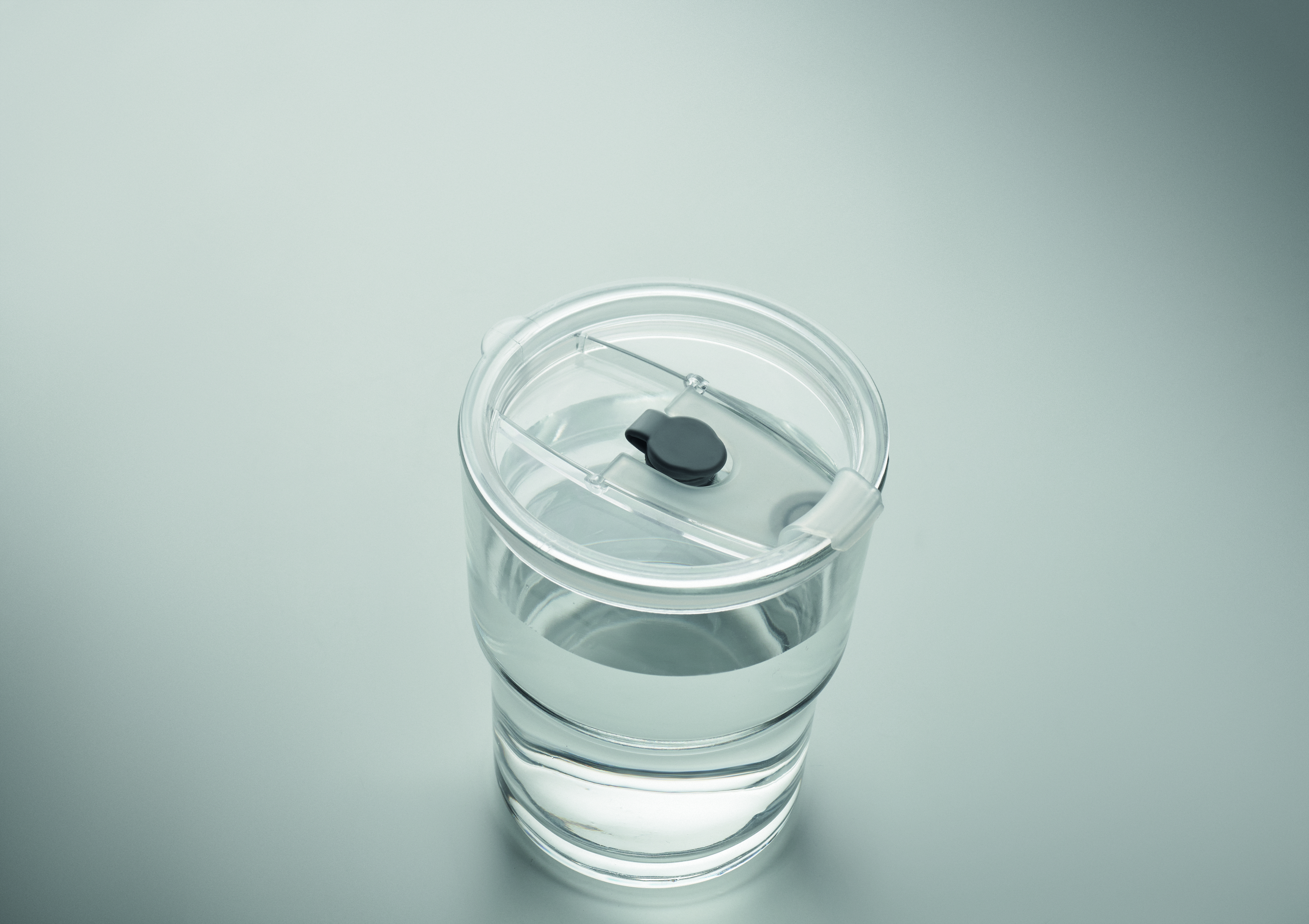 Becher aus Glas mit Deckel. Abnehmbarer Trinkhalm aus Glas und Trinköffnung. Auslaufsicher. Füllmenge: 300 ml.