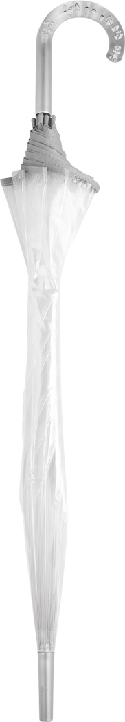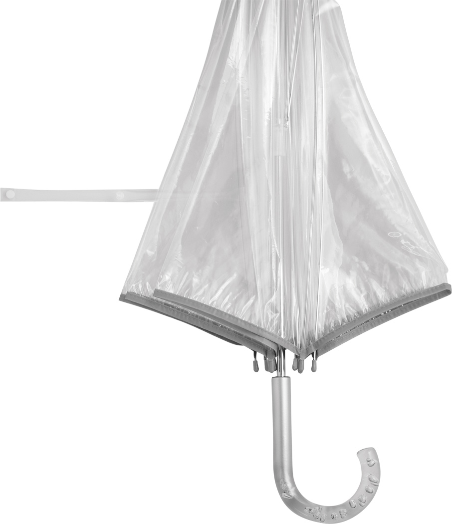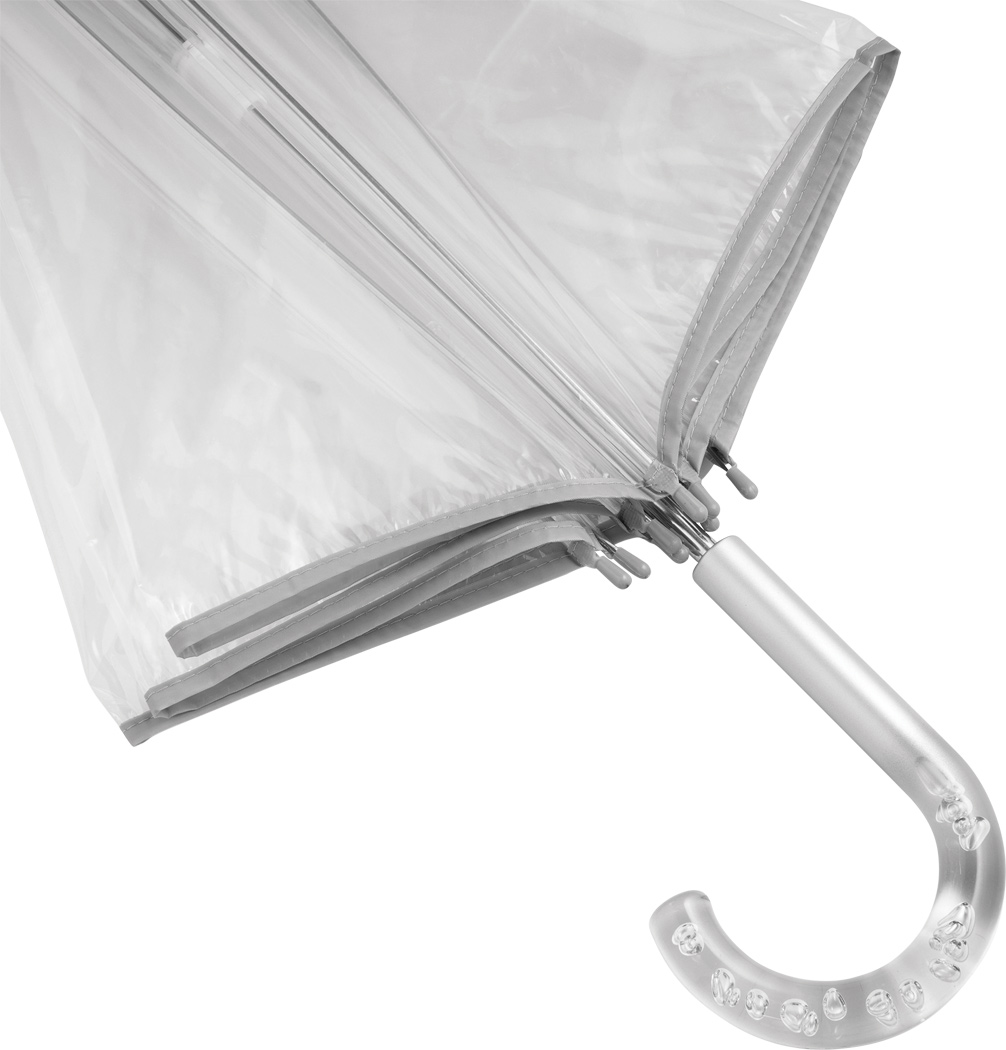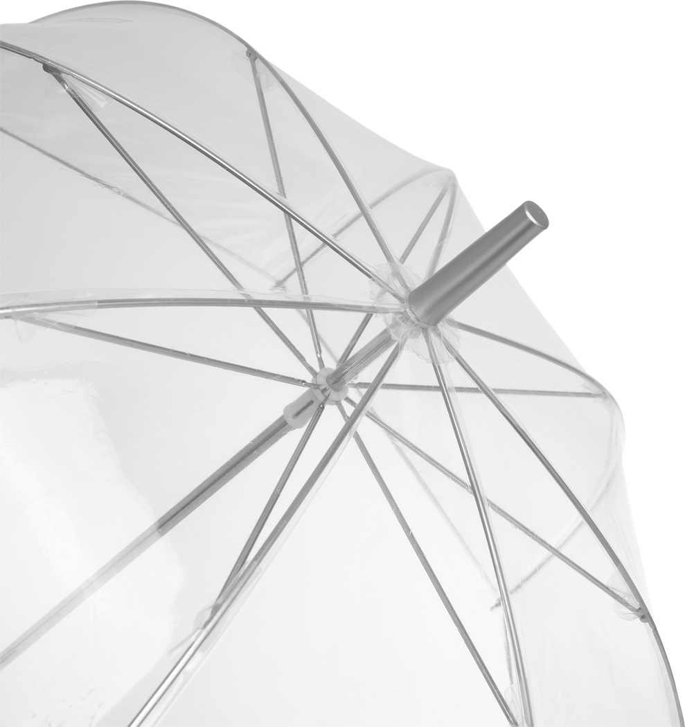 Glockenschirm BELLEVUE: Metallstock und -speichen, Kunststofftips und -spitze, transparenter Kunststoffgriff mit Luftblaseneffekt, transparente POE-Bespannung mit silberfarbener Paspelierung und Druckknopfverschluss
