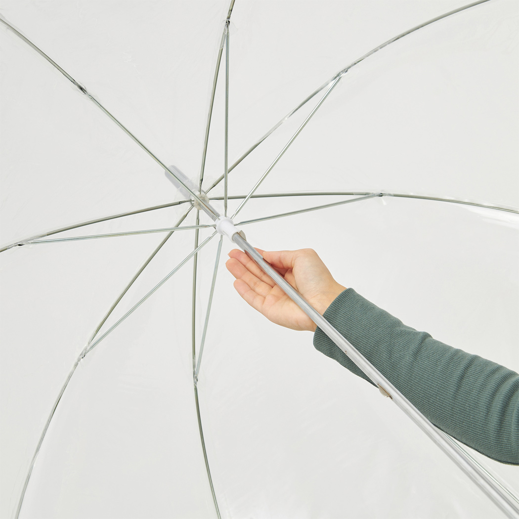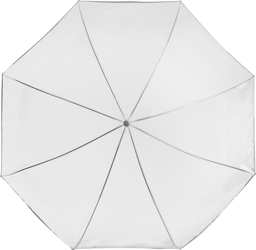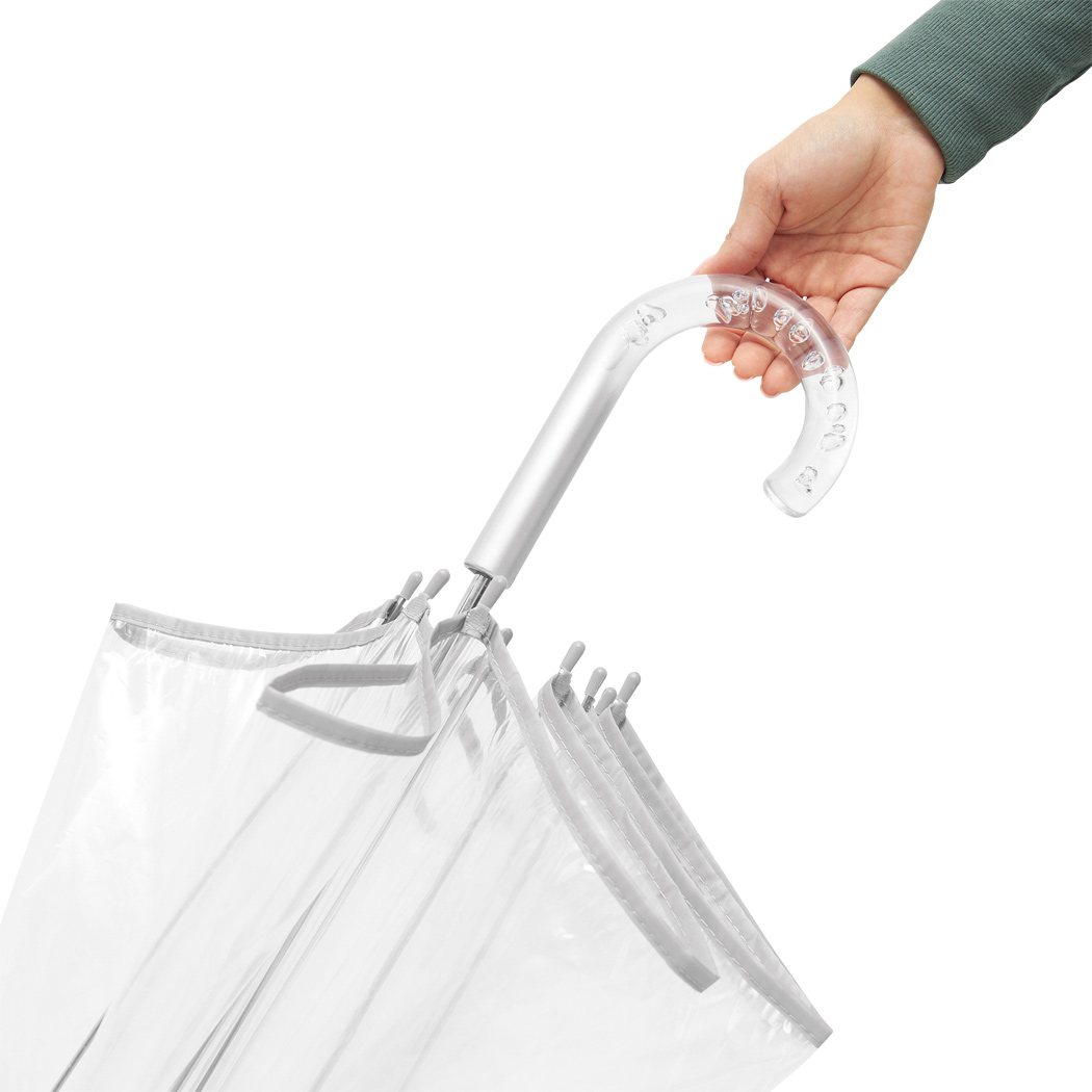 Glockenschirm BELLEVUE: Metallstock und -speichen, Kunststofftips und -spitze, transparenter Kunststoffgriff mit Luftblaseneffekt, transparente POE-Bespannung mit silberfarbener Paspelierung und Druckknopfverschluss