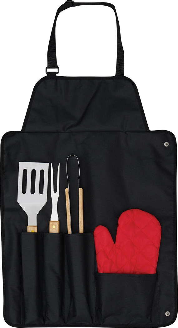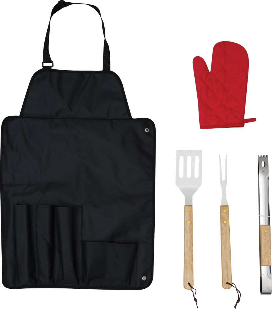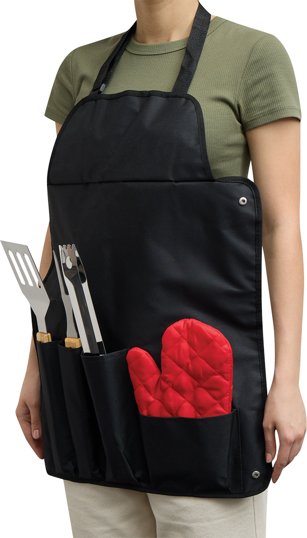 Grill-Schürze mit Grillbesteck GREAT BBQ: Edelstahl Grillzubehör mit Holzgriffen, Baumwoll-Ofen-Handschuh, verstellbarer Hals- und Bauchgurt, Schürze kann als praktische Tasche zusammengerollt werden