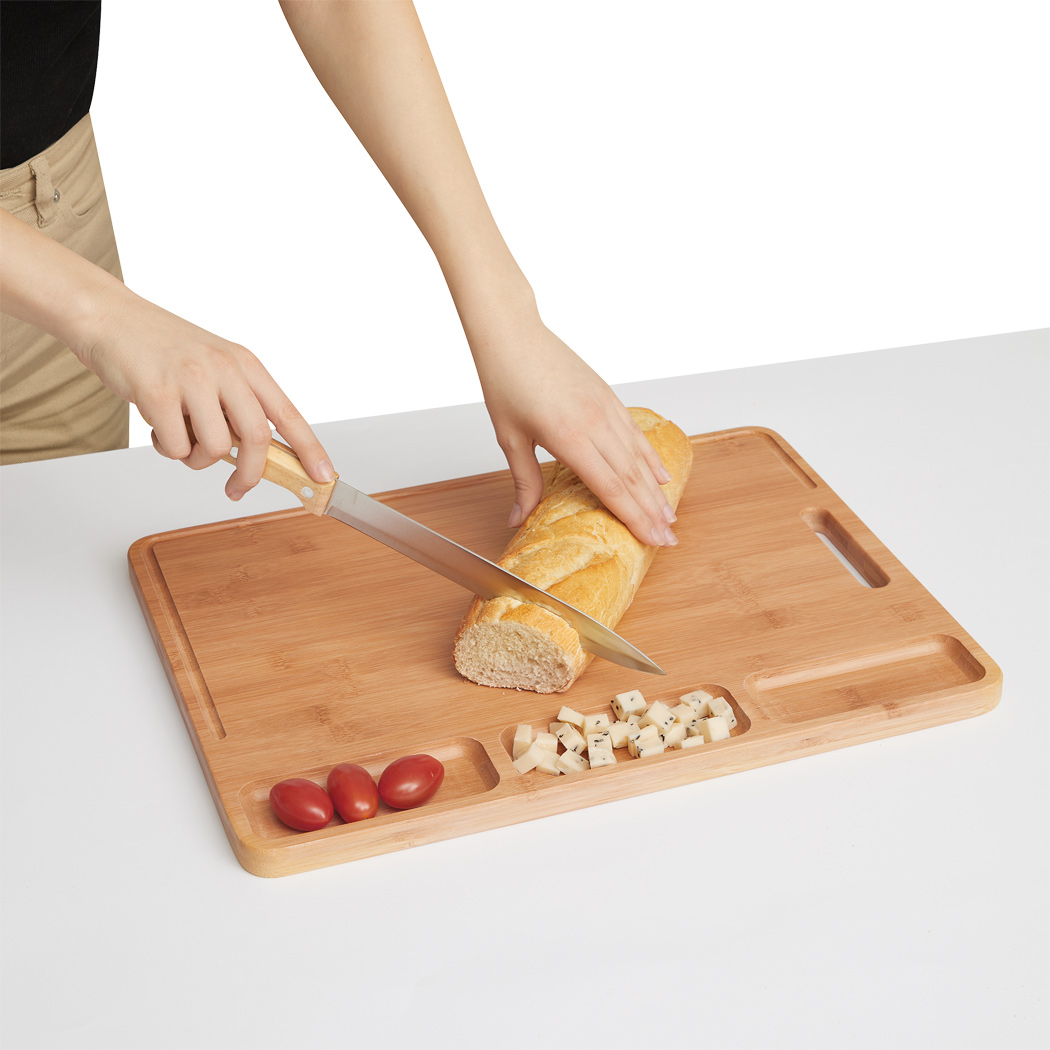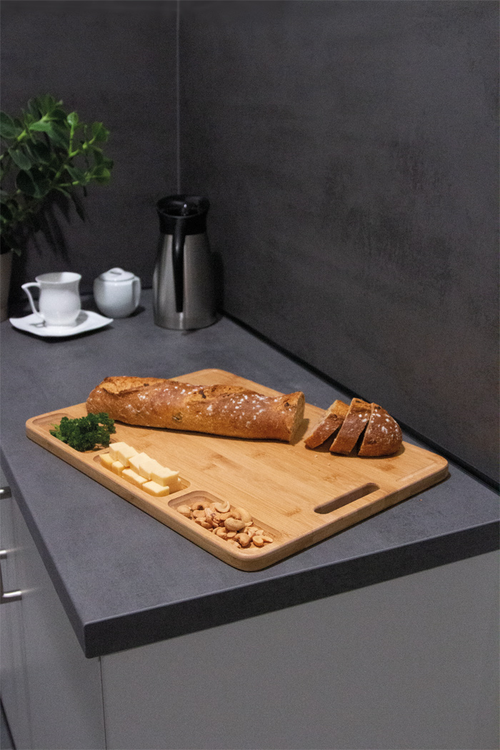 Großes Schneidebrett BAMBOO SERVING: aus Bambus, mit 3 integrierten Vertiefungen, praktischer Ablaufrille am Rand und Griff zum Aufhängen, in Box