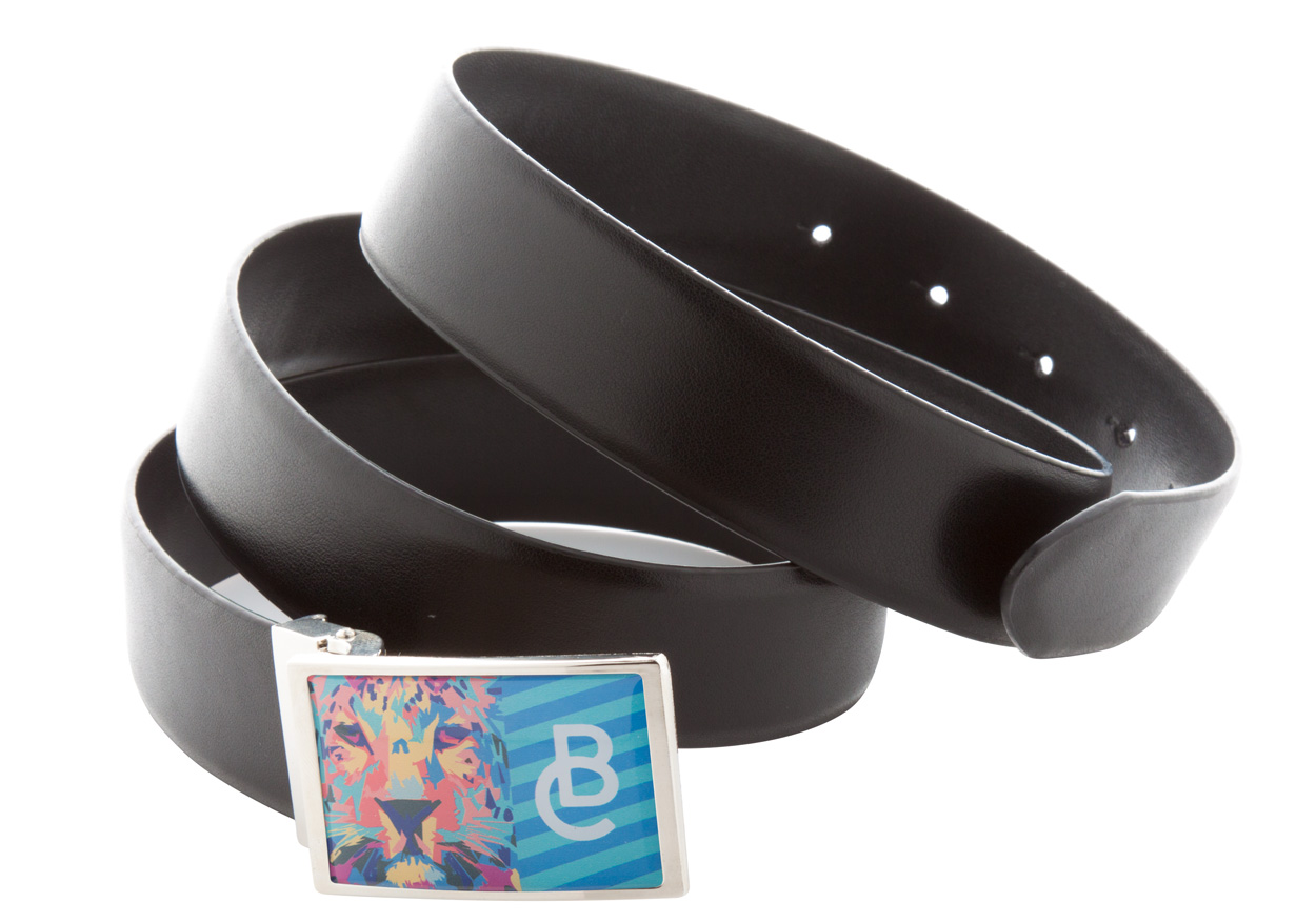 Ledergürtel mit Doming-Druck auf Metallschnalle. Preis inkl. Doming.