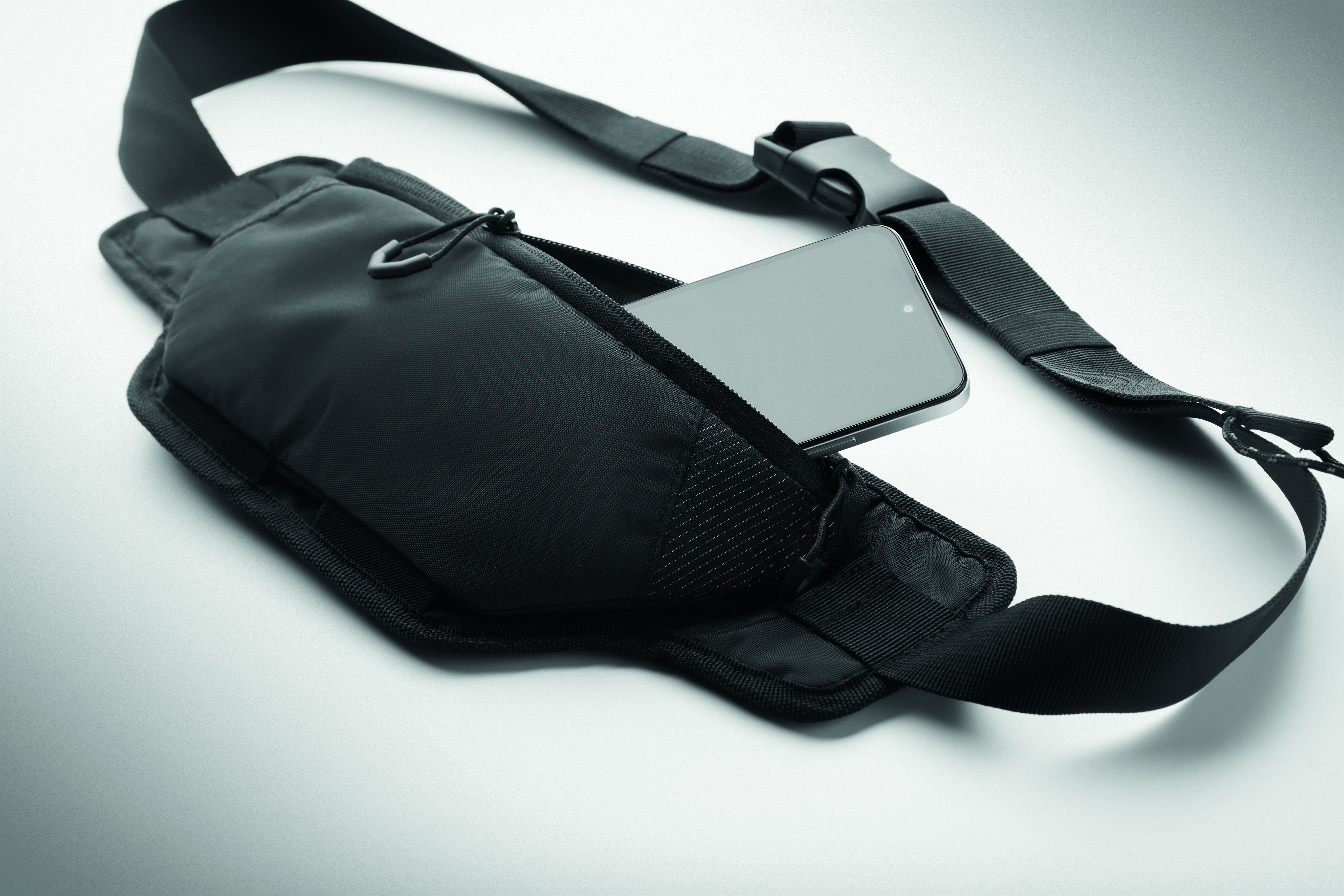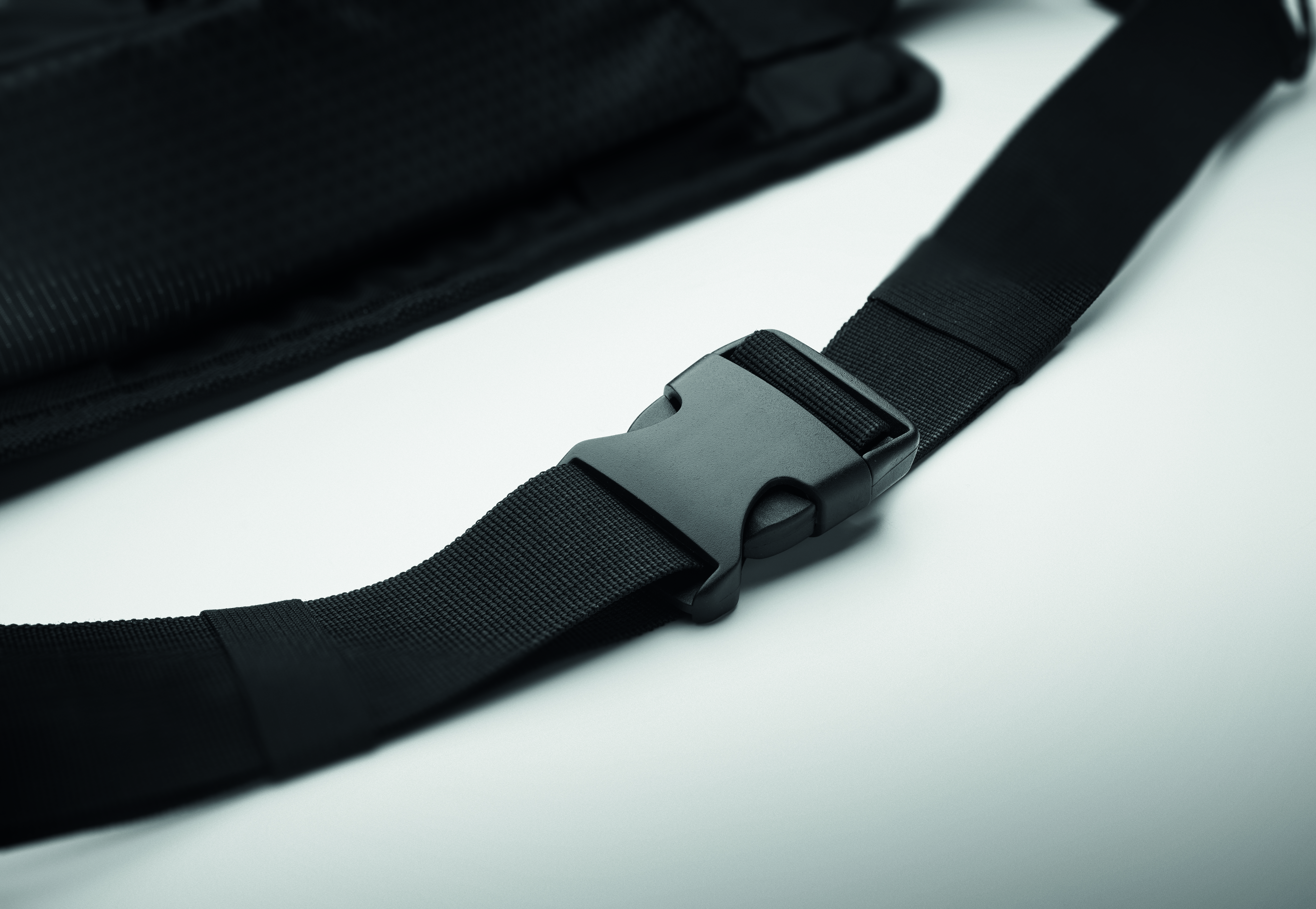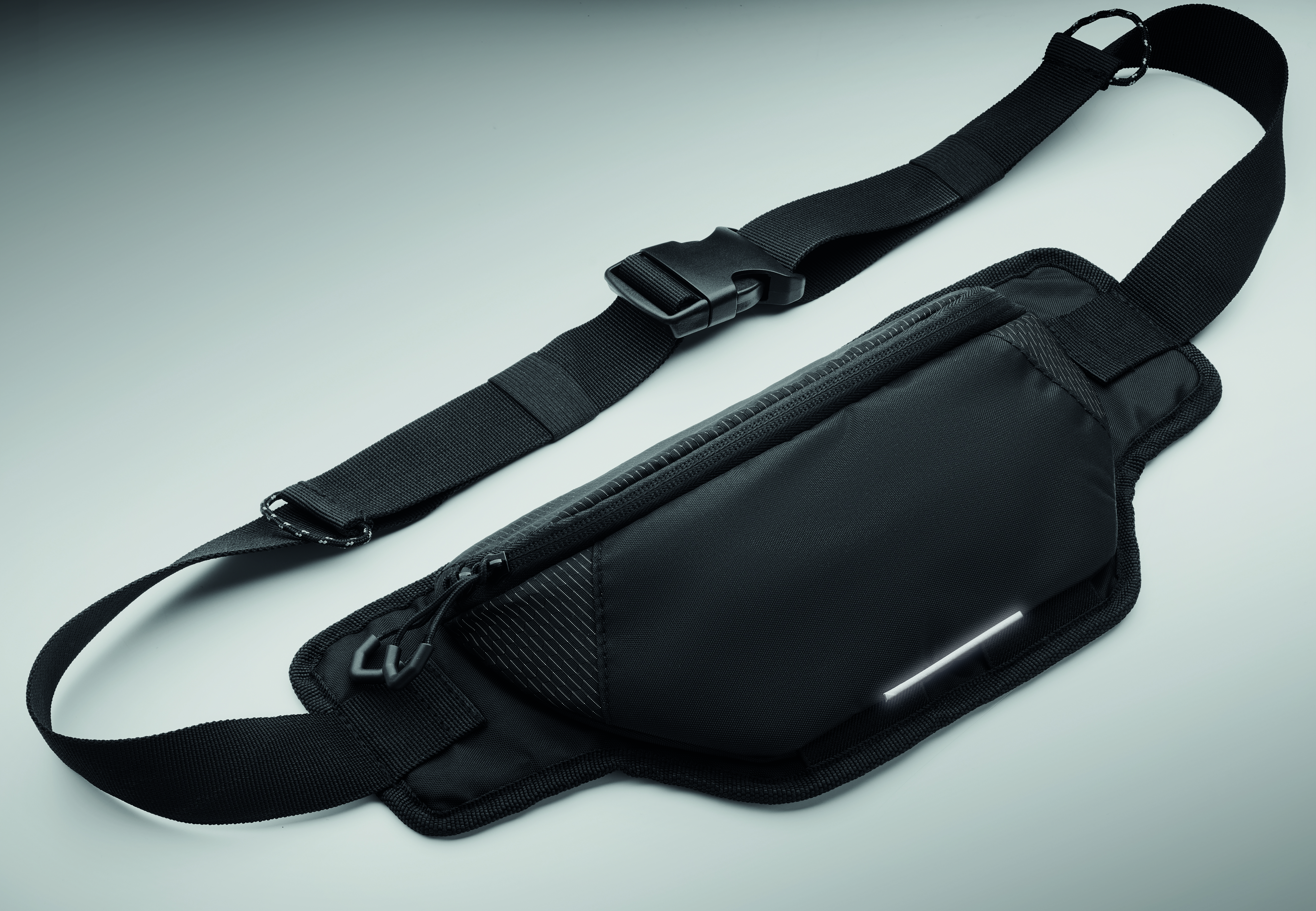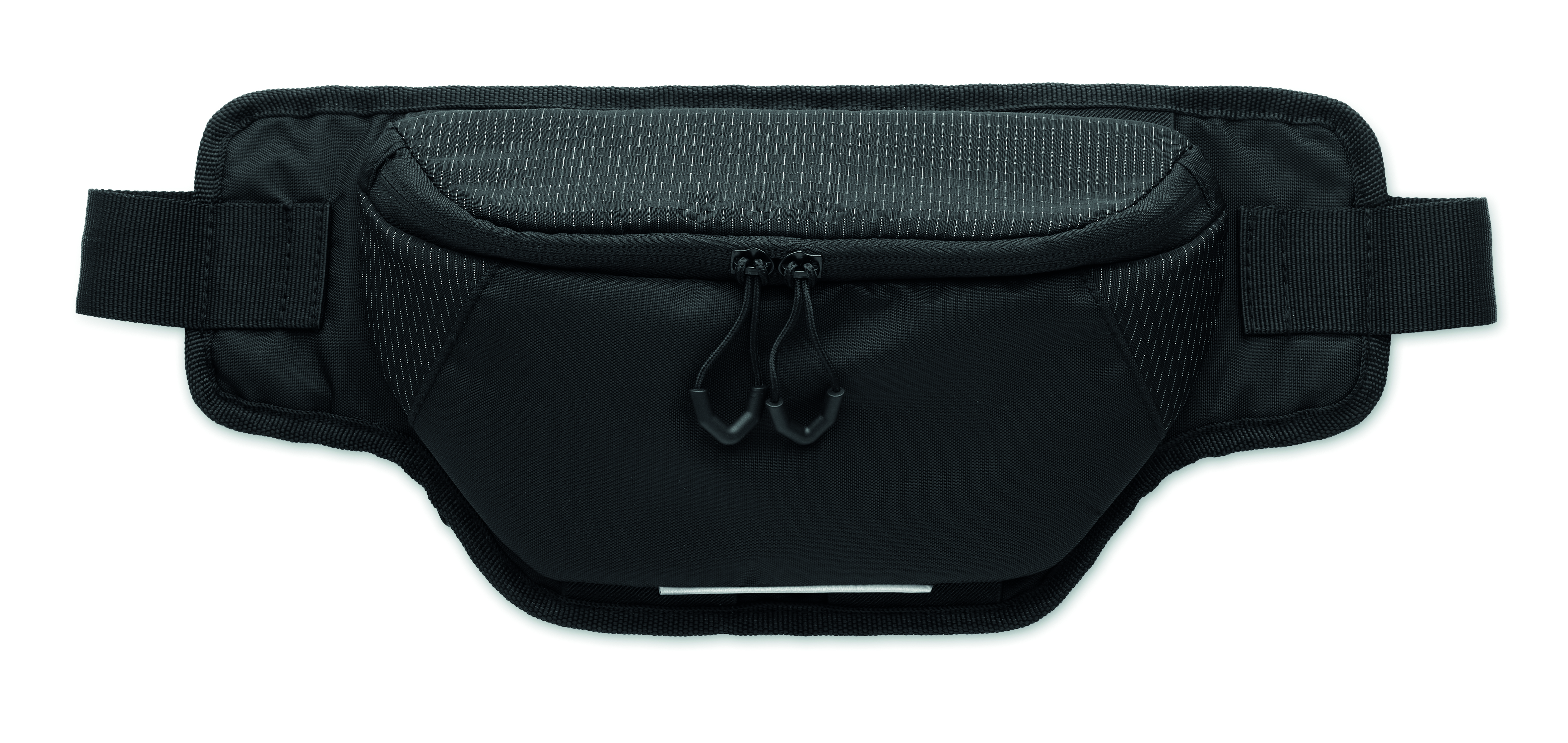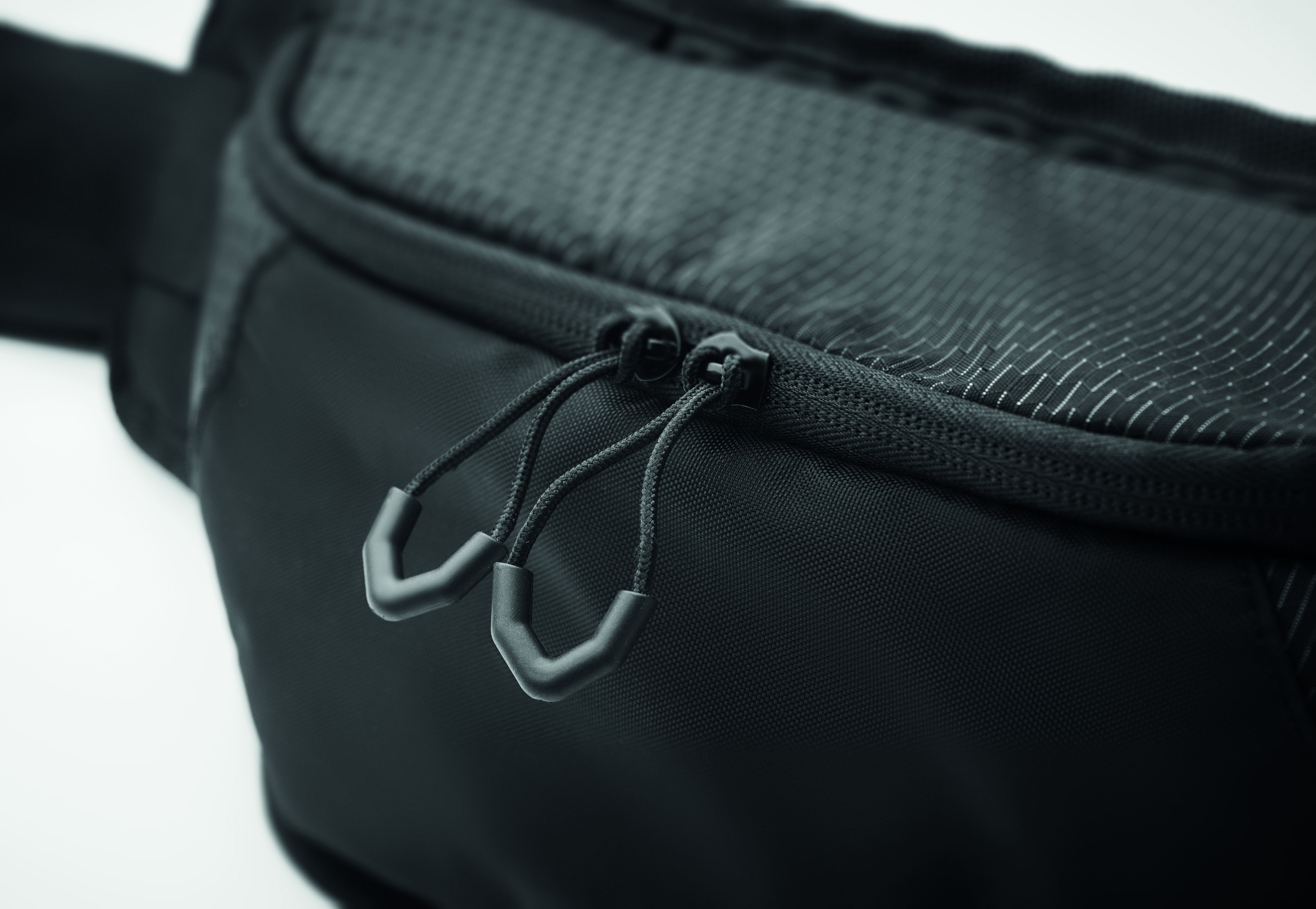 Gürteltasche aus wasserabweisendem 420D-Nylon mit 210D-Polyesterfutter. Reflektierender Streifen. Komplett gepolstertes Hauptfach. Große 2-Wege-Reißverschlussöffnung. Belüftete Rückseite.