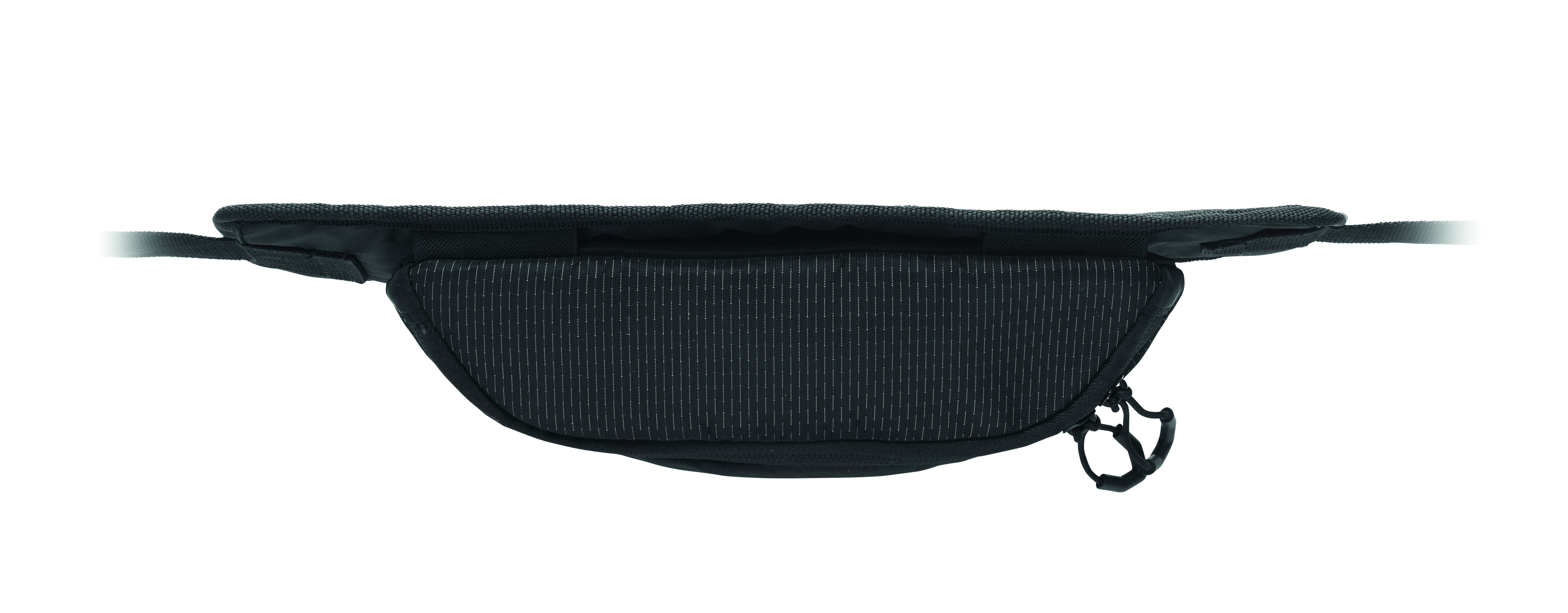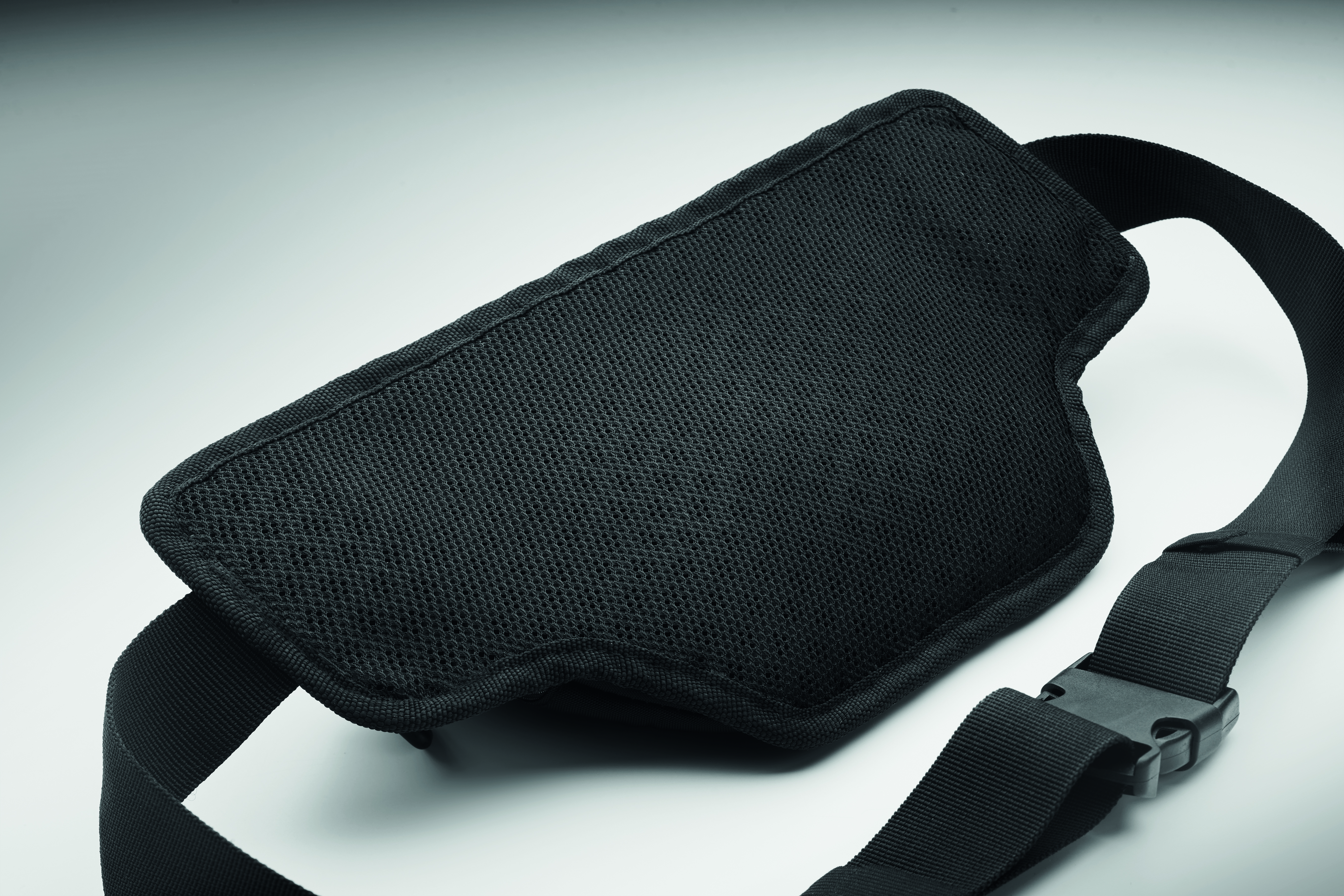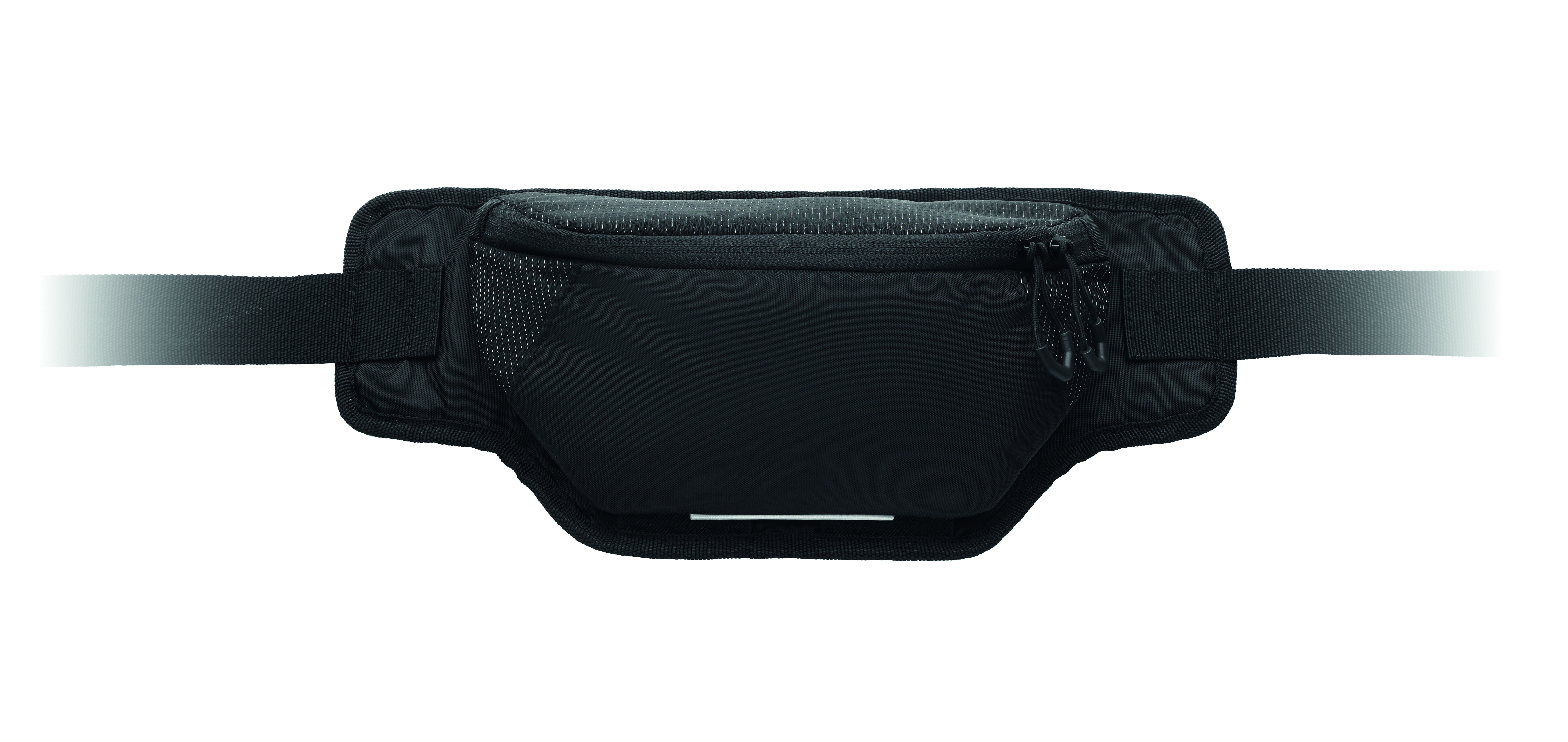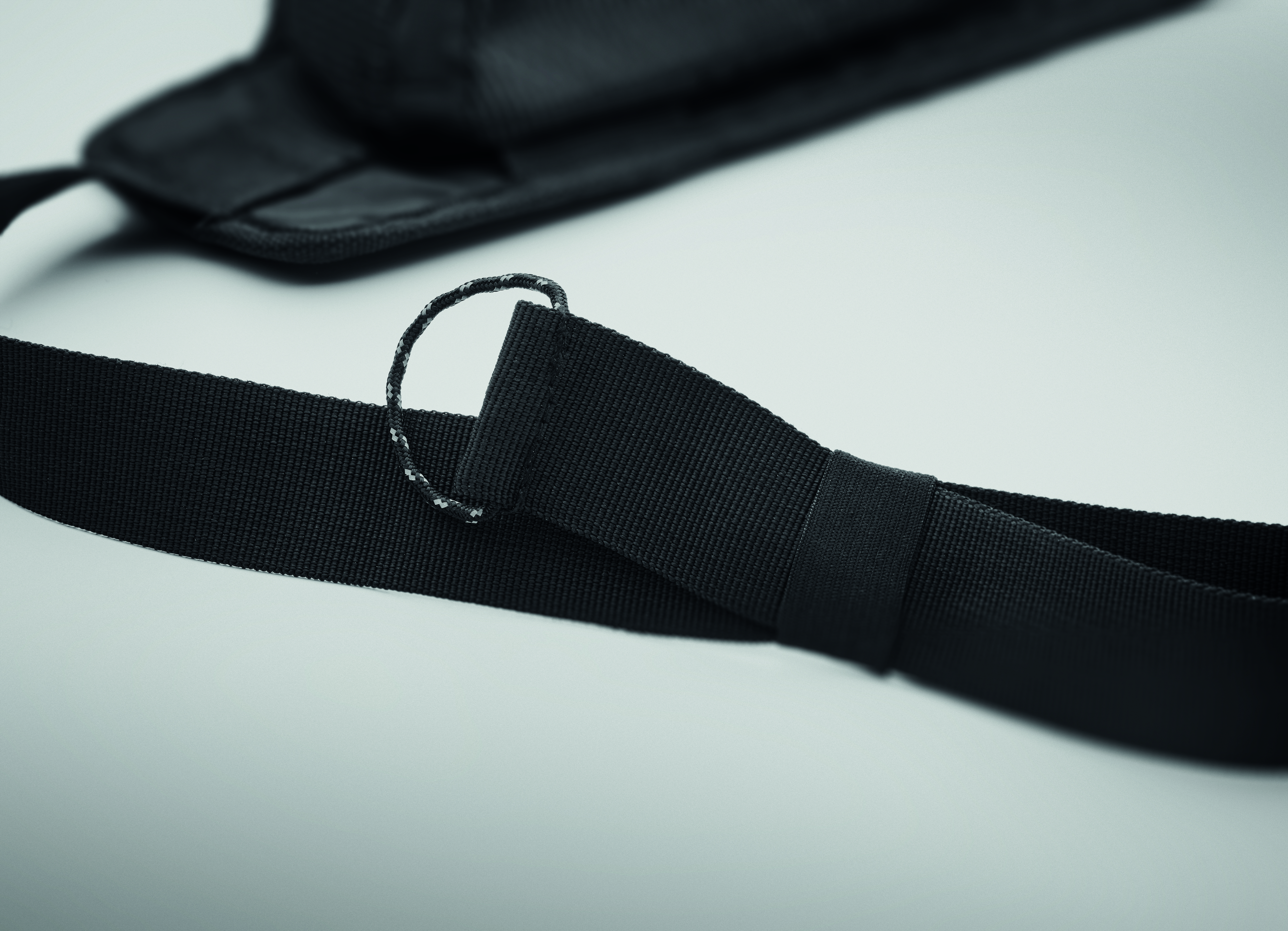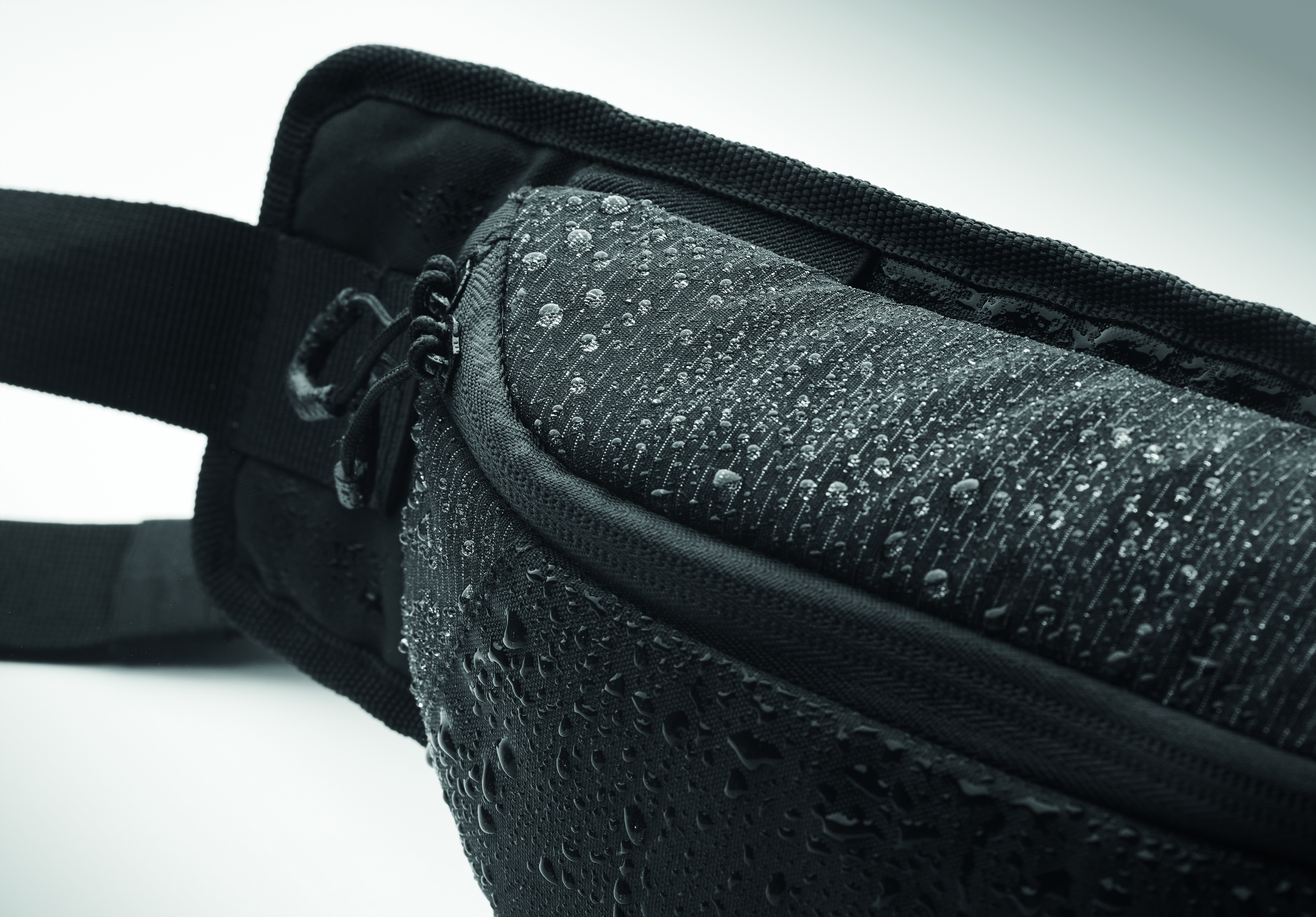 Gürteltasche aus wasserabweisendem 420D-Nylon mit 210D-Polyesterfutter. Reflektierender Streifen. Komplett gepolstertes Hauptfach. Große 2-Wege-Reißverschlussöffnung. Belüftete Rückseite.