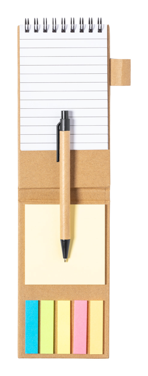 Mit recyceltem Papier überzogener Spiralnotizblock mit 30 linierten Blättern, 25 Haftnotizen und 125 Seitenmarkern (in 5 verschiedenen Farben). Mit Handyhalterfunktion. Inklusive Kugelschreiber aus Recyclingpapier, blauschreibend.