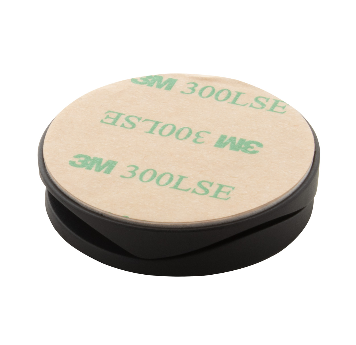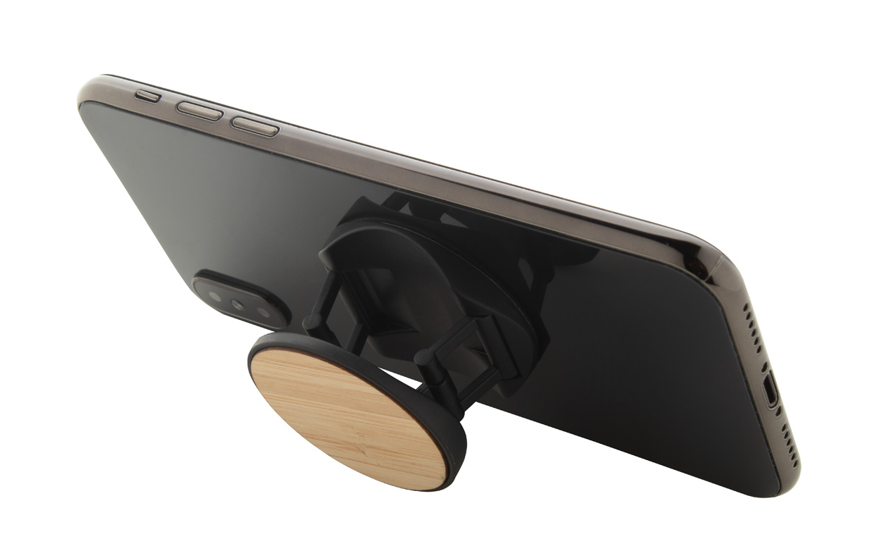 Runder mit Bambus beschichteter Handyhalter aus Kunststoff, mit selbstklebendem Sockel.