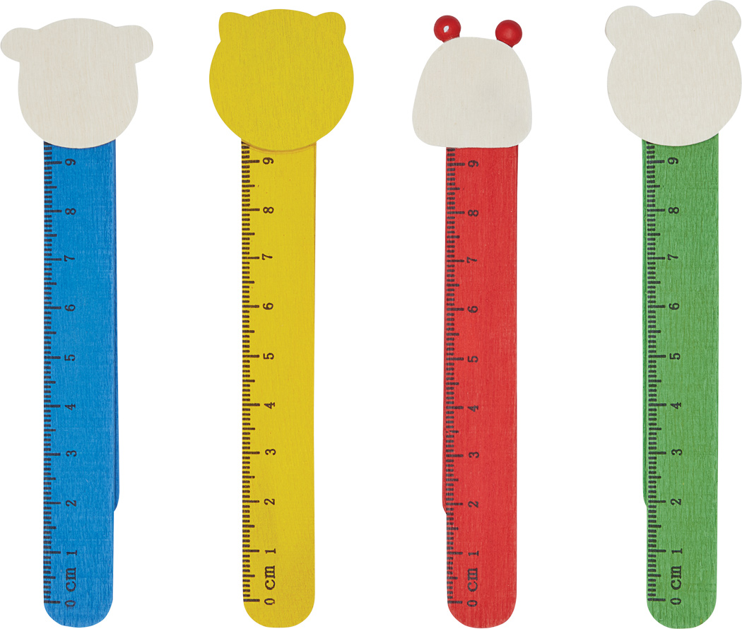 Holz-Lesezeichen FUNNY ANIMALS, 4-fach sortiert: mit lustigen Tierköpfen und Lineal auf der Rückseite der Buchclips