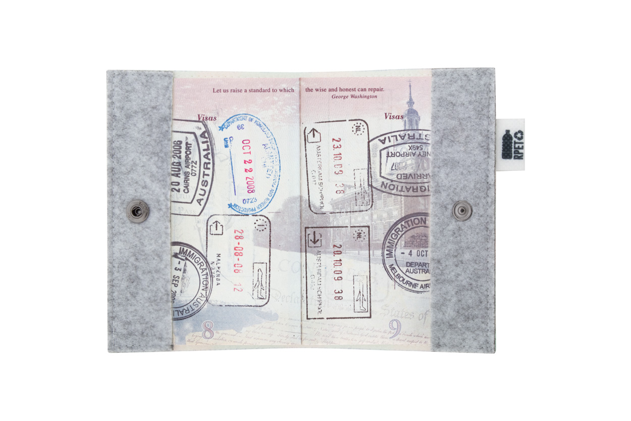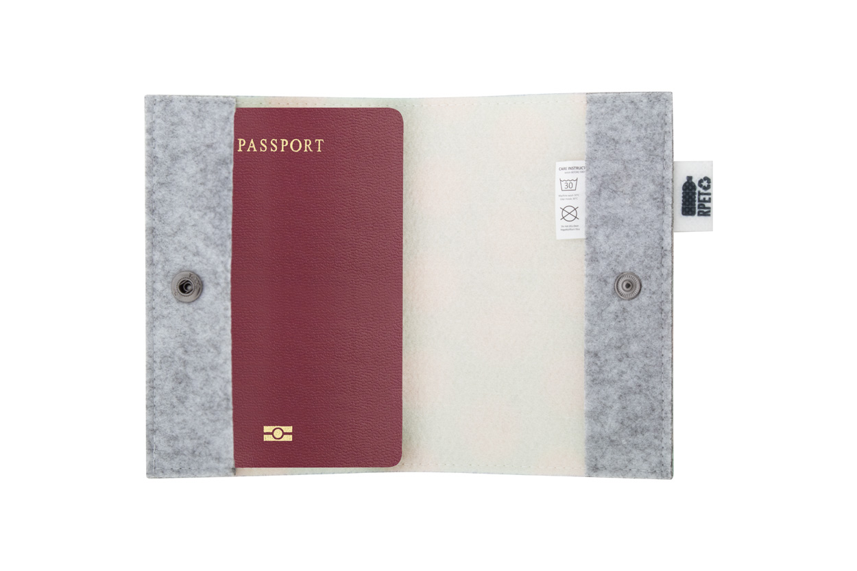 Individuelle Reisepasshülle aus RPET-Filz mit vollfarbig bedrucktem Einband und Druckknopfverschluss. Der Preis beinhaltet den Sublimationsdruck. Mit RPET-Label. Mindestbestellmenge: 50 Stk.