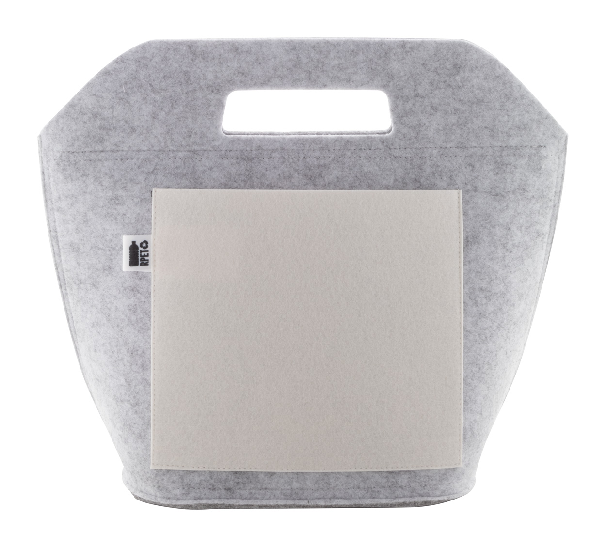 Individuelle RPET-Filz-Kühltasche mit Reißverschluss, Aluminiumpolsterung und vollfarbig bedruckter Vordertasche. Mit gestanzten Griffen. Mit RPET-Label. Der Preis beinhaltet den Sublimationsdruck. Mindestmenge: 25 Stk.
