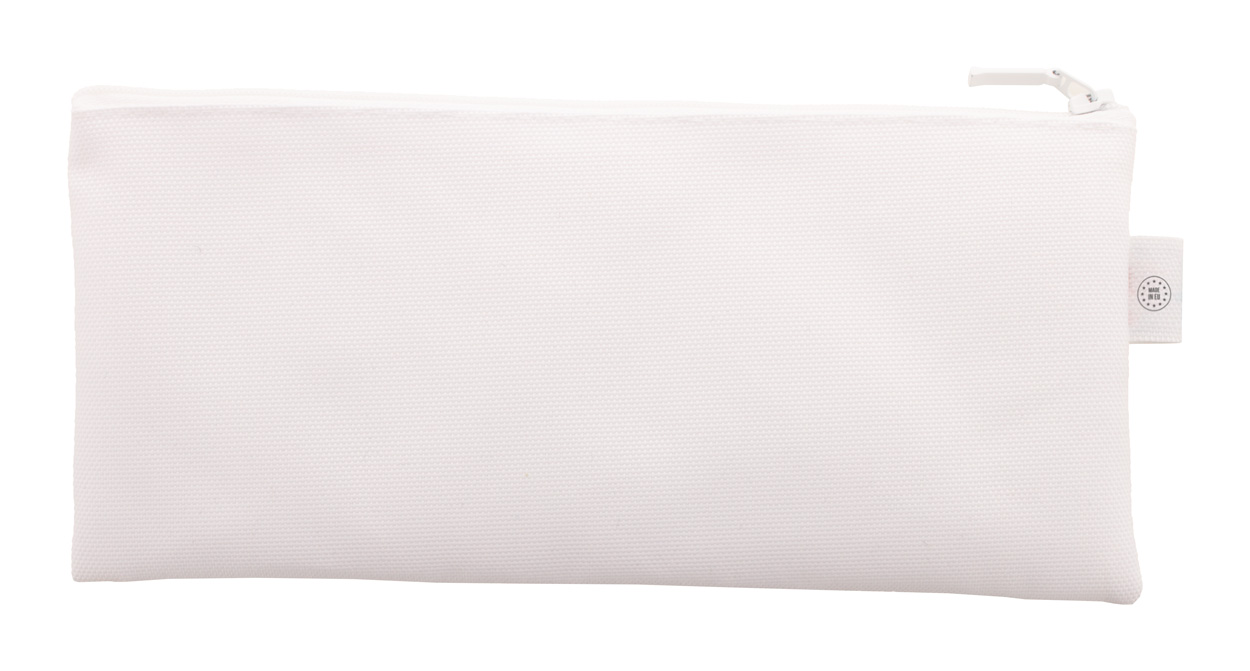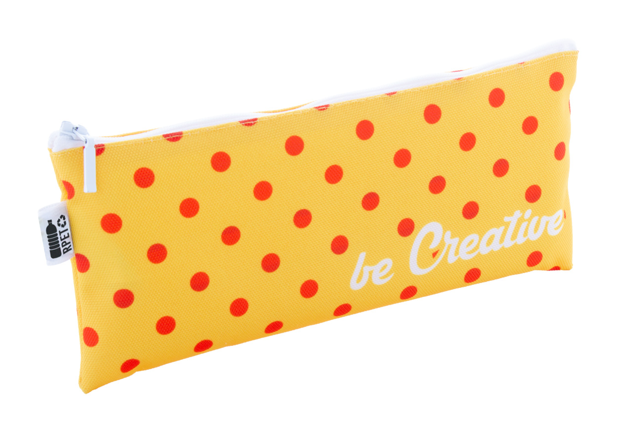 Individuelle Reißverschluss-Stiftetasche aus 600D RPET Polyester mit vollflächigem Sublimationsdruck und RPET-Label. Mindestmenge: 50 Stk.