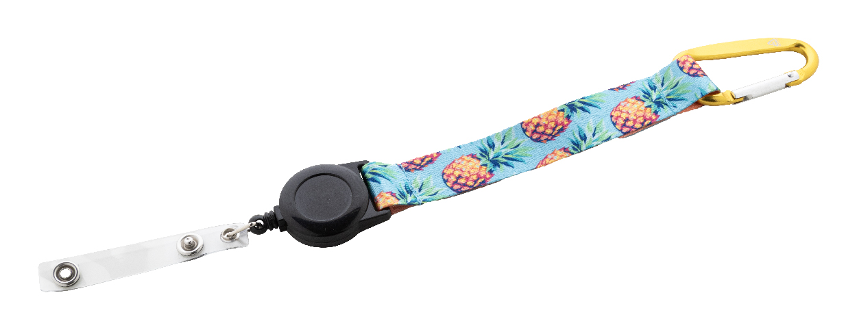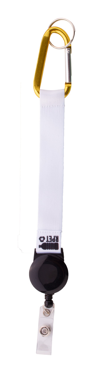 Individueller Schlüsselanhänger aus RPET-Polyester mit ausziehbarem Ausweishalter, Aluminiumkarabiner und Schlüsselring aus Metall. Preis inkl. Sublimationsdruck auf beiden Seiten sowie RPET-Label. Mindestmenge: 100 Stk.